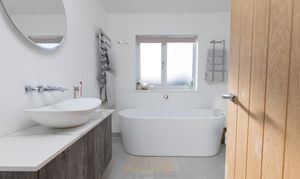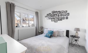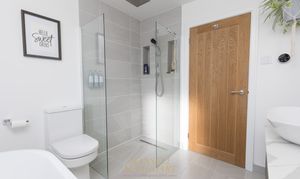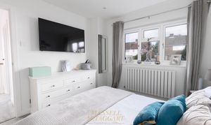 Stairs rise from the entrance hall to the first-floor landing, where there is access to the loft and a useful airing cupboard. The accommodation upstairs is well balanced, offering two generous double bedrooms and a further single bedroom — ideal as a child’s room, nursery, or home office. Both double bedrooms provide ample space for freestanding furniture and comfortably accommodate king-size beds. The family bathroom is finished to a contemporary standard and comprises a stylish bath with Manual or App controlled Mira bath filler & Shower control, WC, wash hand basin with double storage beneath, a separate walk-in shower with frameless glass and modern fittings, recessed spotlights, and a heated towel rail.