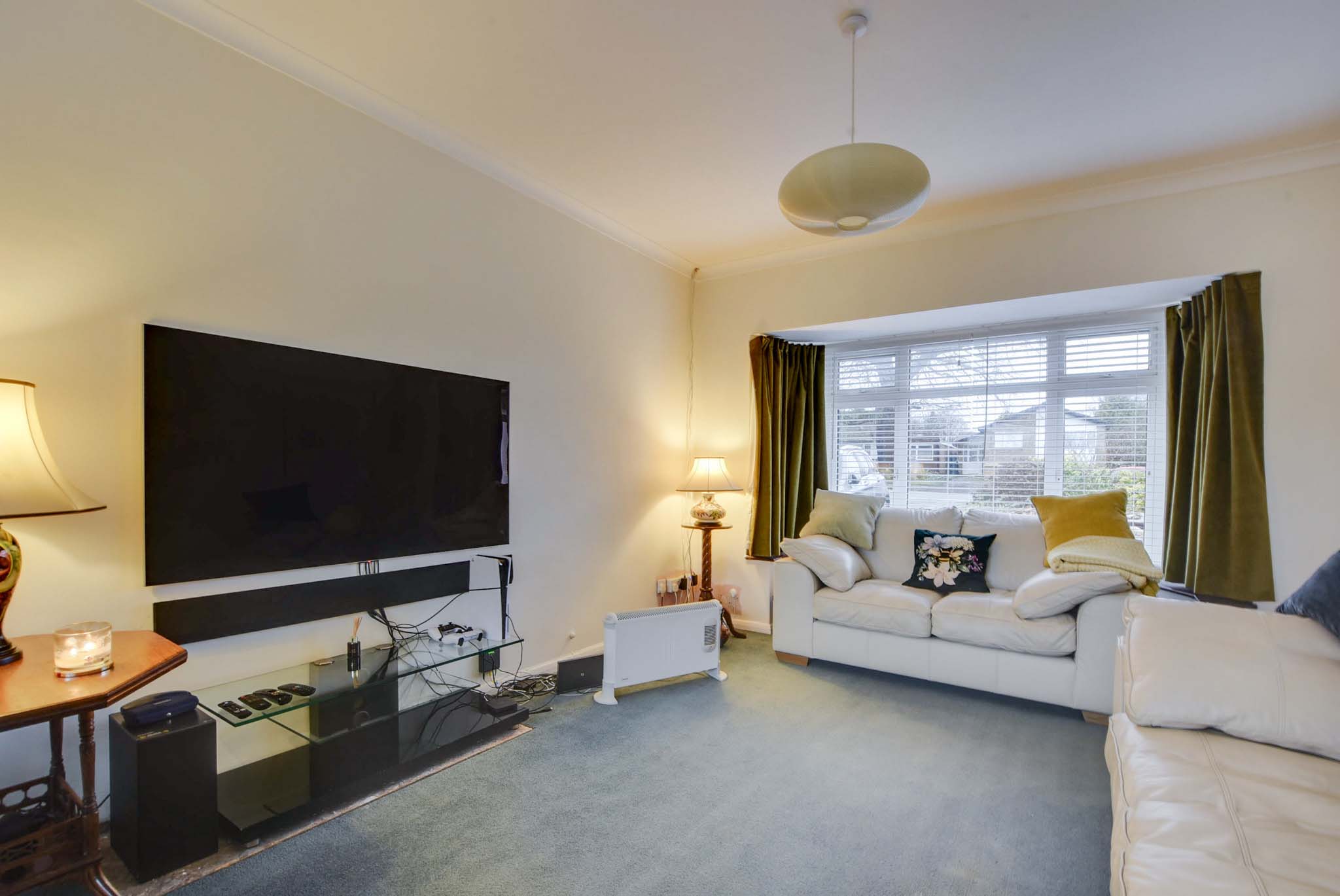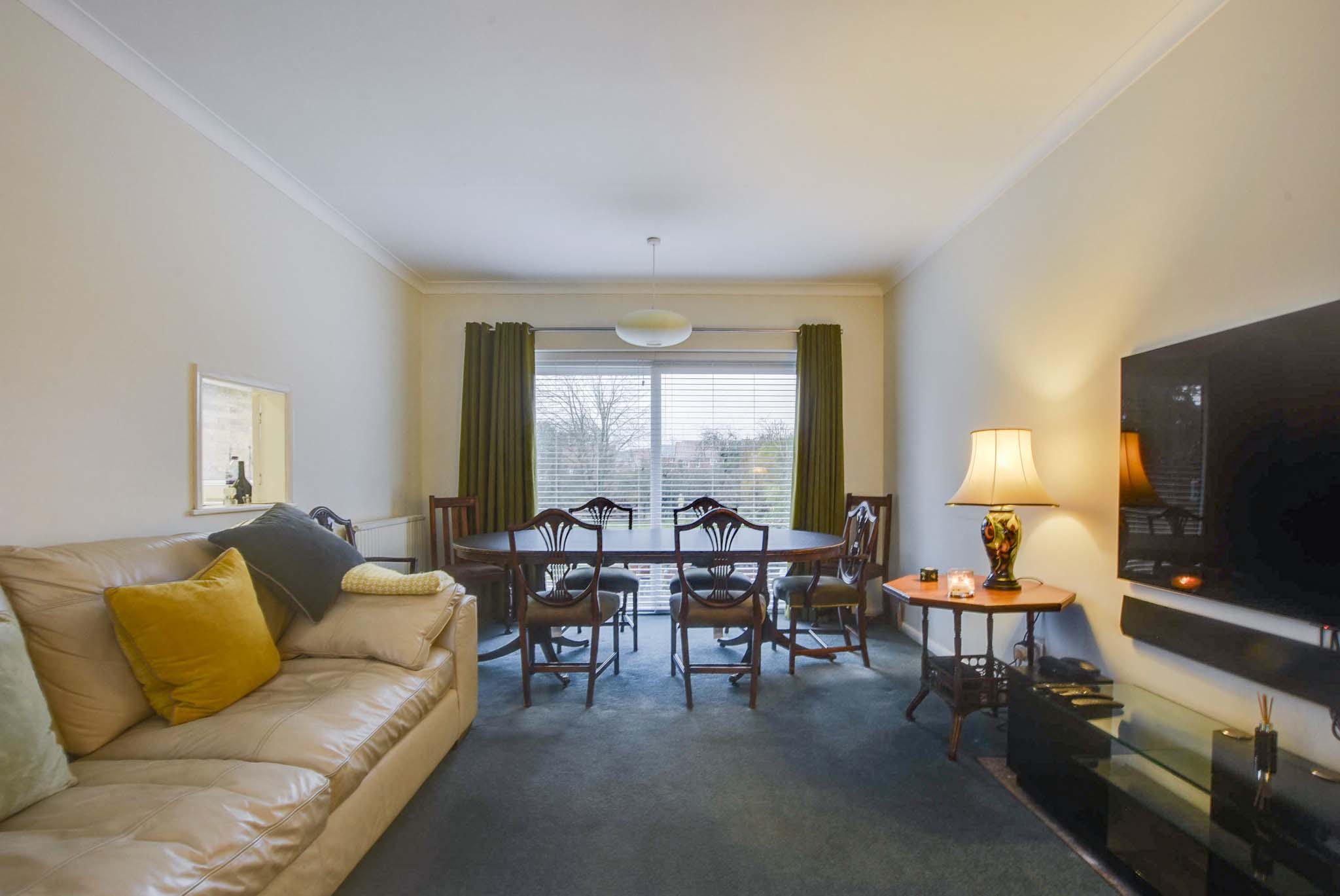 With a double-glazed bay window to the front elevation, double-glazed patio doors to the rear elevation, carpet flooring, a serving hatch to the kitchen, and three radiators.