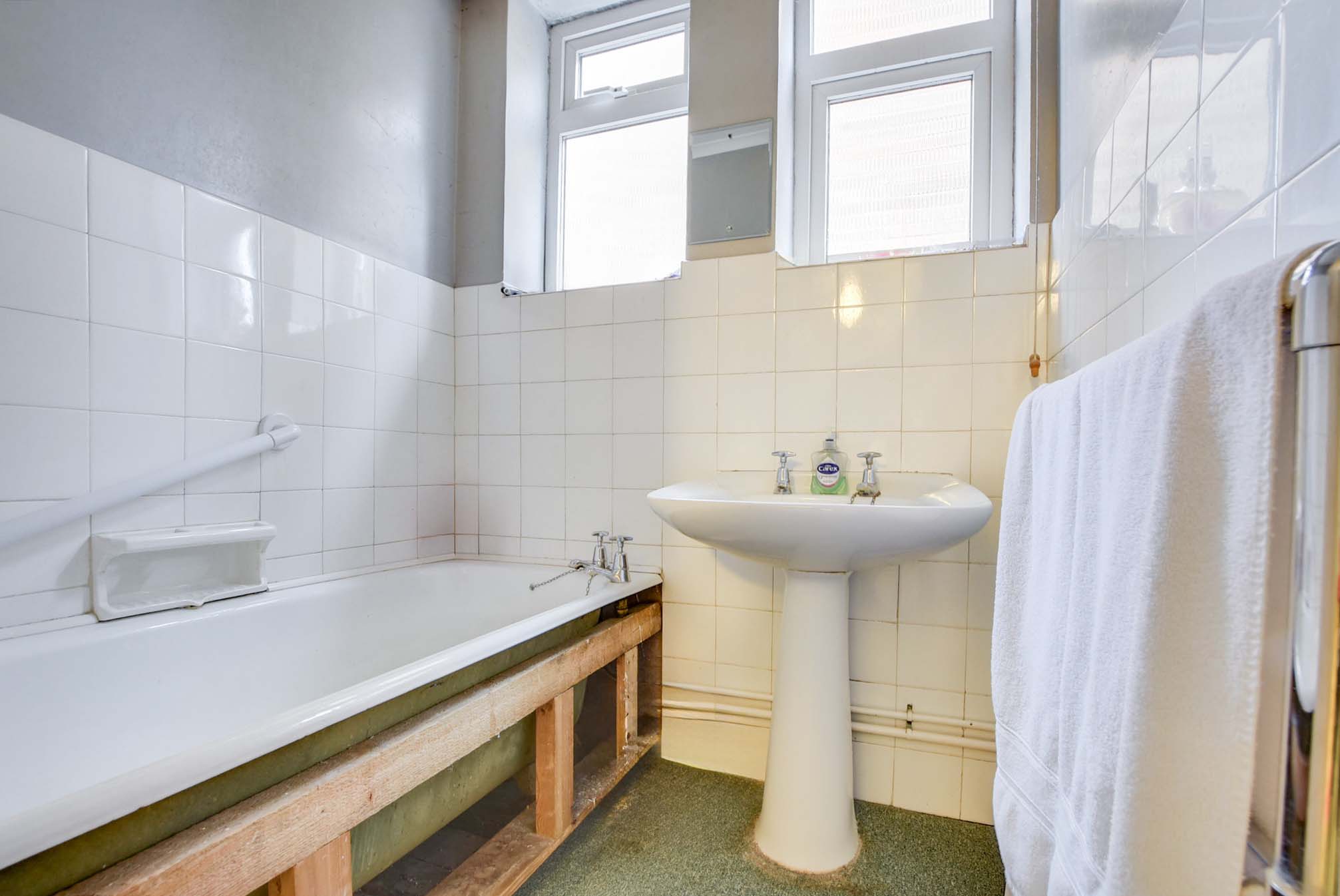 With two double-glazed windows to the side, a bath, a handwash basin, a carpet, and a towel rail over a radiator.