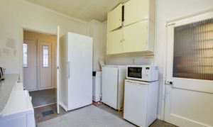 With a double-glazed window to the rear elevation, a serving hatch to the lounge, tiled floor, a sink and drainer unit with a range of wall and base units with work surfaces over, and a radiator.