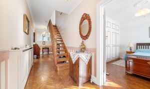 To the first floor the property benefits from a spacious landing and two double bedrooms, both with ensuite shower enclosures, heated towel rails, Velux windows, eaves storage and a range of fitted wardrobes and storage cupboards. Other features to note, solid wood parquet flooring, picture rails & coving, double glazing & gas central heating.