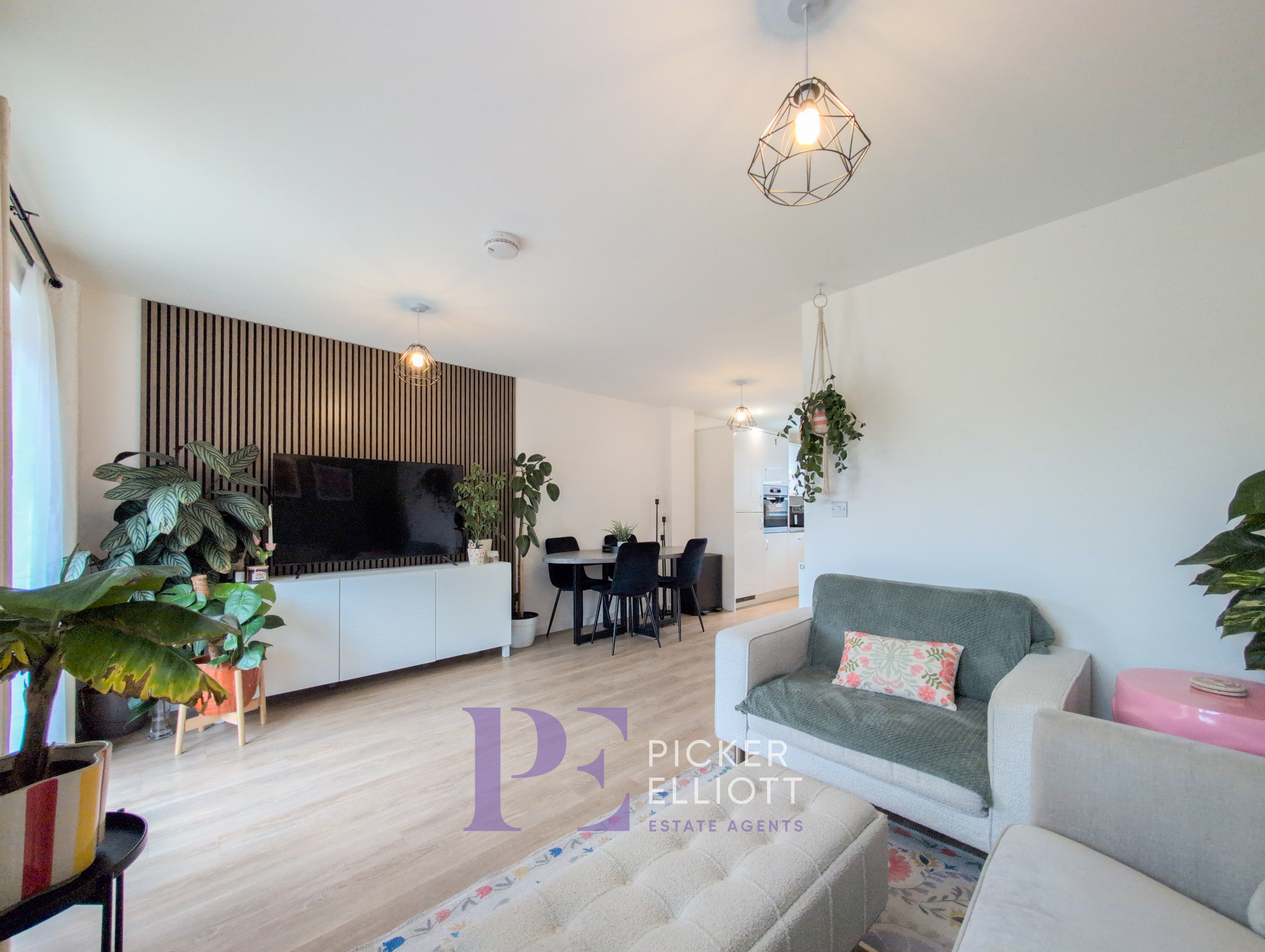 Upon entering, you are greeted by a welcoming entrance hall with stylish wood effect flooring. The ground floor boasts a convenient WC and a superb open-plan kitchen and dining area, complete with gloss white units and a range of integrated appliances. The spacious lounge is bathed in natural light, featuring French doors that open out to the private rear garden.