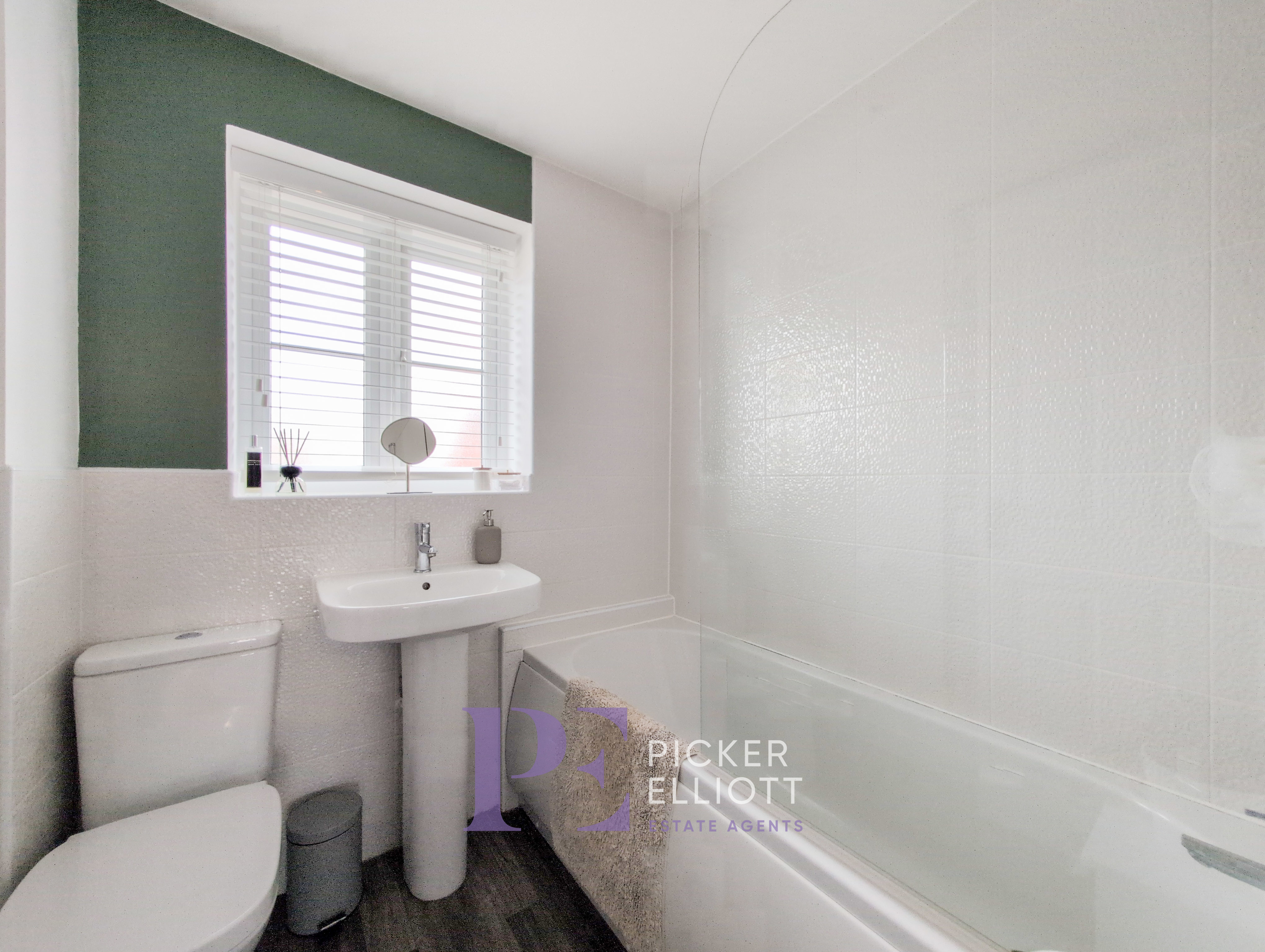 Having wood effect linoleum flooring, a low-level button flush toilet, pedestal wash basin, and a bath with mains shower. There is also a centrally heated chrome effect towel rail, shaver socket, a upvc double glazed window with frosted glass, and a ceiling mounted extractor.