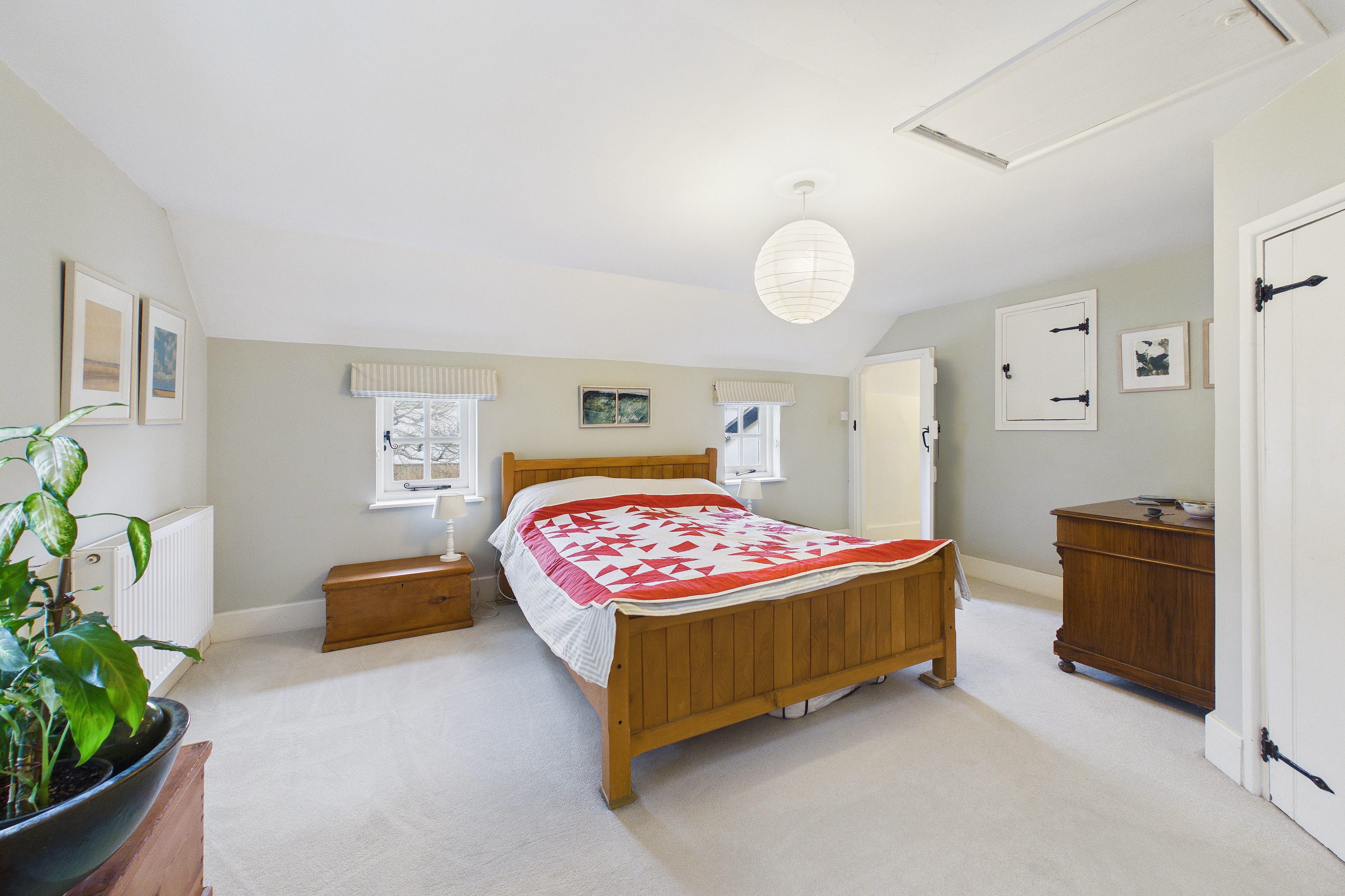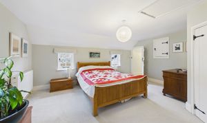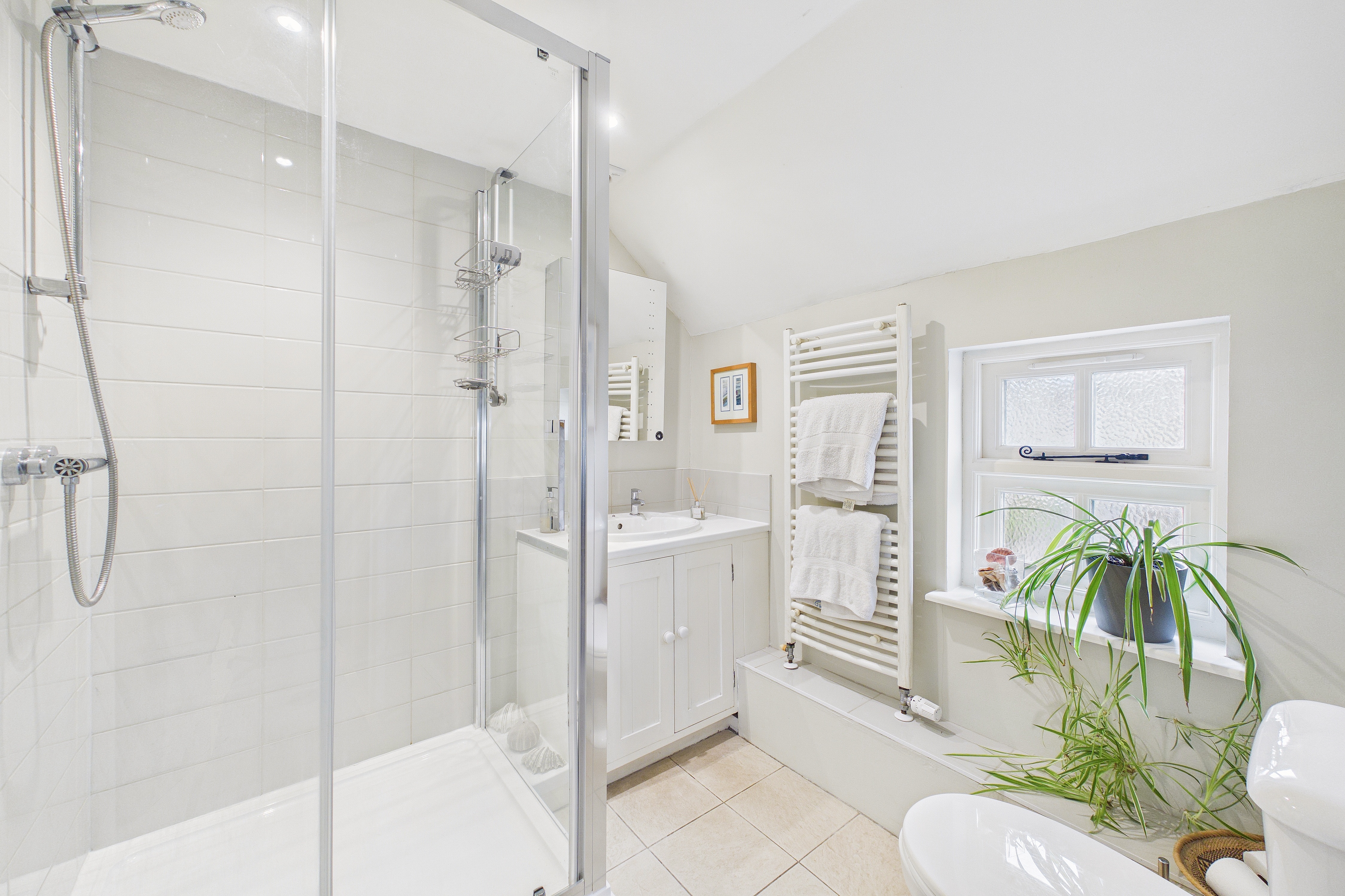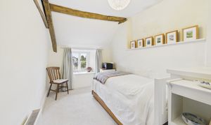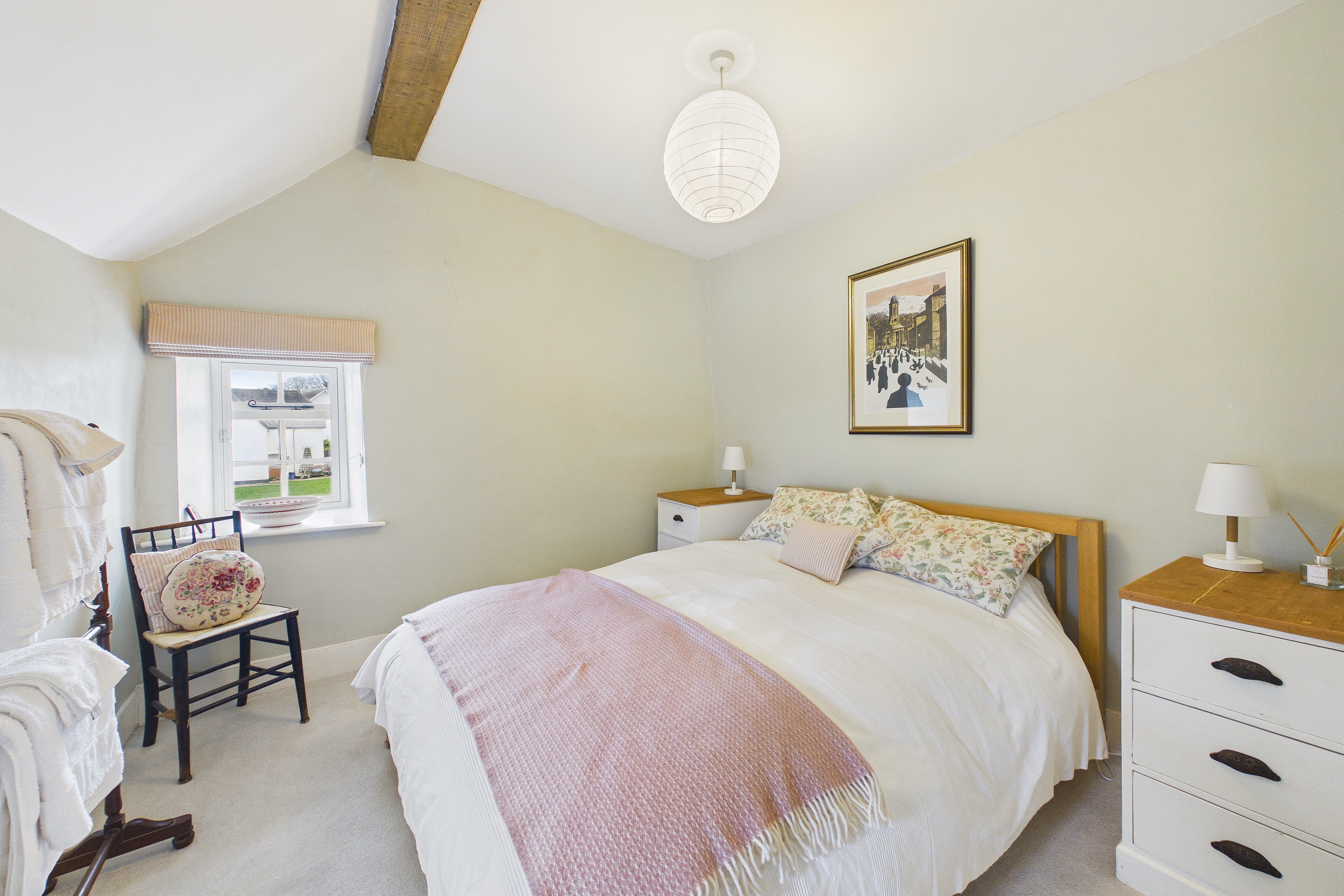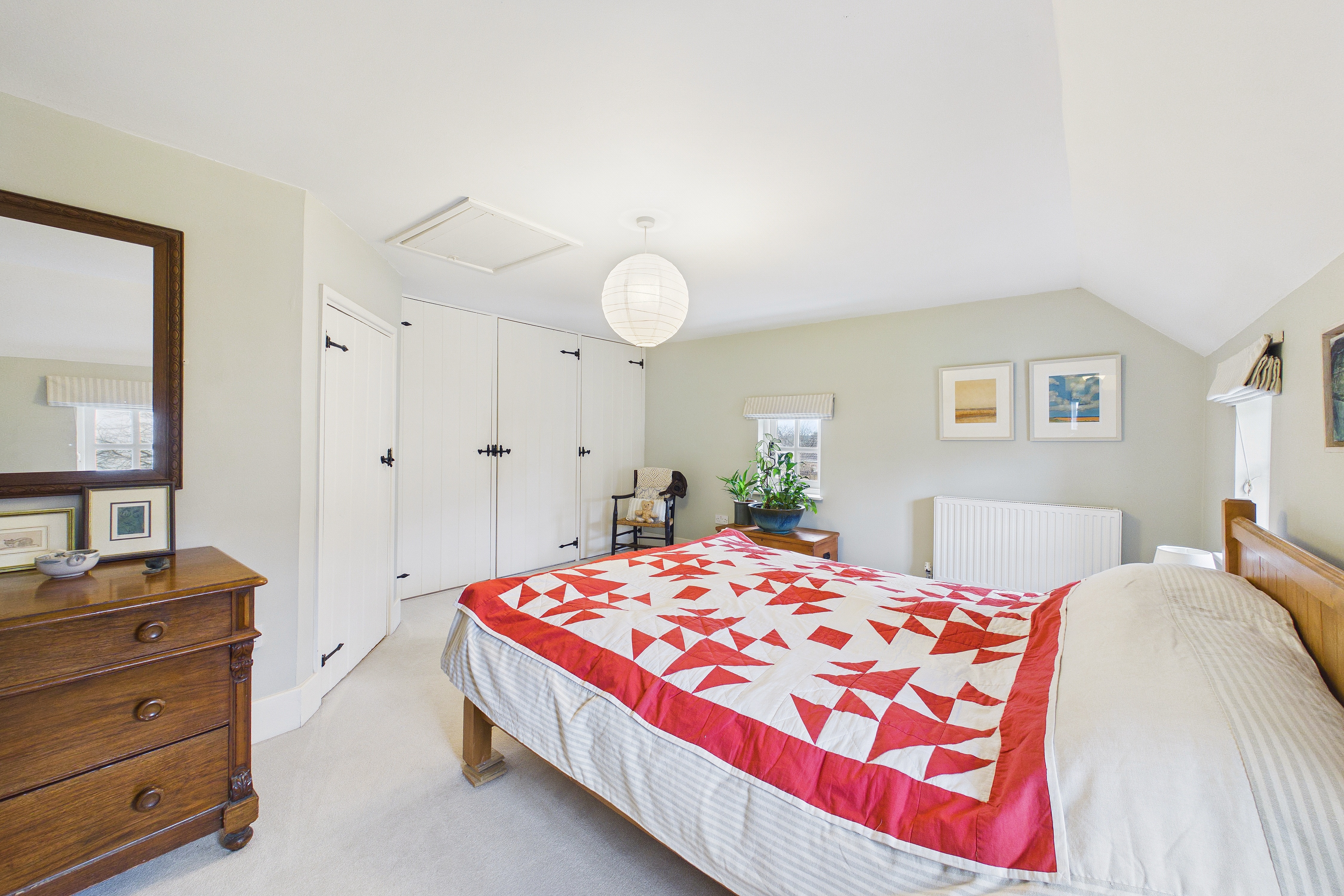 Upstairs, the principal bedroom is particularly spacious, with fitted wardrobes and an en-suite shower room. There are three further bedrooms—two well-sized singles and an additional double—offering flexibility for family, guests or workspace. The main bathroom includes a bath with shower over. Despite its age, the cottage feels notably light and airy, with good natural light throughout.