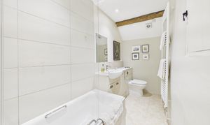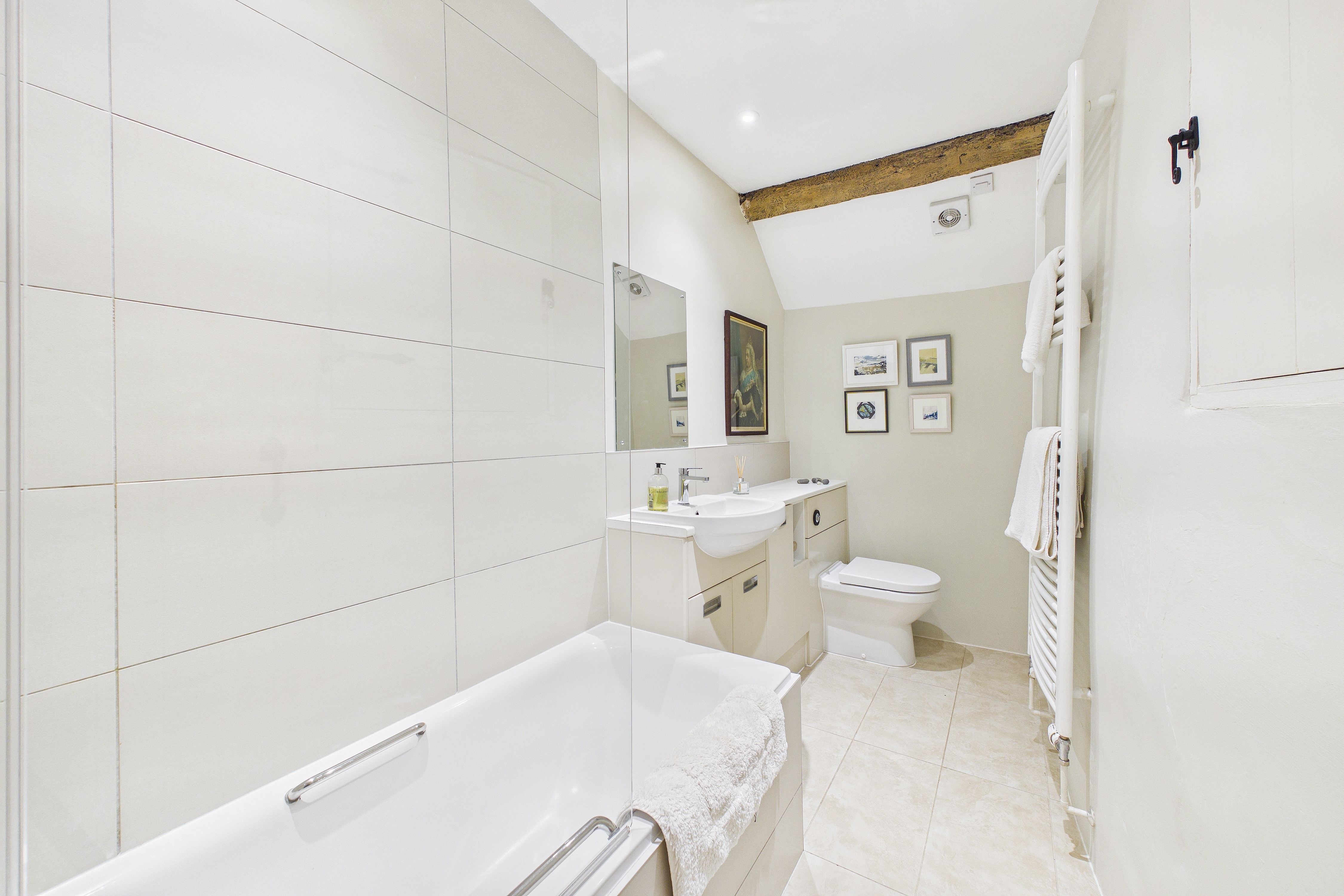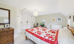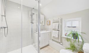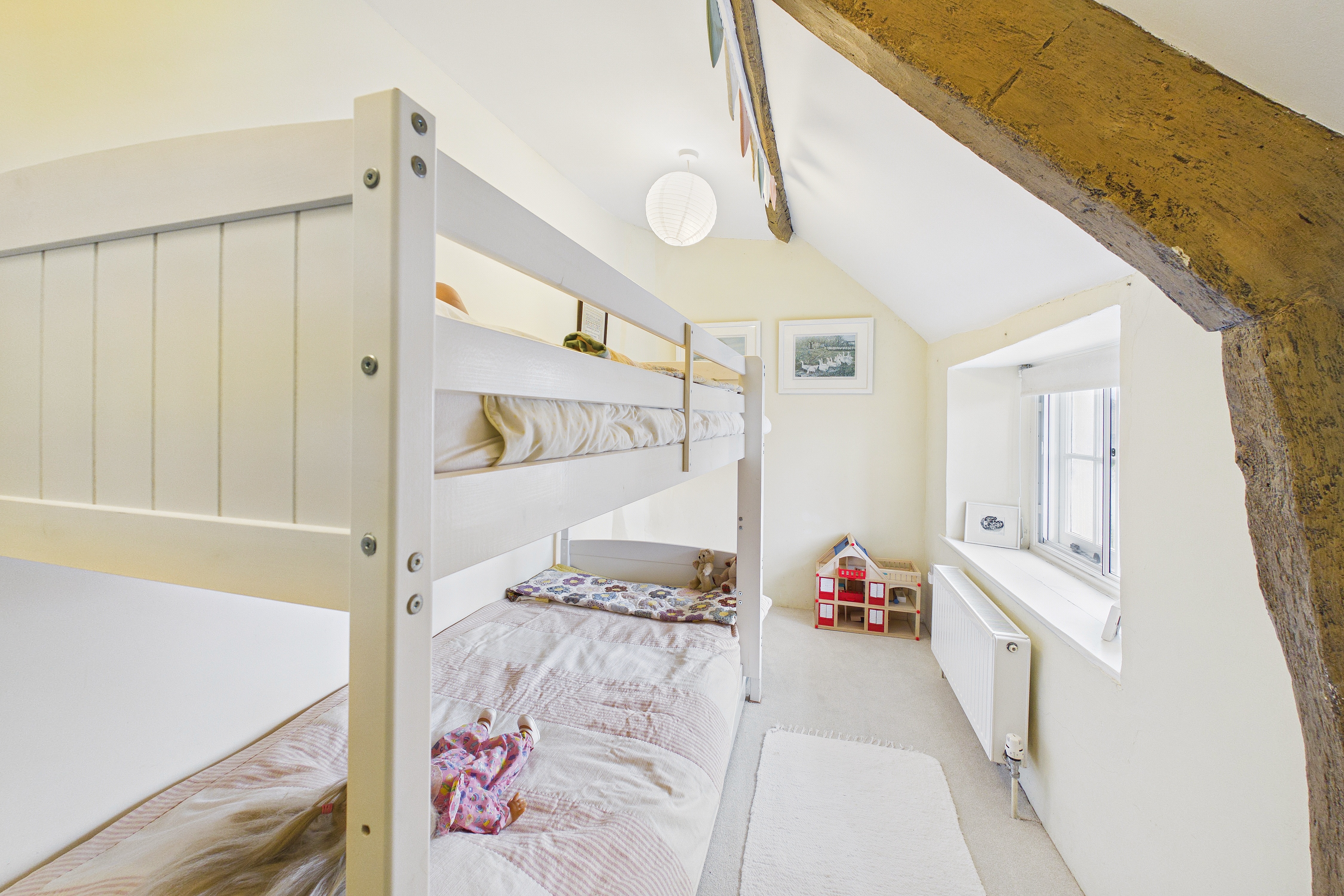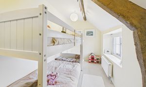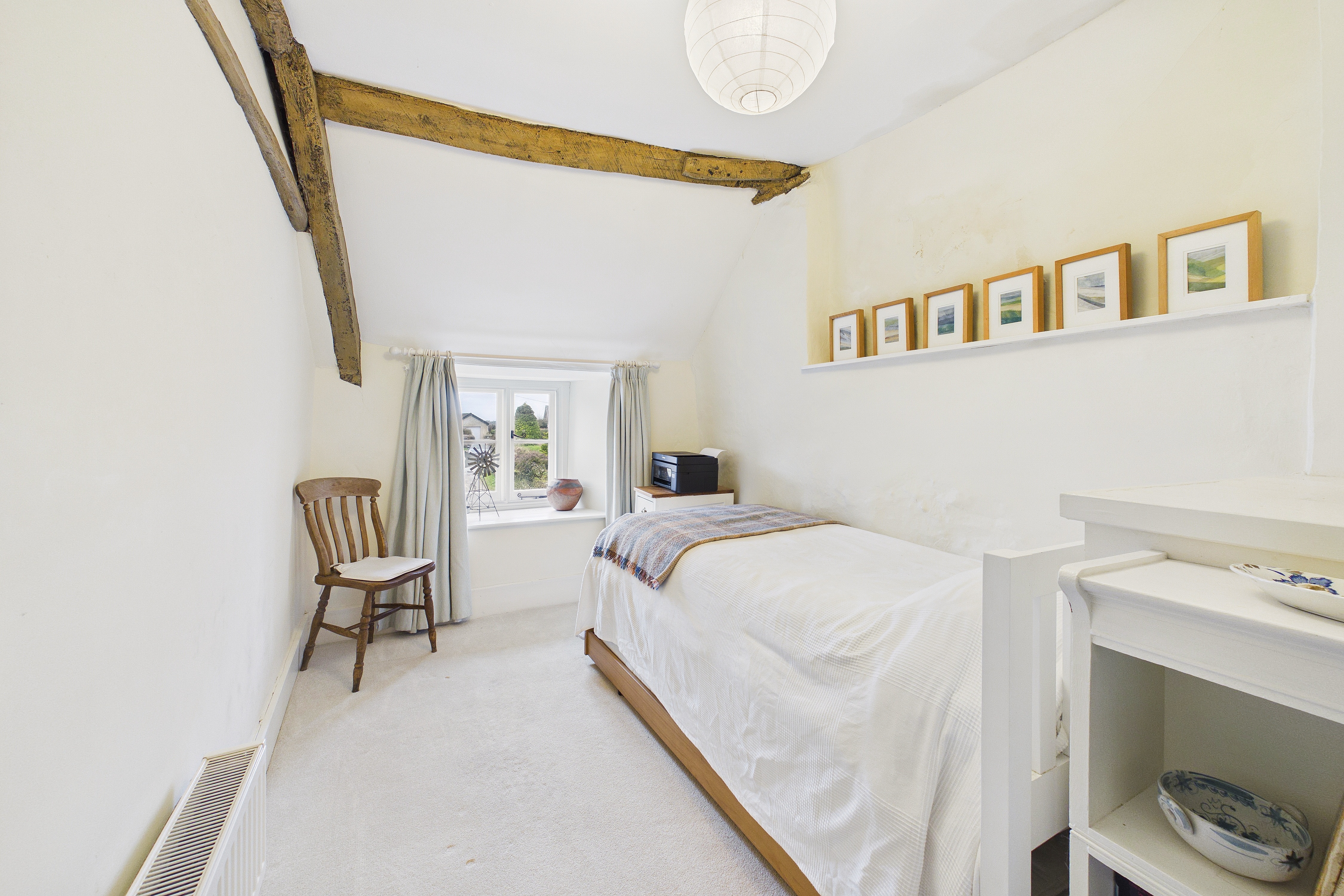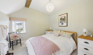 Upstairs, the principal bedroom is particularly spacious, with fitted wardrobes and an en-suite shower room. There are three further bedrooms—two well-sized singles and an additional double—offering flexibility for family, guests or workspace. The main bathroom includes a bath with shower over. Despite its age, the cottage feels notably light and airy, with good natural light throughout.
