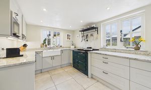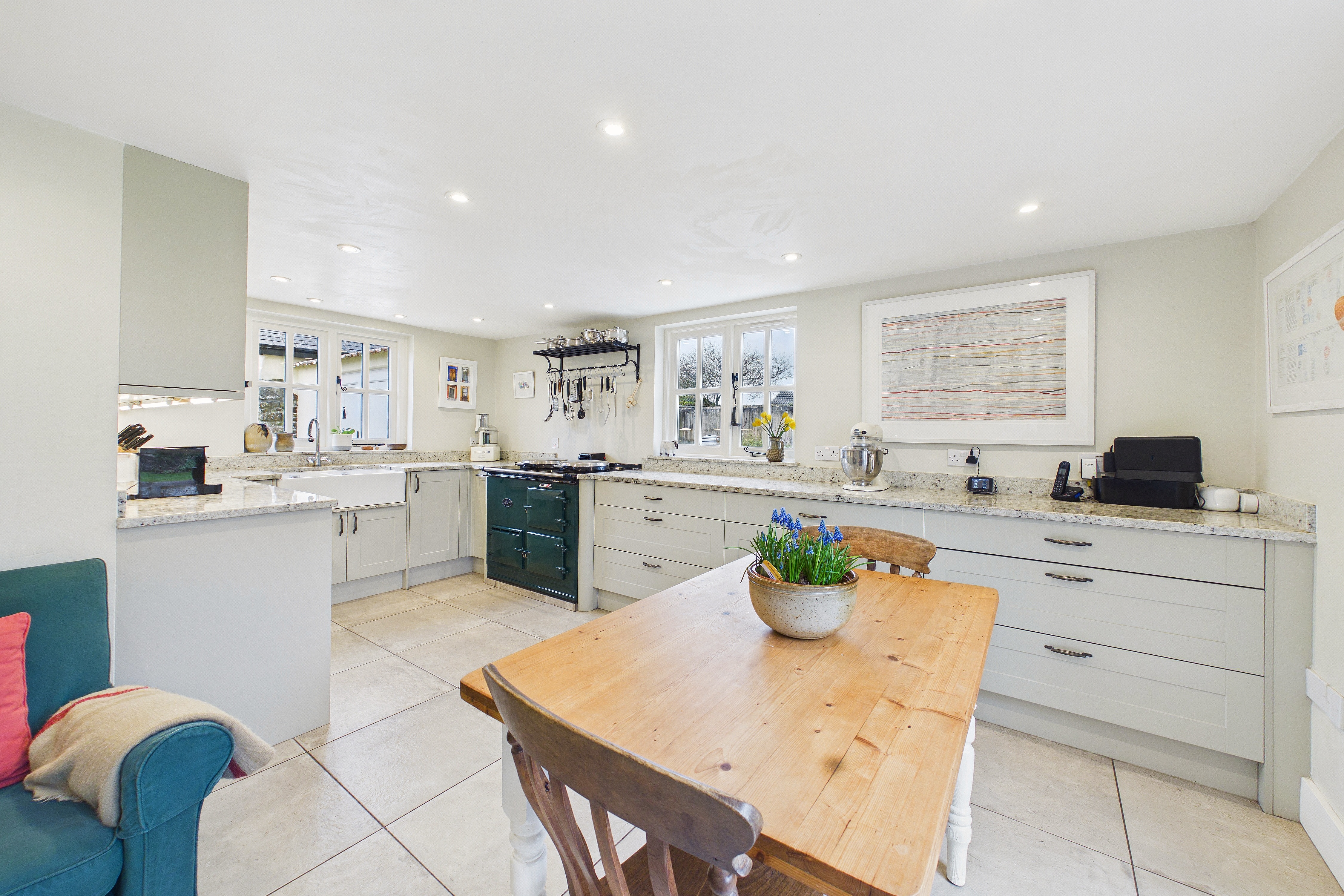 The kitchen/breakfast area is designed for everyday use, with granite worktops, a gas Aga, integrated dishwasher and built-in bins. Doors open directly to the garden, making it easy to move between inside and out. A separate dining room with solid oak flooring provides additional space for gatherings, and a useful pantry offers excellent storage for food and household essentials. A downstairs WC completes the ground floor.