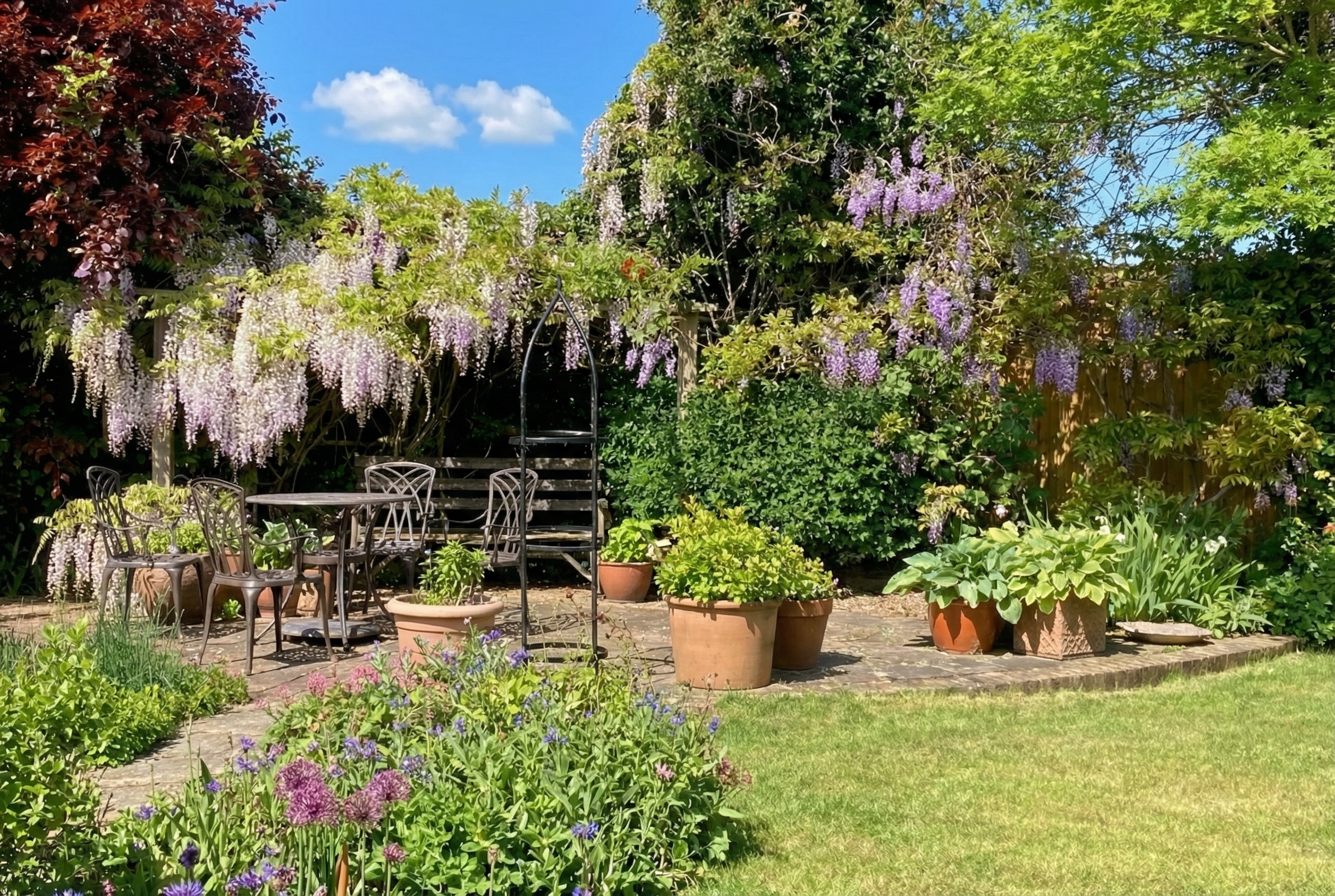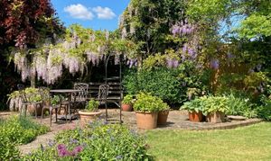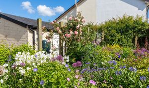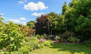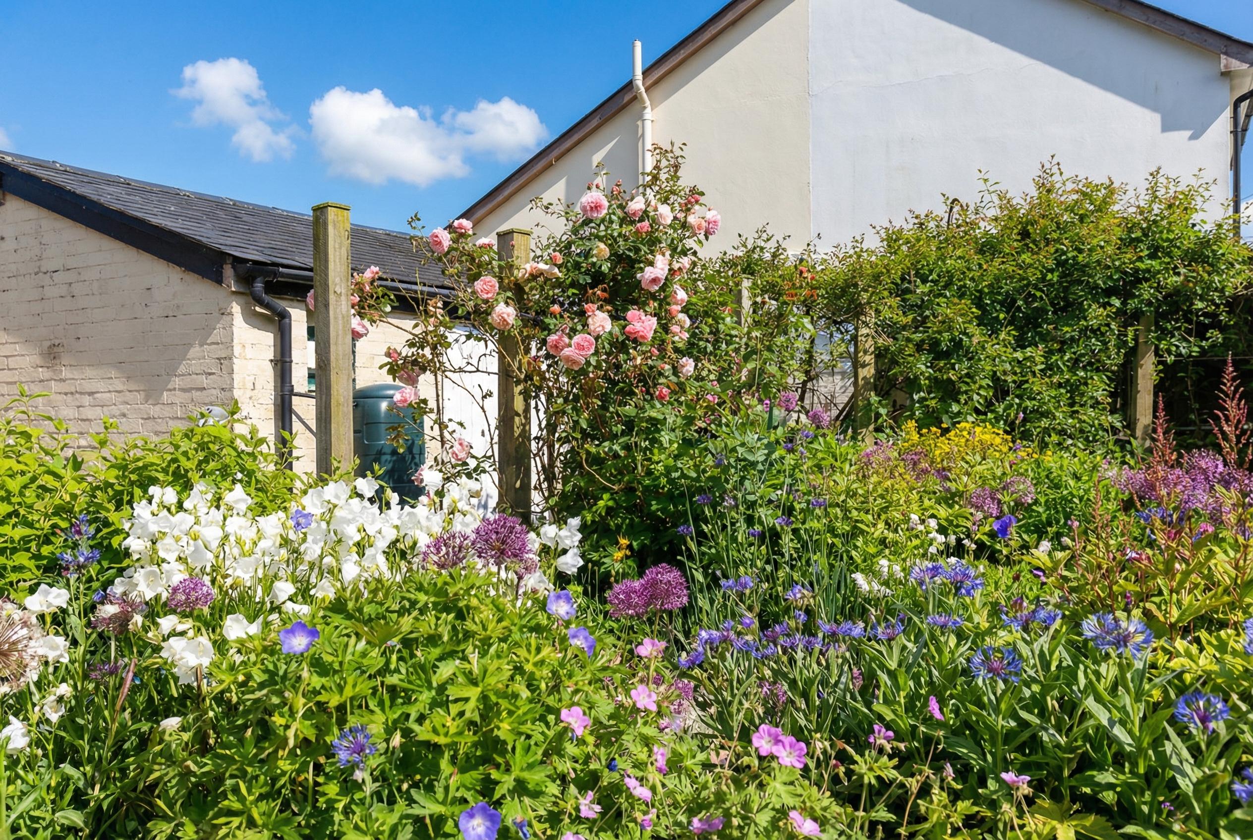 Outside, there is parking to the front for up to four vehicles as well as a garage. The garden is thoughtfully arranged in a traditional cottage style, with established planting, a wide variety of flowers, shrubs and trees, and neatly kept borders. Raised beds provide space for vegetables or further planting. A pergola-covered patio creates a sheltered area for outdoor dining.