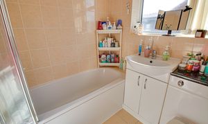 Side facing upvc window, three piece suite, heated towel rail, over bath shower, tiled walls and flooring.