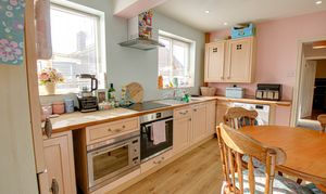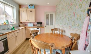 Extended Kitchen with two side facing upvc windows, fitted range of base and wall units with Neff oven, hob, integral fridge and freezer. Laminate flooring, radiator and rear facing upvc door.