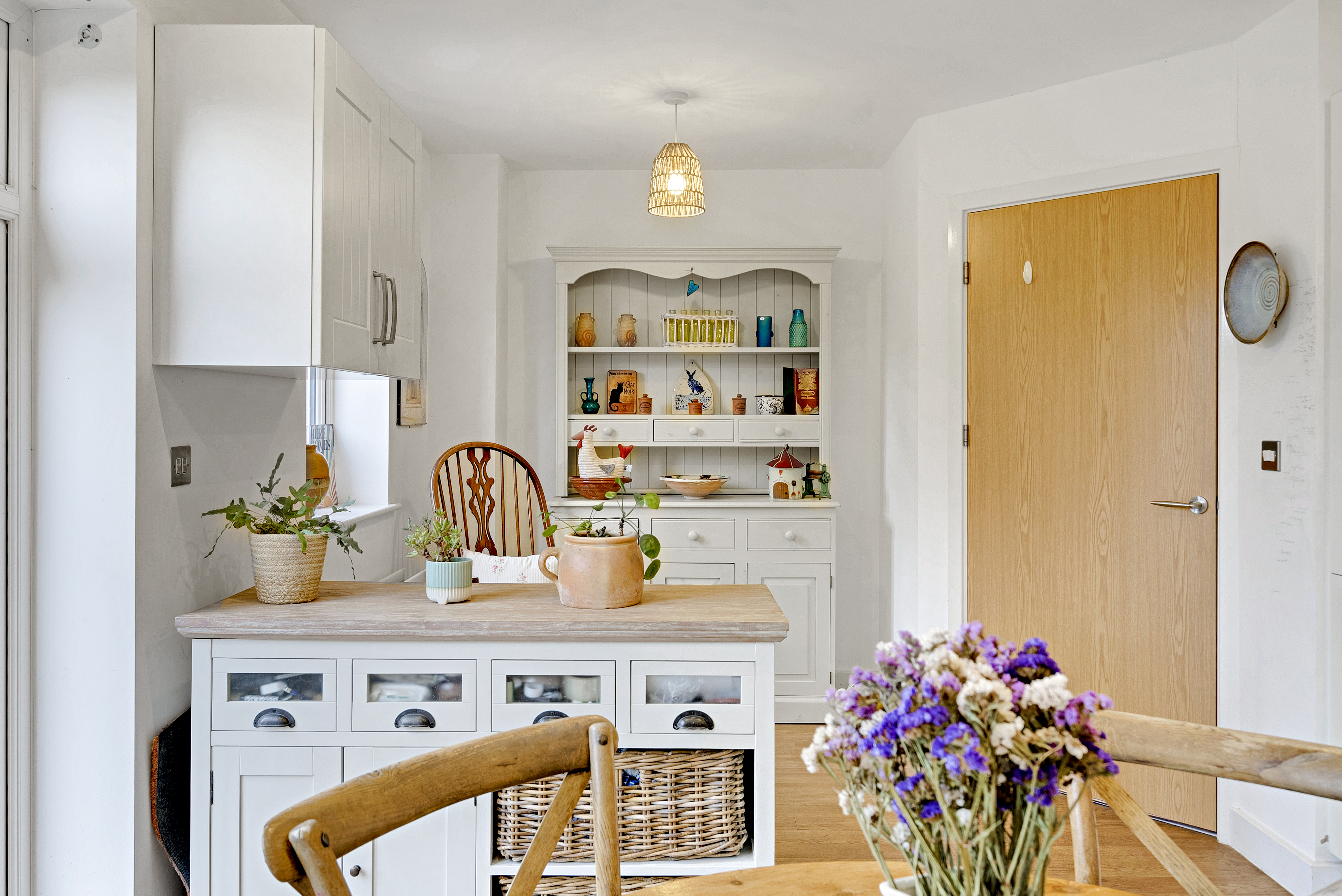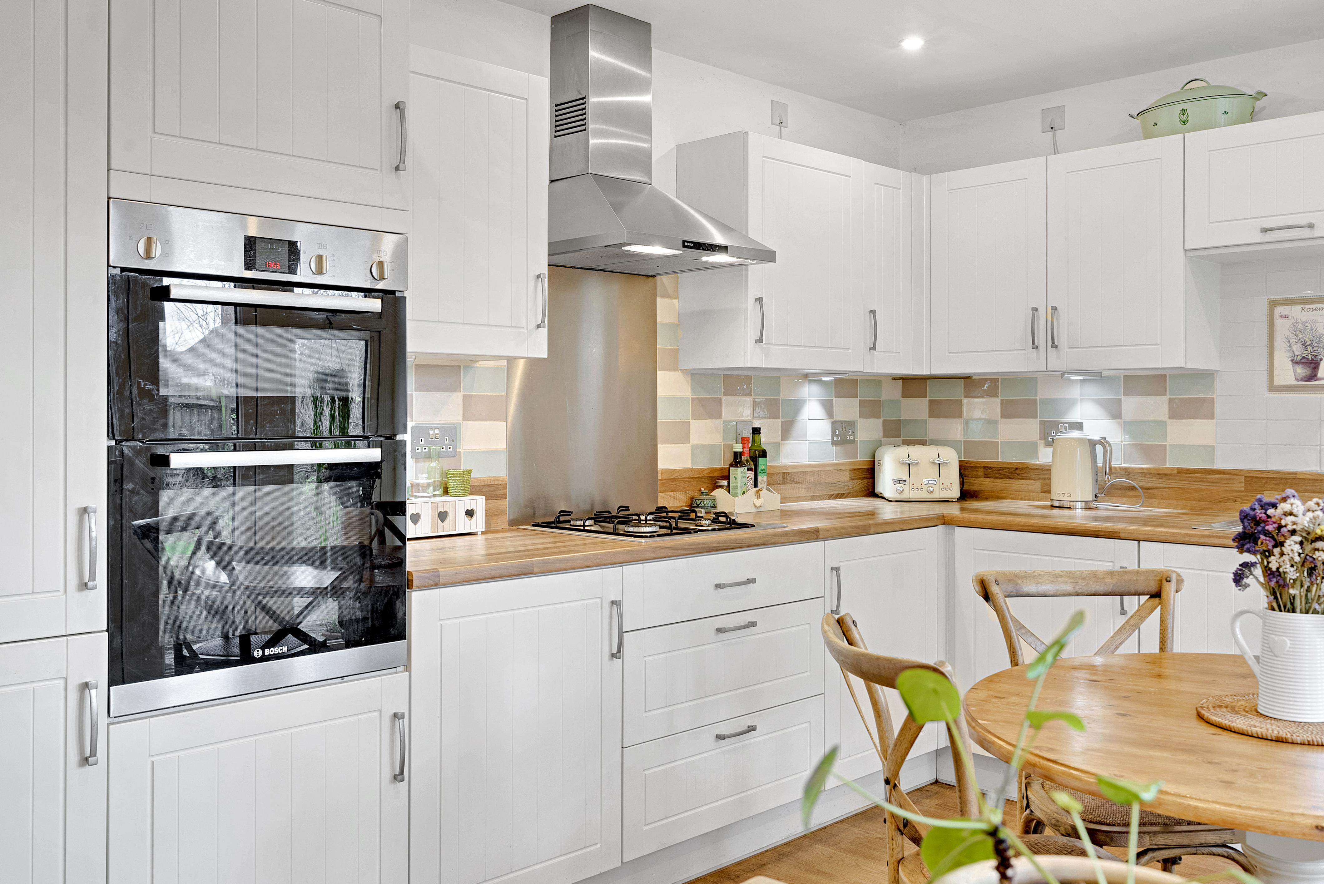 The heart of the home is undoubtedly the kitchen/ breakfast room, fitted with a modern range of cupboards complemented by warm ‘butcher’s block’ style worktops and integrated appliances including cooker, hob and extractor hood. French-style patio doors open directly onto the rear seating terrace, allowing natural light to flood the space and creating an easy connection between indoor and outdoor living; perfect for relaxed breakfasts or summer gatherings.
