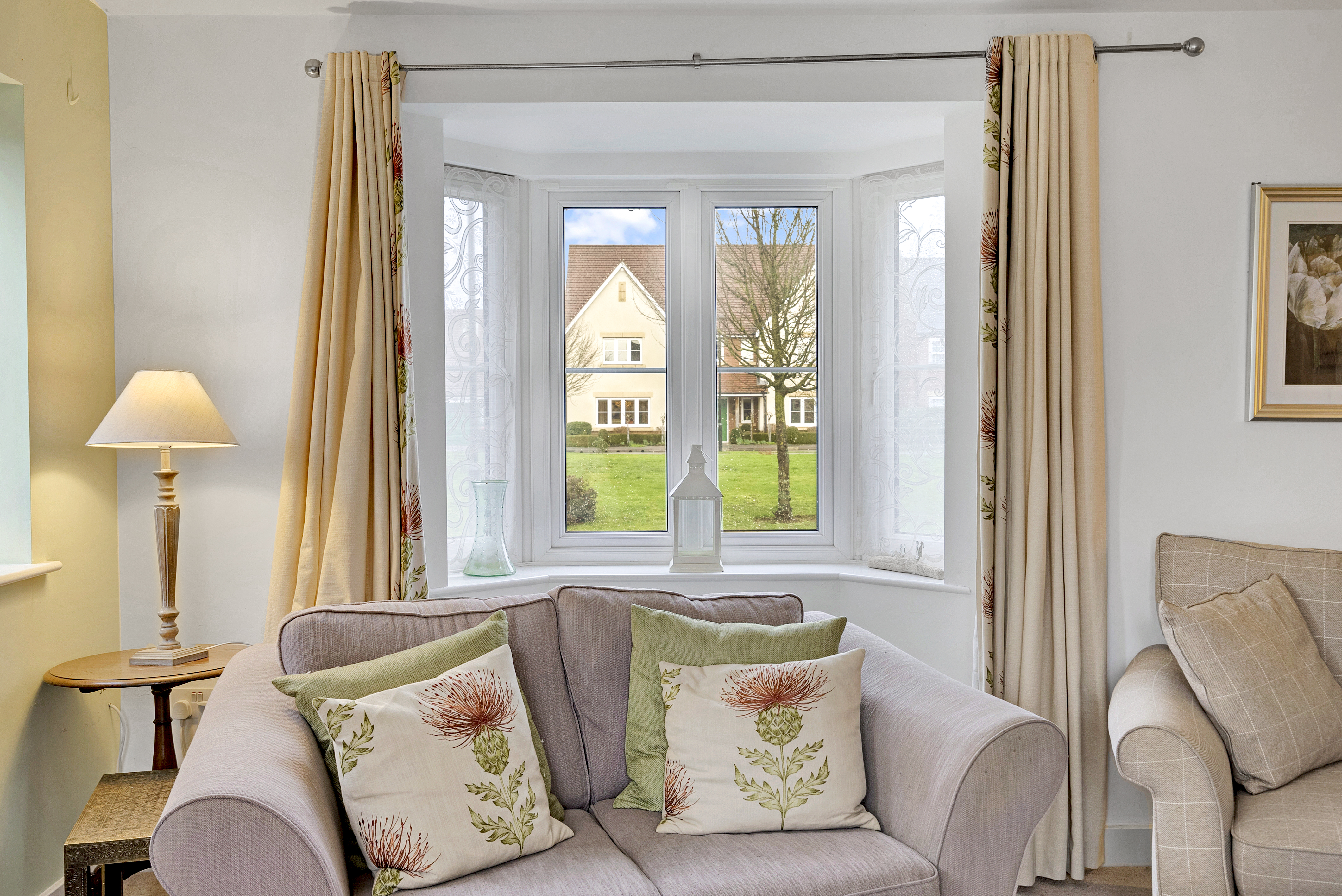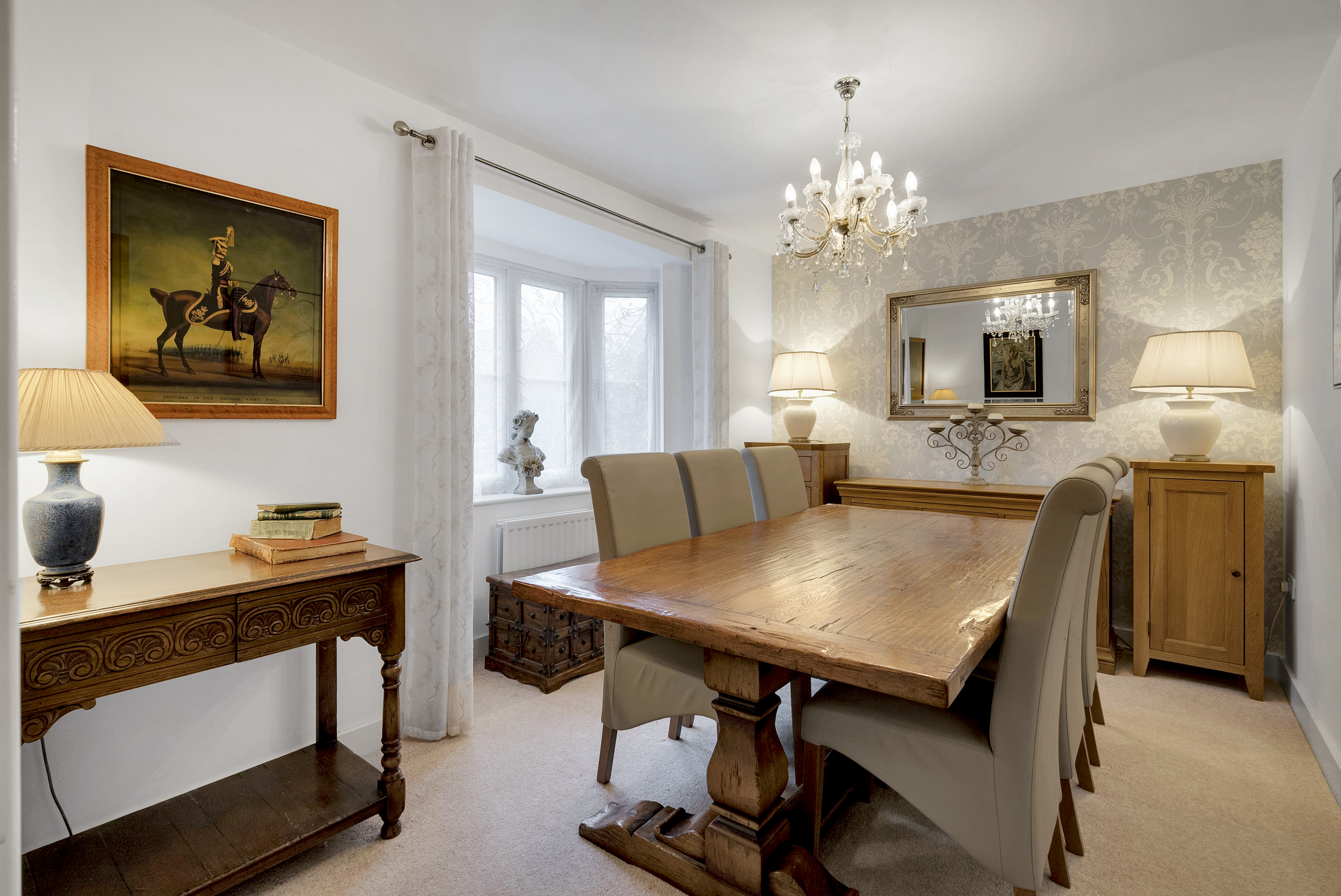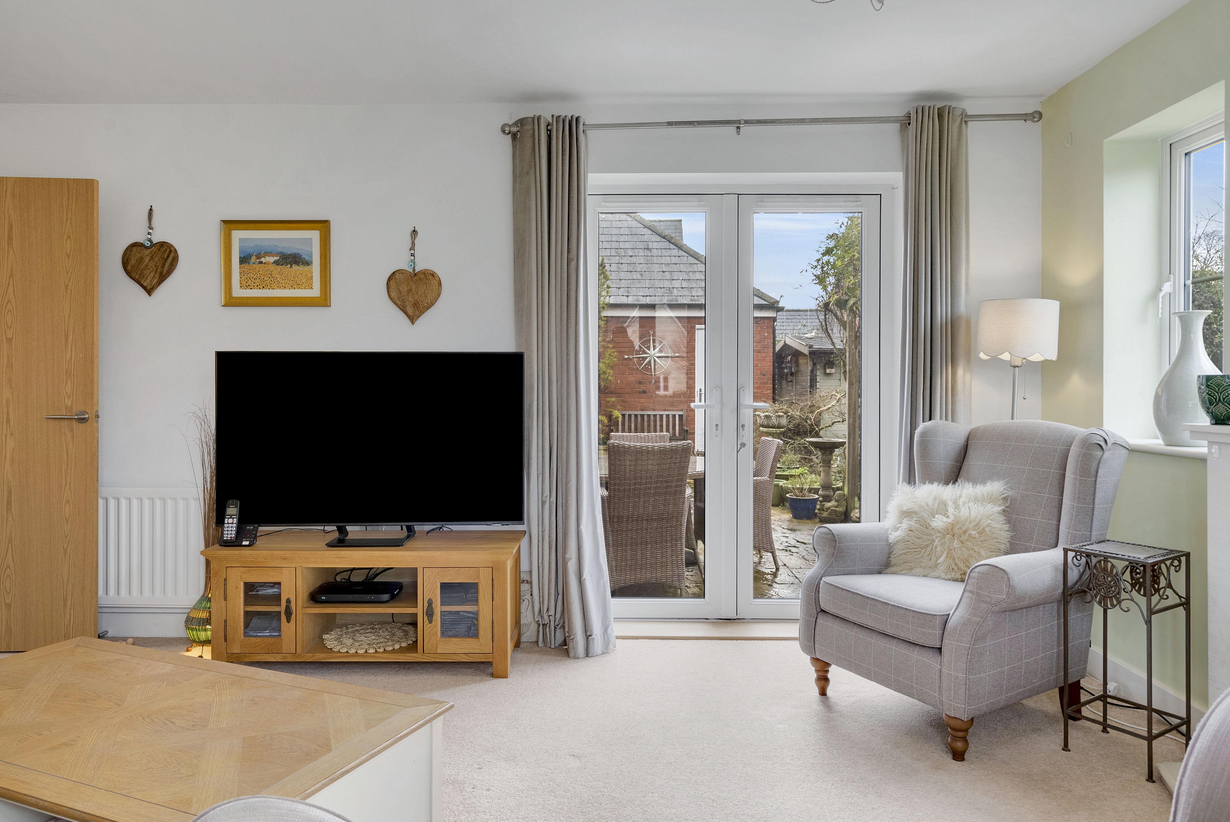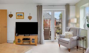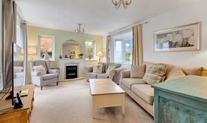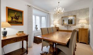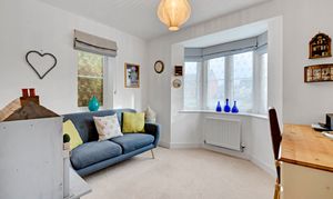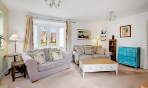 - Sitting room to the rear, with a central fire surround, dual aspect windows, and patio doors opening into the rear gardens