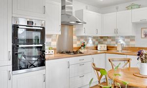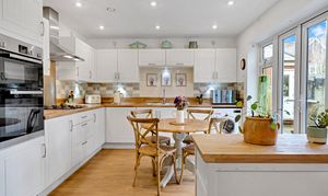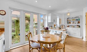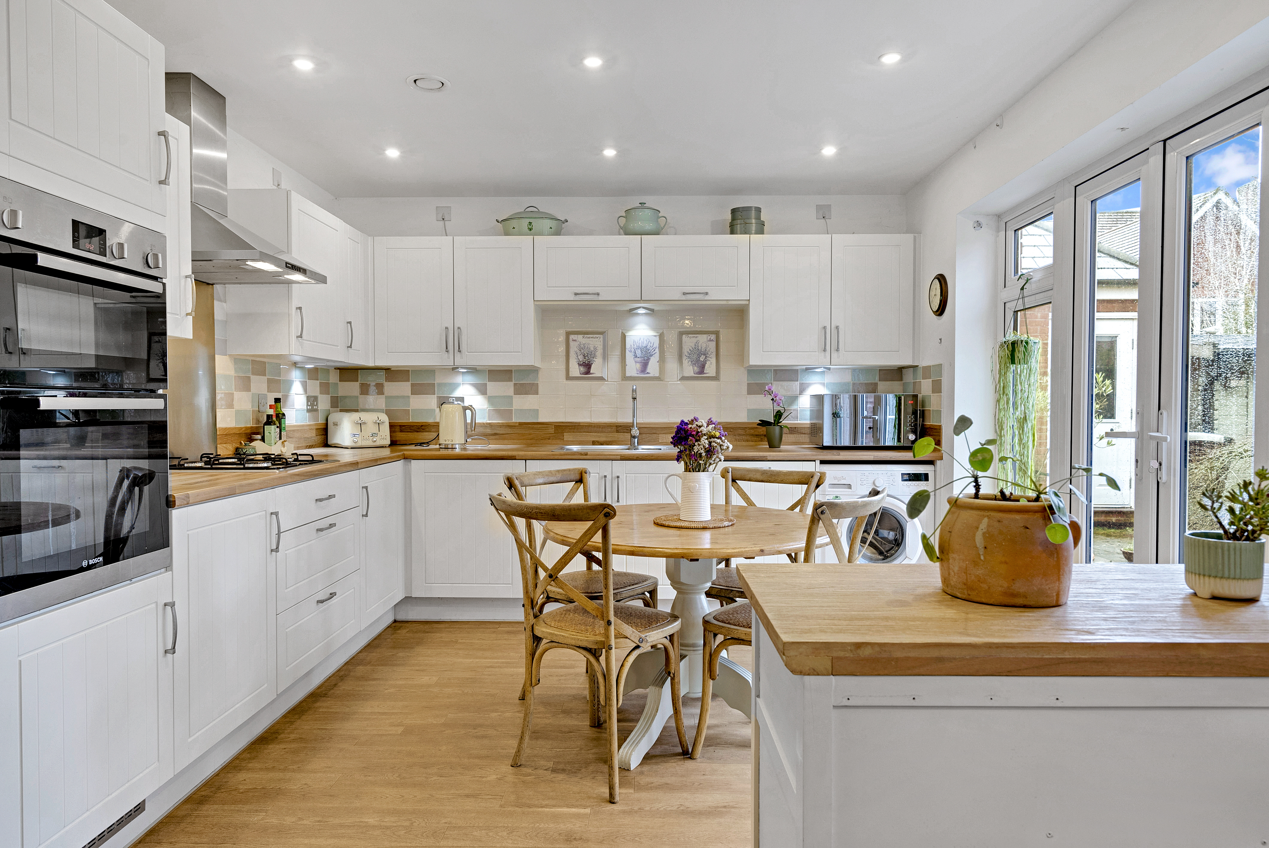 - Kitchen/ breakfast room with a range of modern cupboard units, butcher's block style worktops, integrated appliances incl. cooker, hob and extractor hood, and french-style patio doors onto the patio
