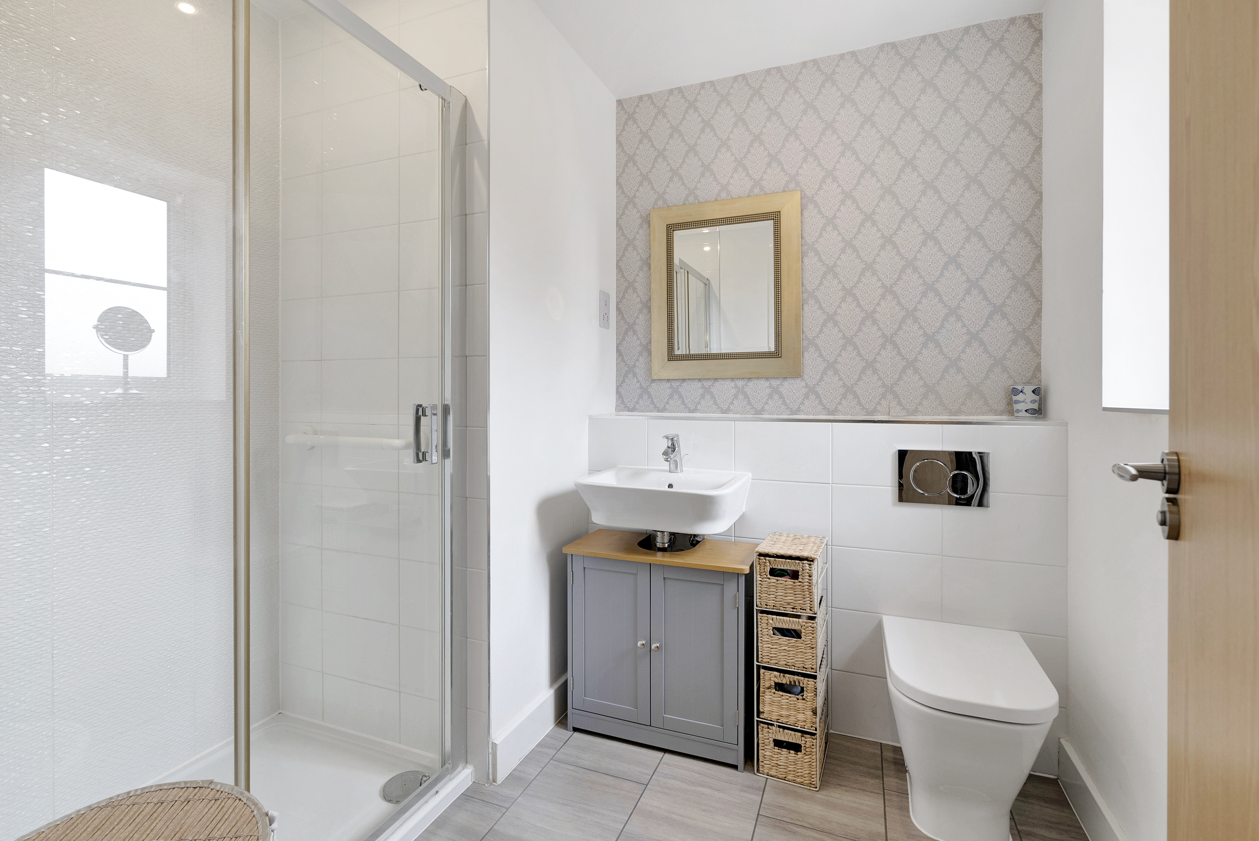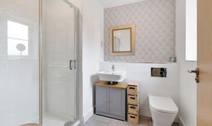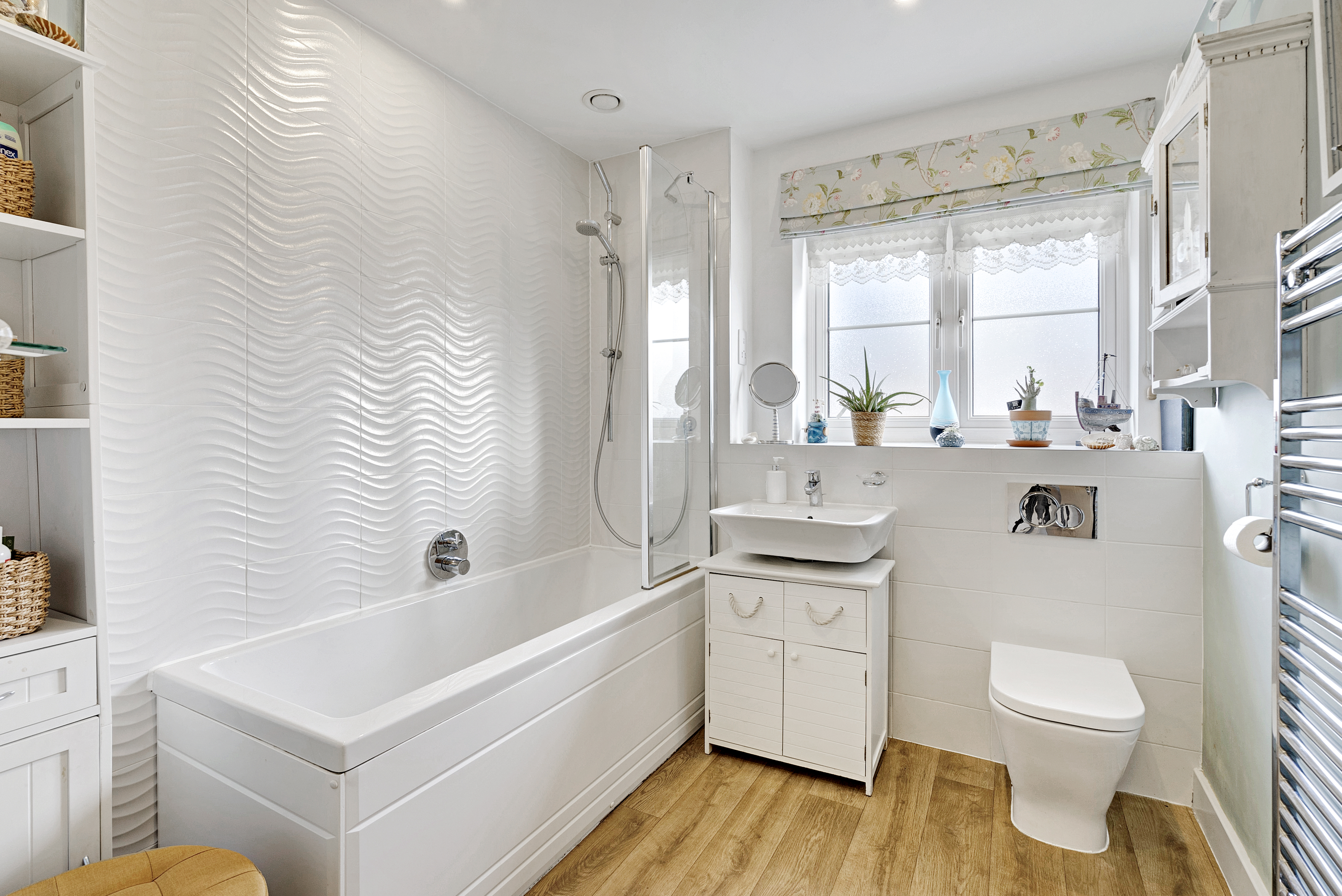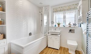 - Family bathroom featuring a contemporary white suite, comprising bath with shower over, basin and W.C.