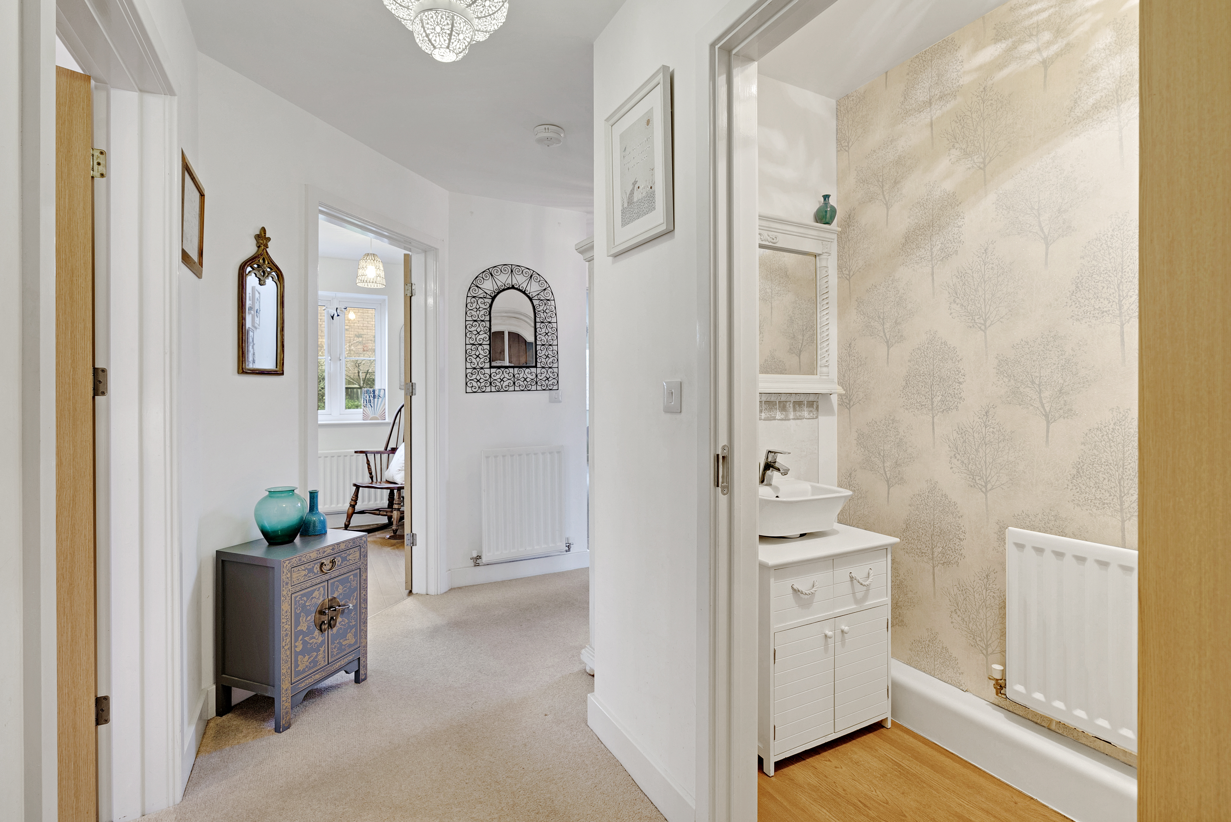 Upstairs, the accommodation continues to impress with four well-proportioned double bedrooms. The principal bedroom forms a particularly appealing suite, featuring walk-in wardrobes and a private en-suite shower room. The remaining bedrooms are served by a contemporary family bathroom, fitted with a modern white suite including bath with shower over, basin and W.C., ensuring both style and practicality.