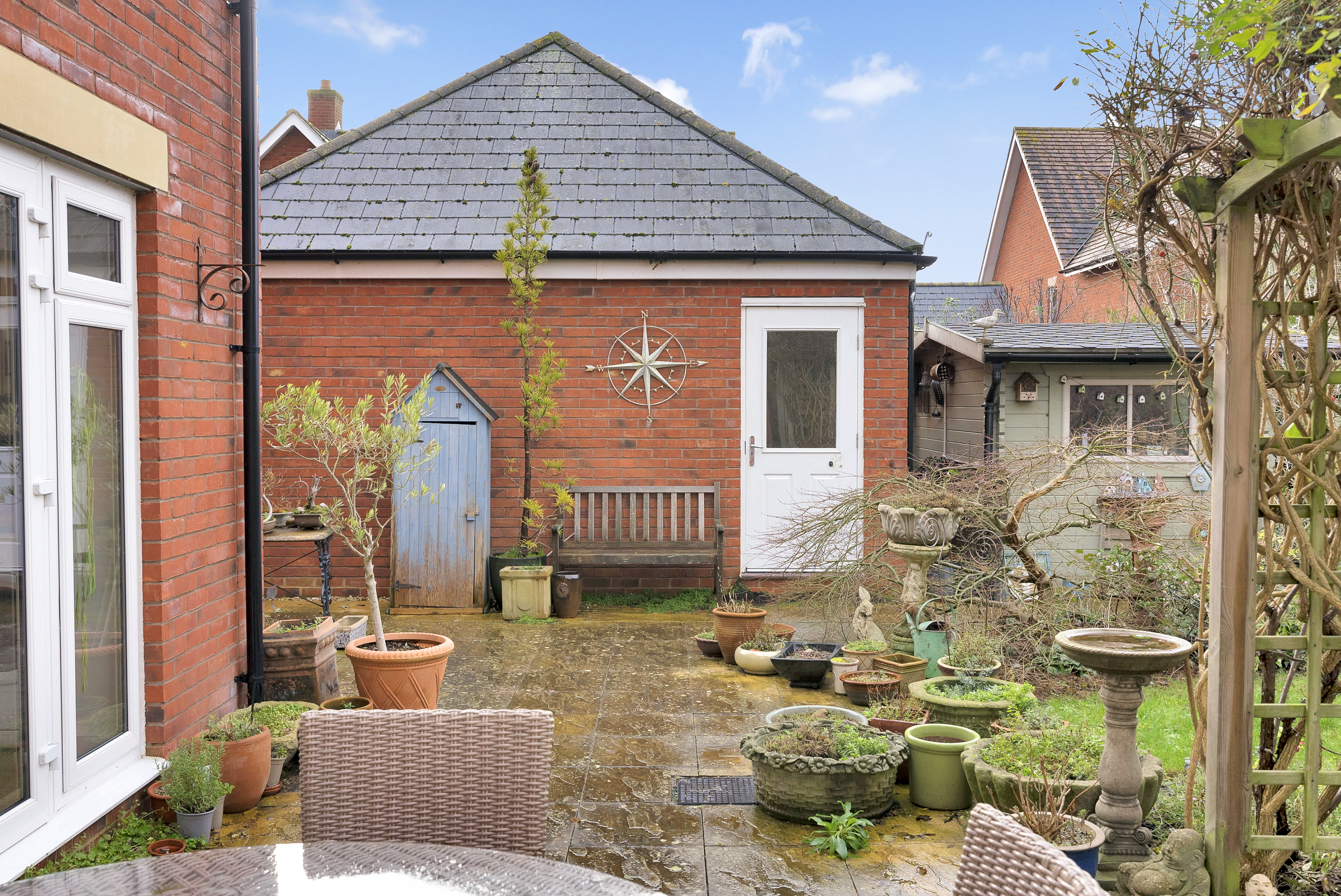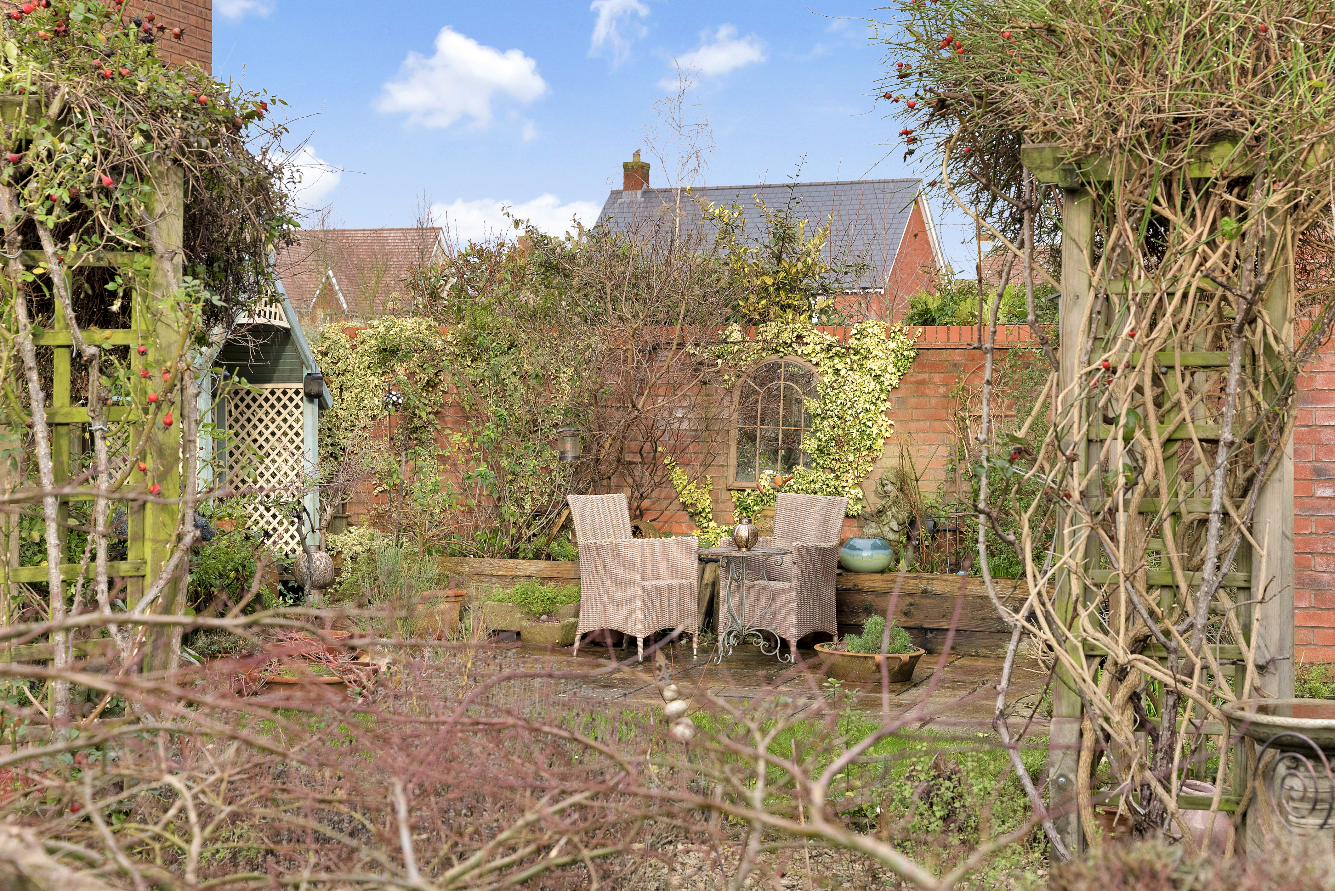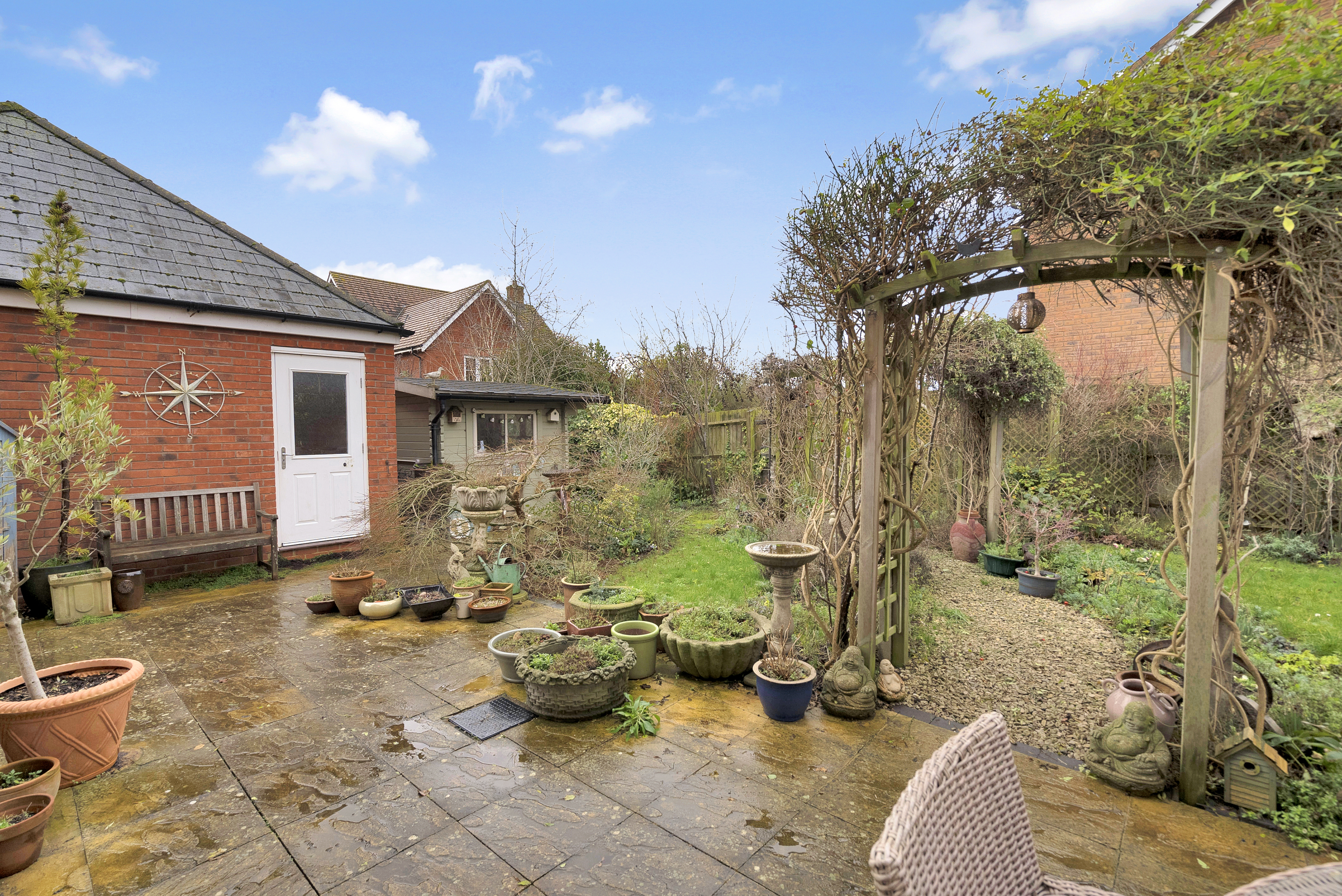 - Enclosed rear gardens, including paved patio seating areas, lawns, established shrubs and a summer house
