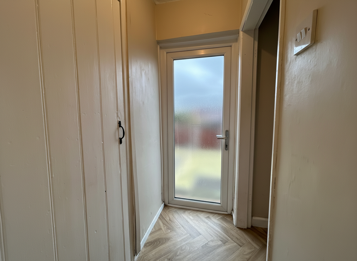 Under the stairs storage area. External door to rear elevation. Internal door through to: