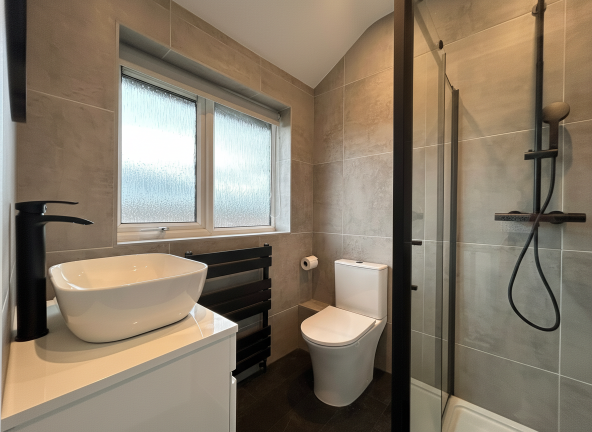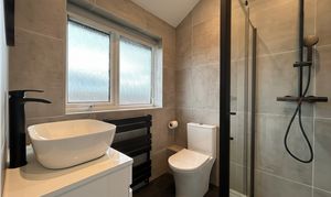 Window to rear elevation. Fully tiled walls. Fitted with low-level W.C, vanity hand wash basin, and shower cubicle.