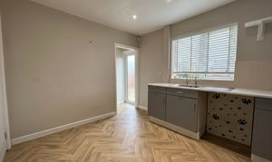 Dual windows to rear elevation. Fitted kitchen with wall and base units and contrasting worktops. Space for oven with hob, fridge/freezer and washing machine. Open to: