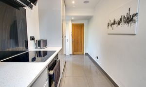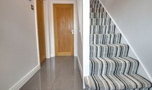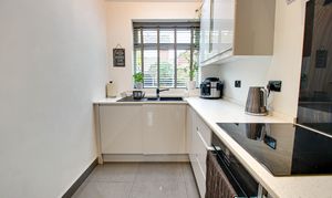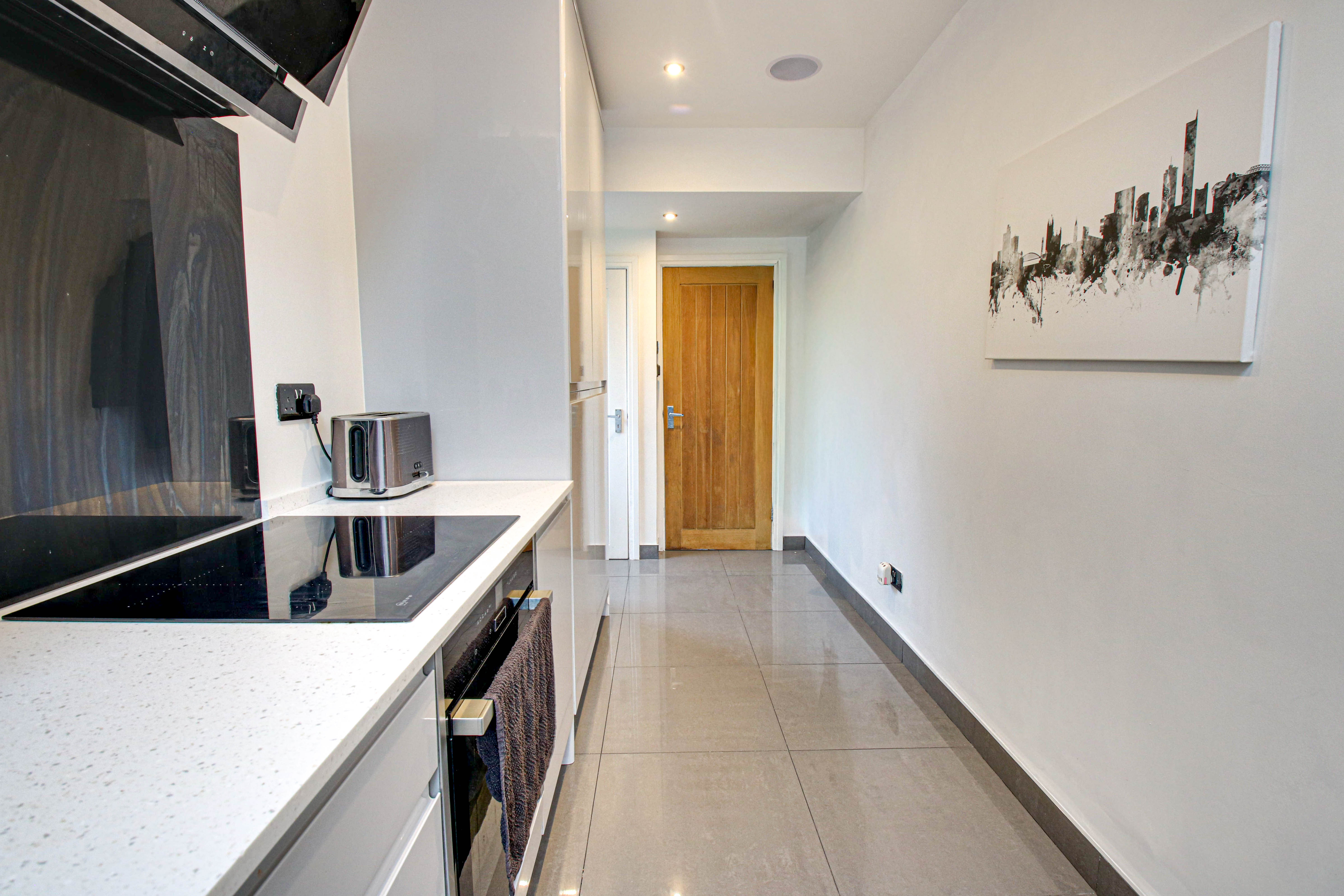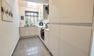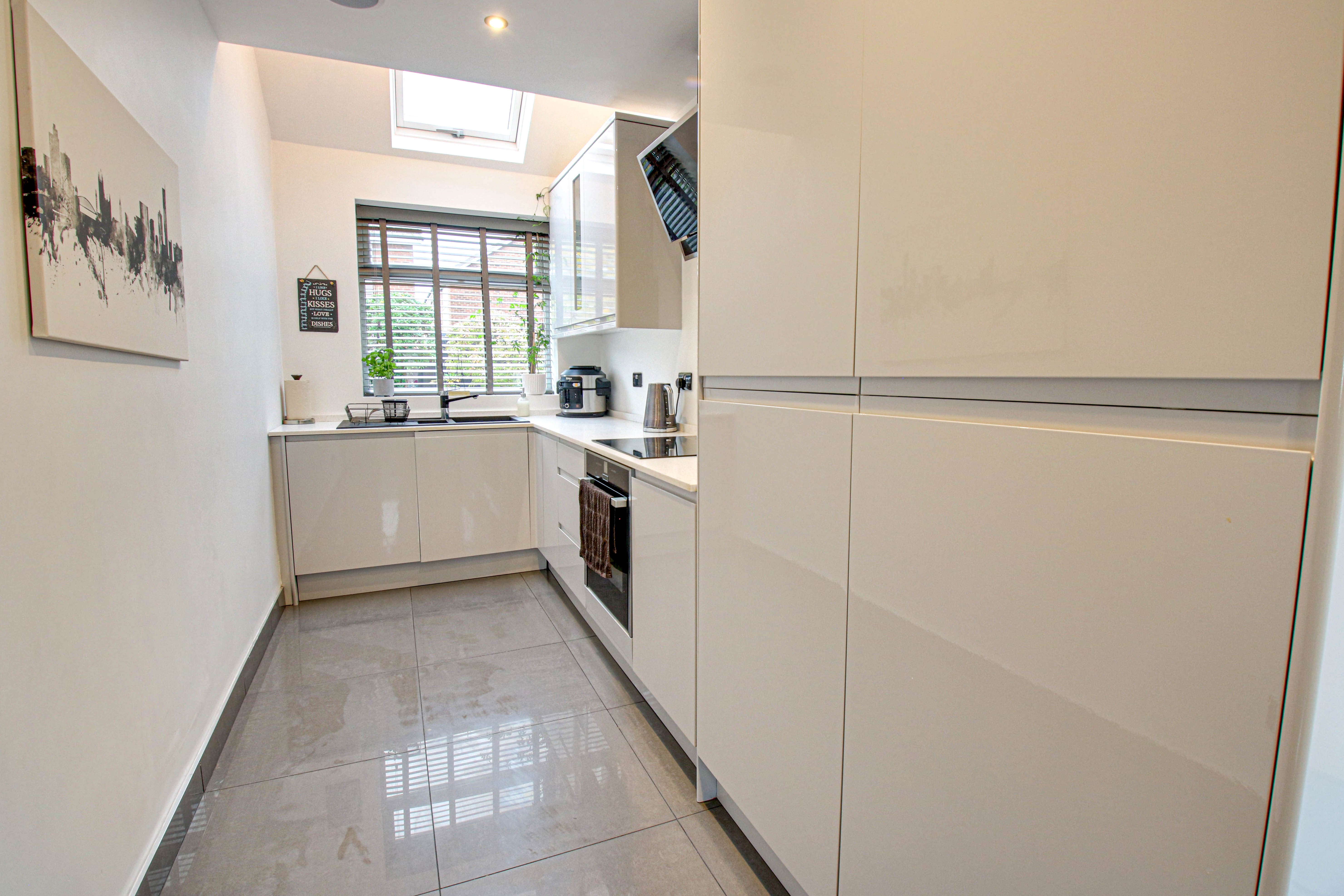 Rear facing upvc window, fitted range of base and wall units,Integral appliances, acrylic worktops, underfloor heating. Neff Hob, Electric oven, tiled flooring, Vaillant Boiler, under stairs cupboard.