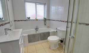Rear facing upvc window, four piece bathroom suite, tiled walls and flooring. Heated towel rail.