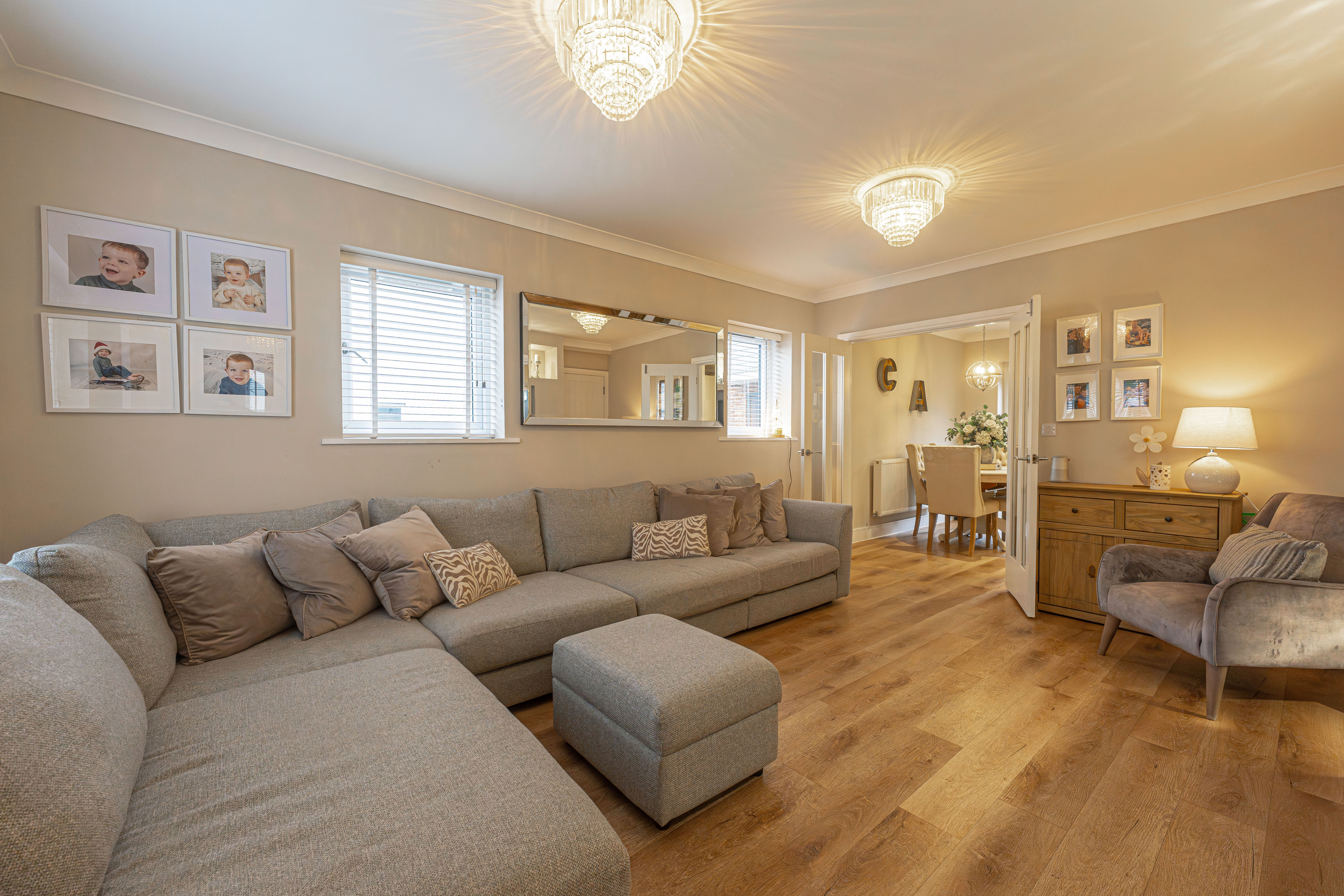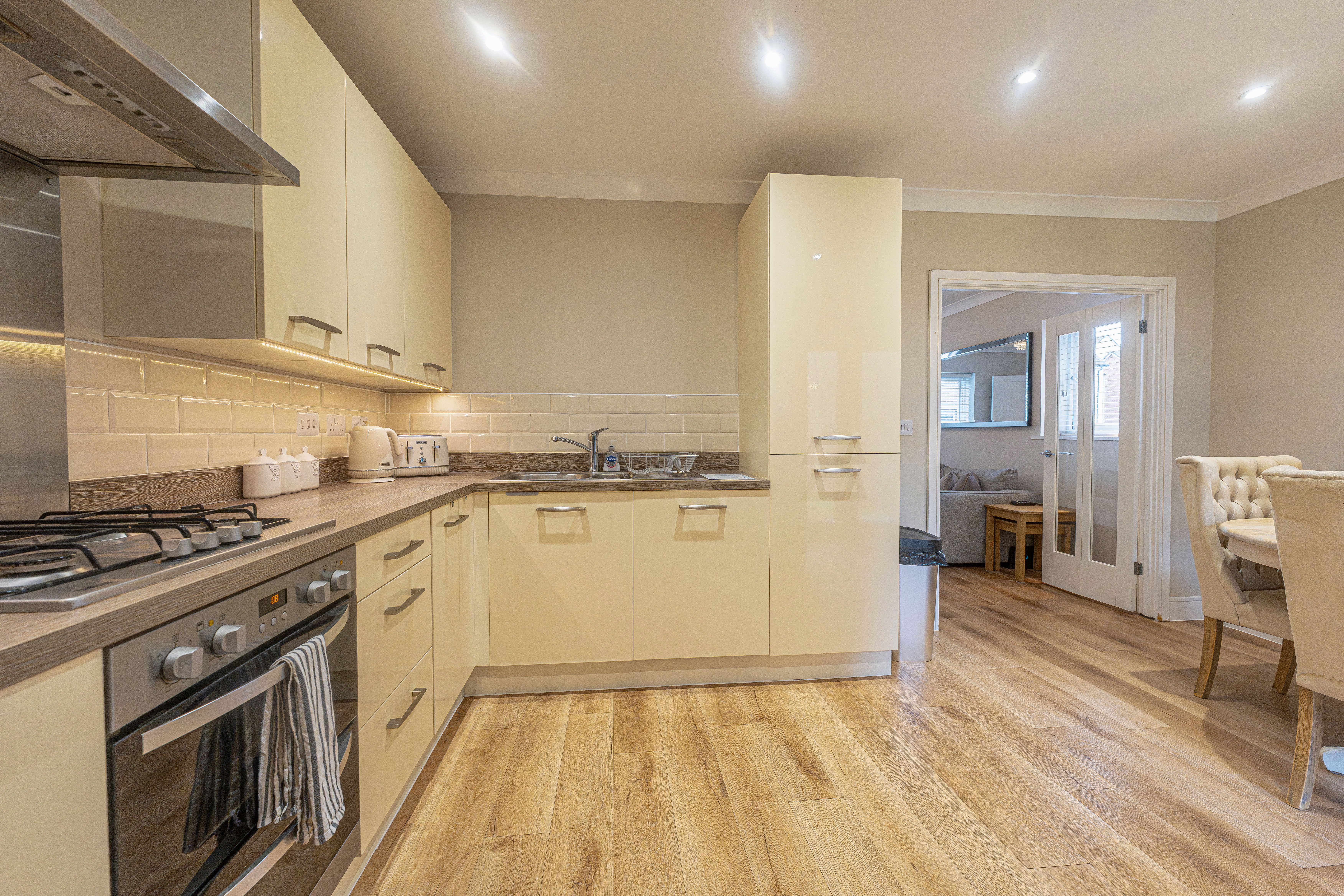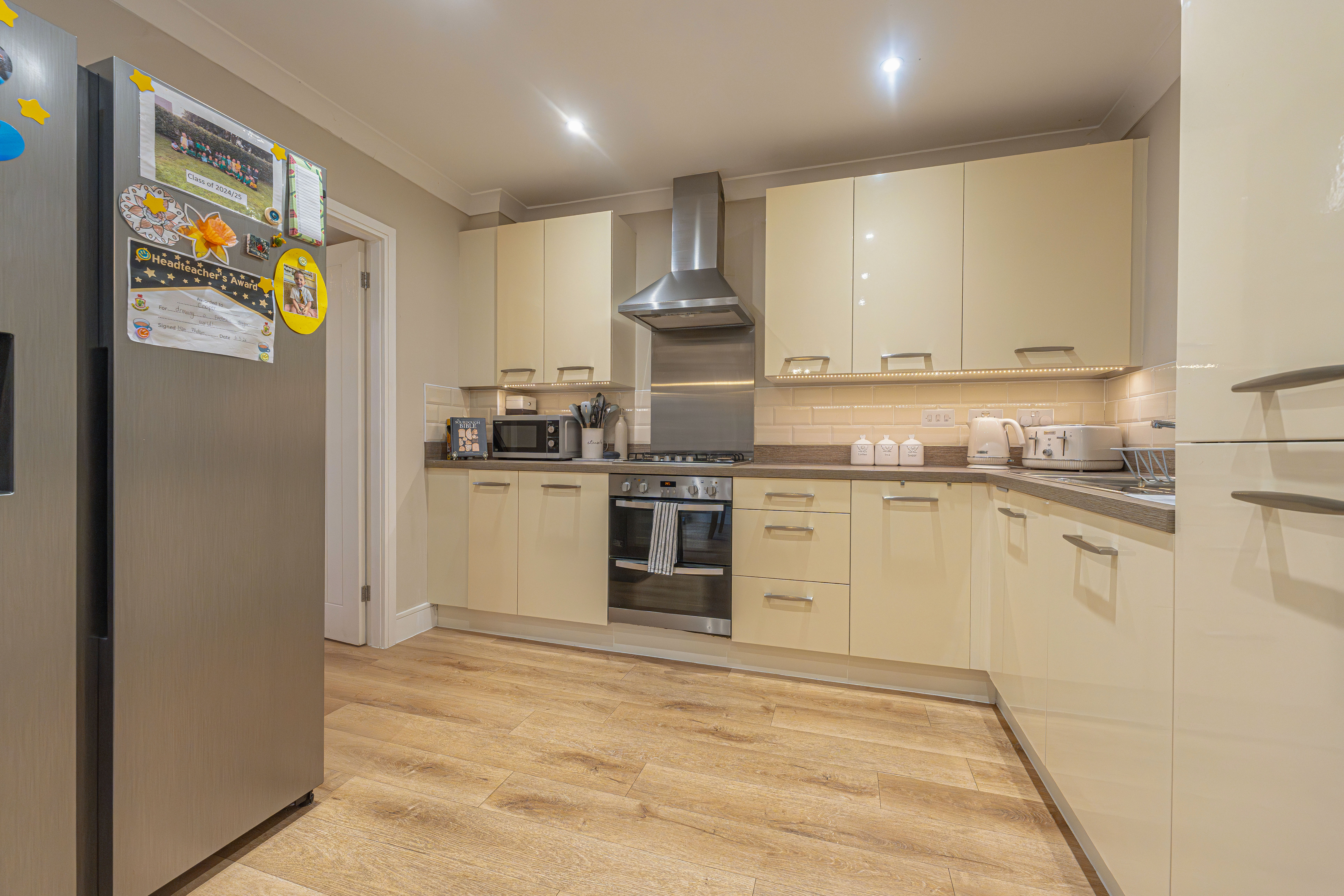 We enter this beautifully presented property to the front, where we are welcomed into the spacious living room, featuring stylish lighting fixtures, a charming fireplace, and a flood of light from multi aspect windows, creating a perfect environment for entertaining and relaxing. Continuing through we have the stylish kitchen, featuring sleek modern appliances offering ample storage space and integrated appliances, as well as an open plan design to the neighbouring dining room, and French doors that effortlessly open to the garden. Beyond the kitchen we have a helpful utility room, great for managing household tasks, with a W.C beyond.