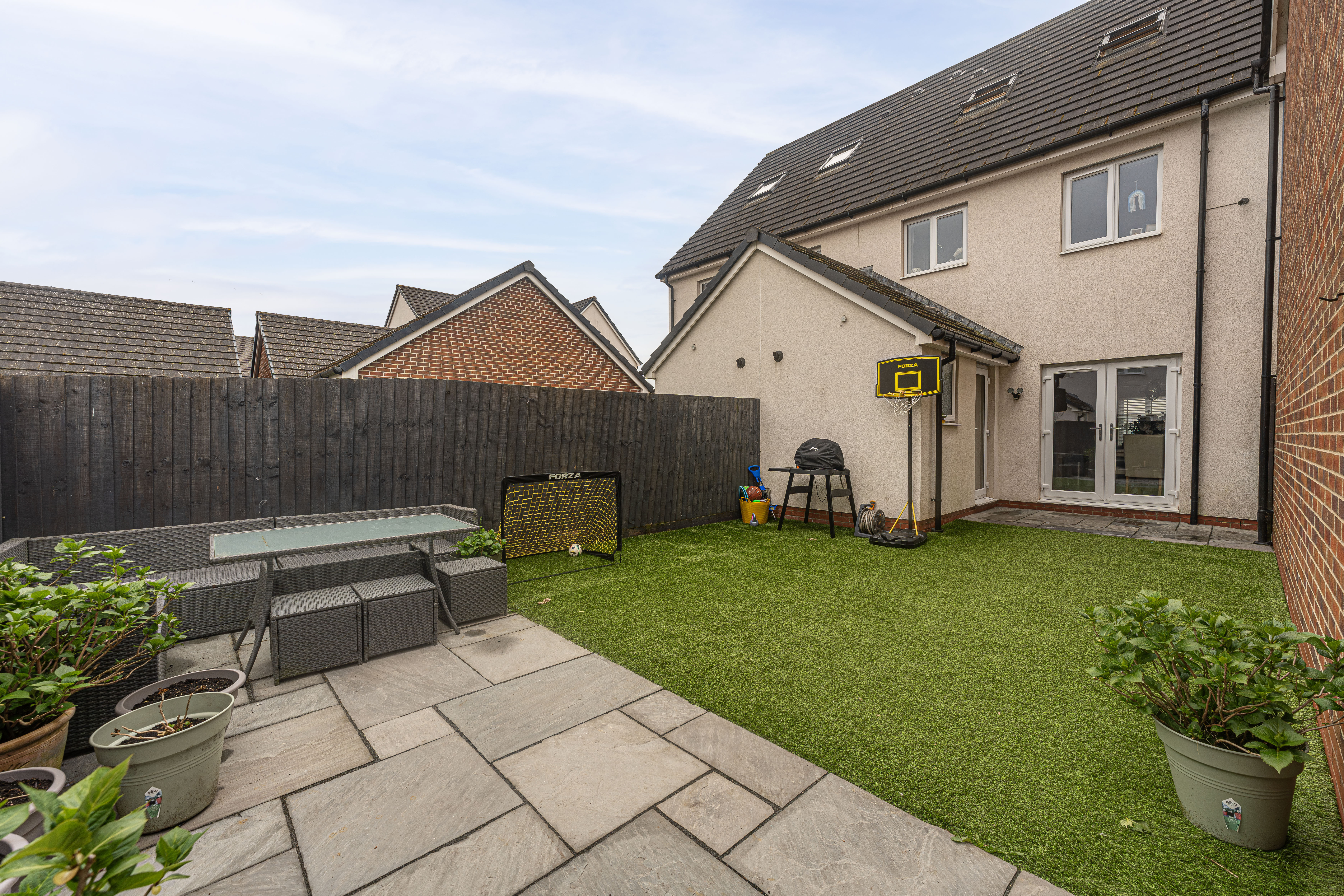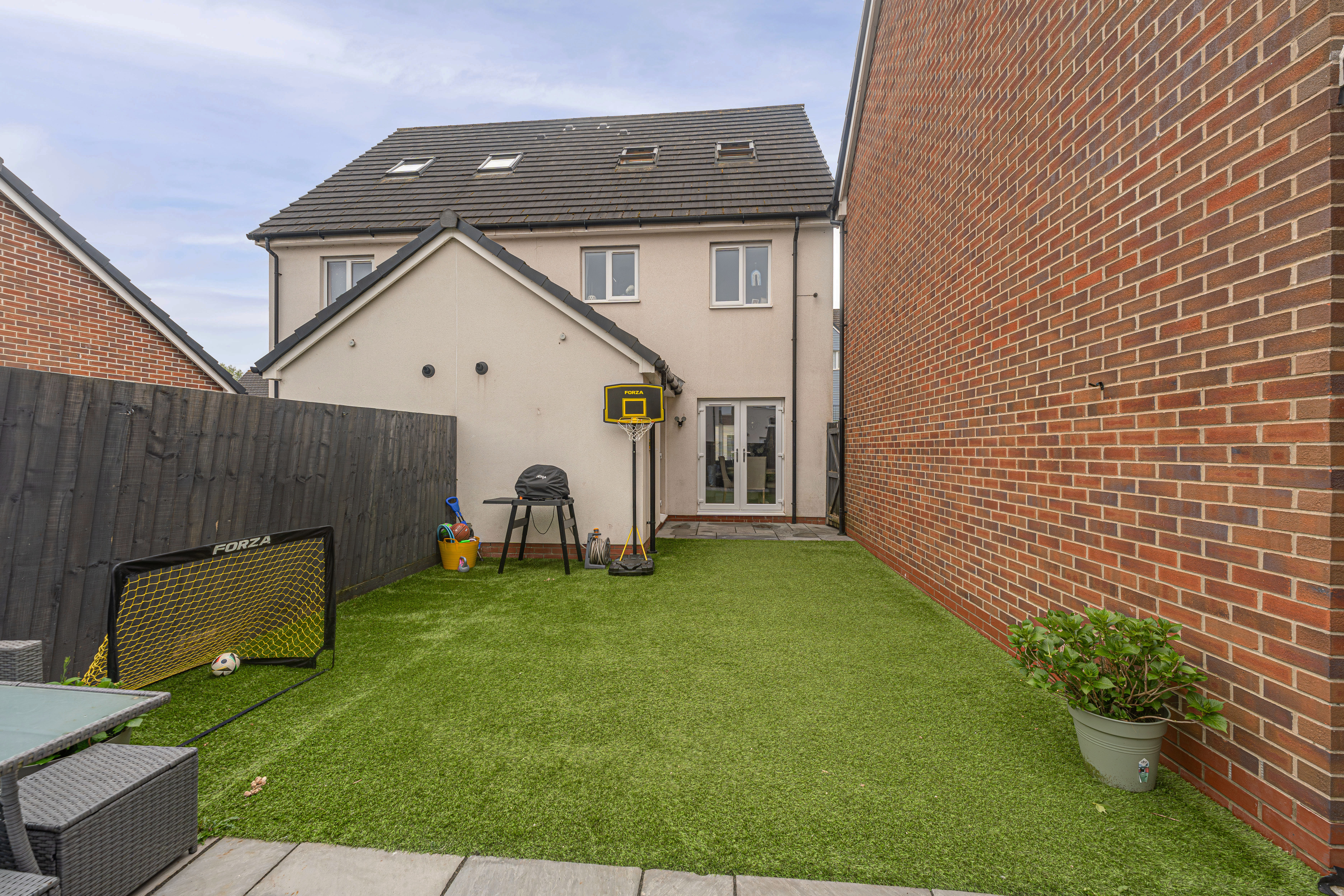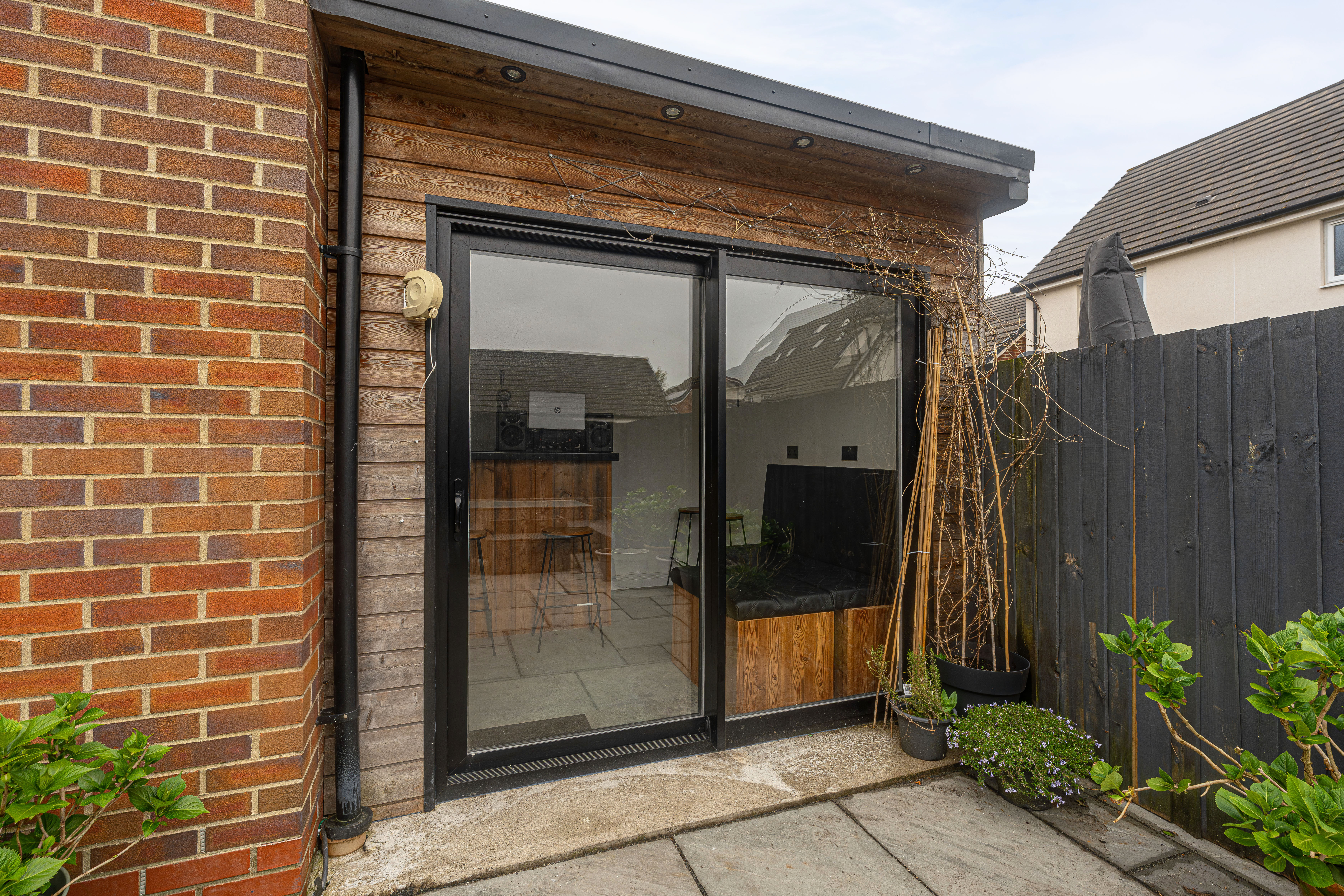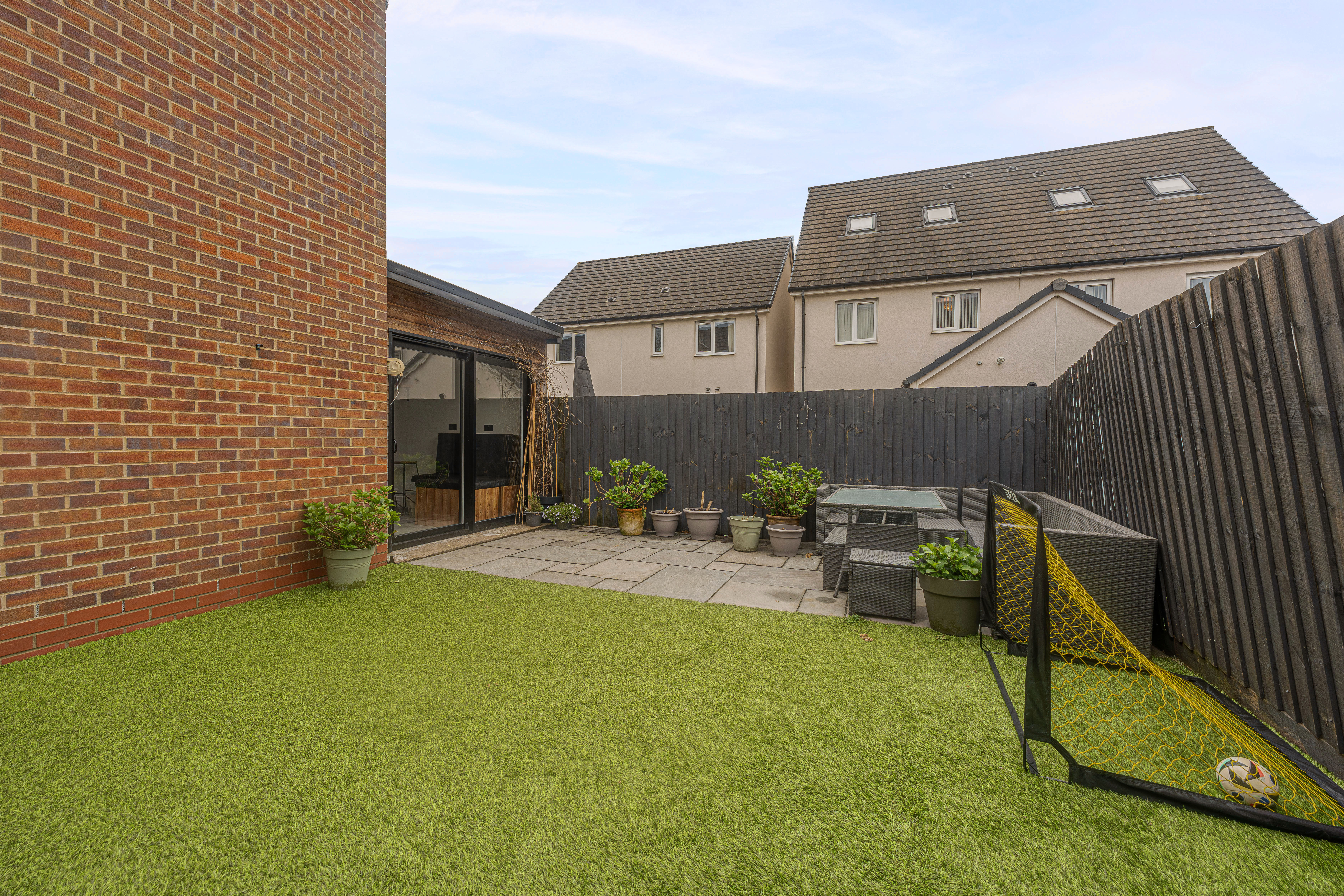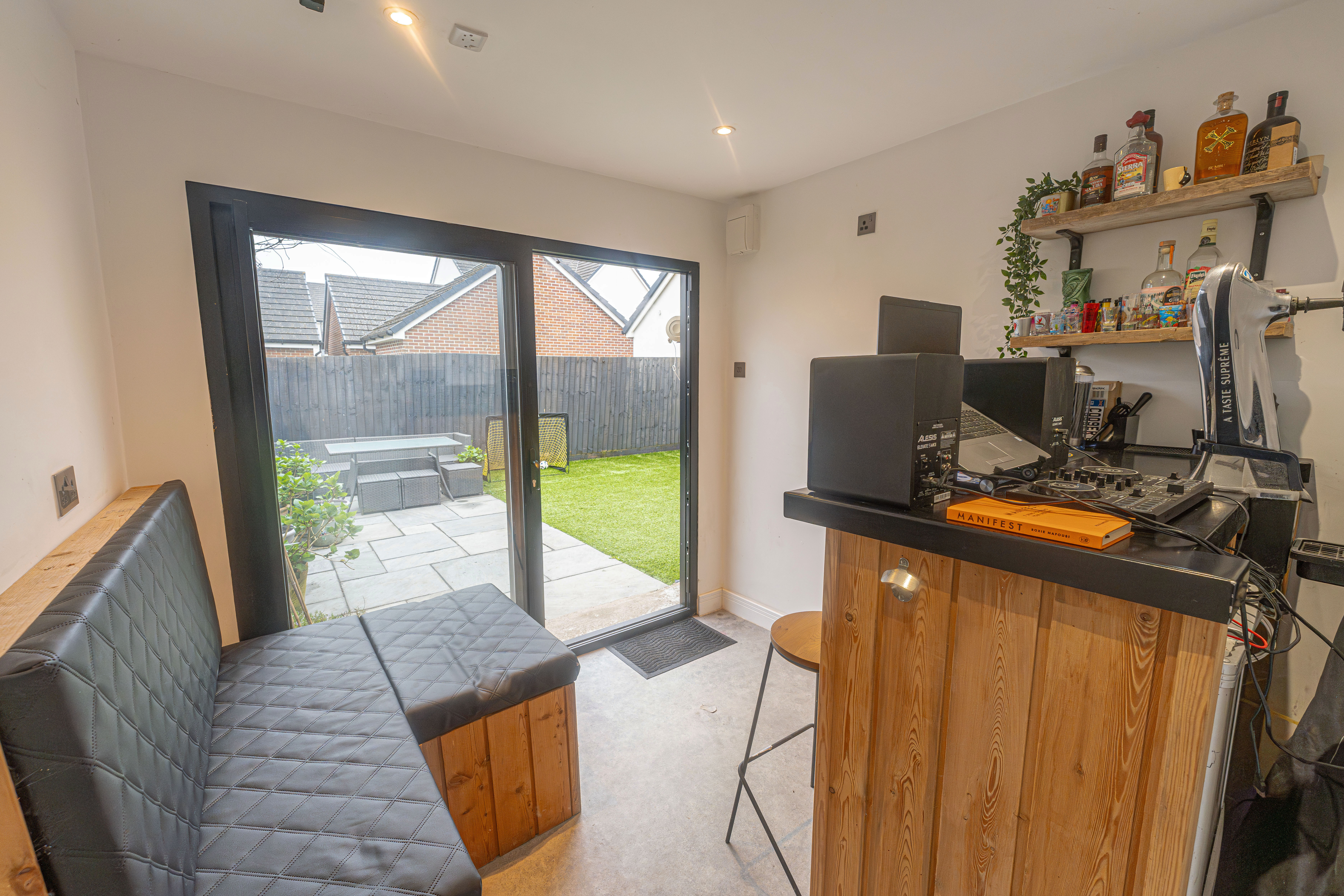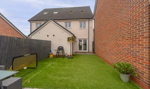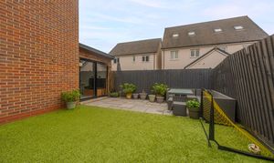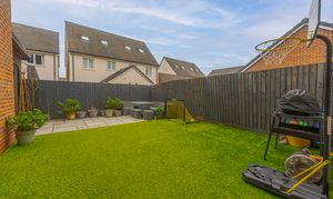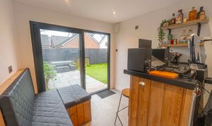 Stepping outside we can find the marvelous rear garden, which features multiple patio spaces and a spacious artificial lawn, providing an excellent retreat for families to relaxing in the sunshine, entertain guests, and enjoy dining al-fresco style, all with a superb low maintenance design. The garden is fully enclosed and also features a versatile outbuilding accessed by sliding doors, featuring lights, power and facilities to support a summerhouse or home office.