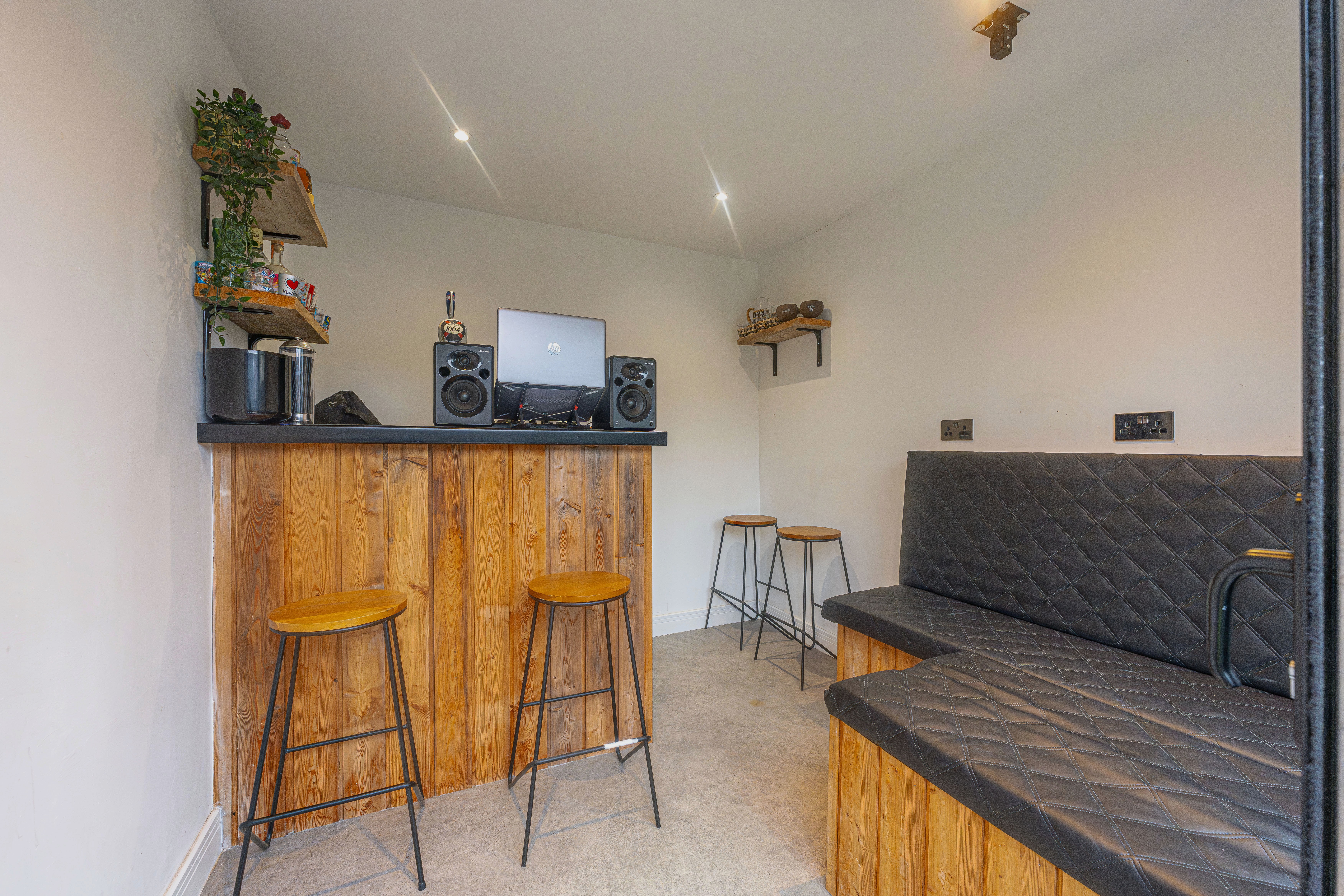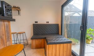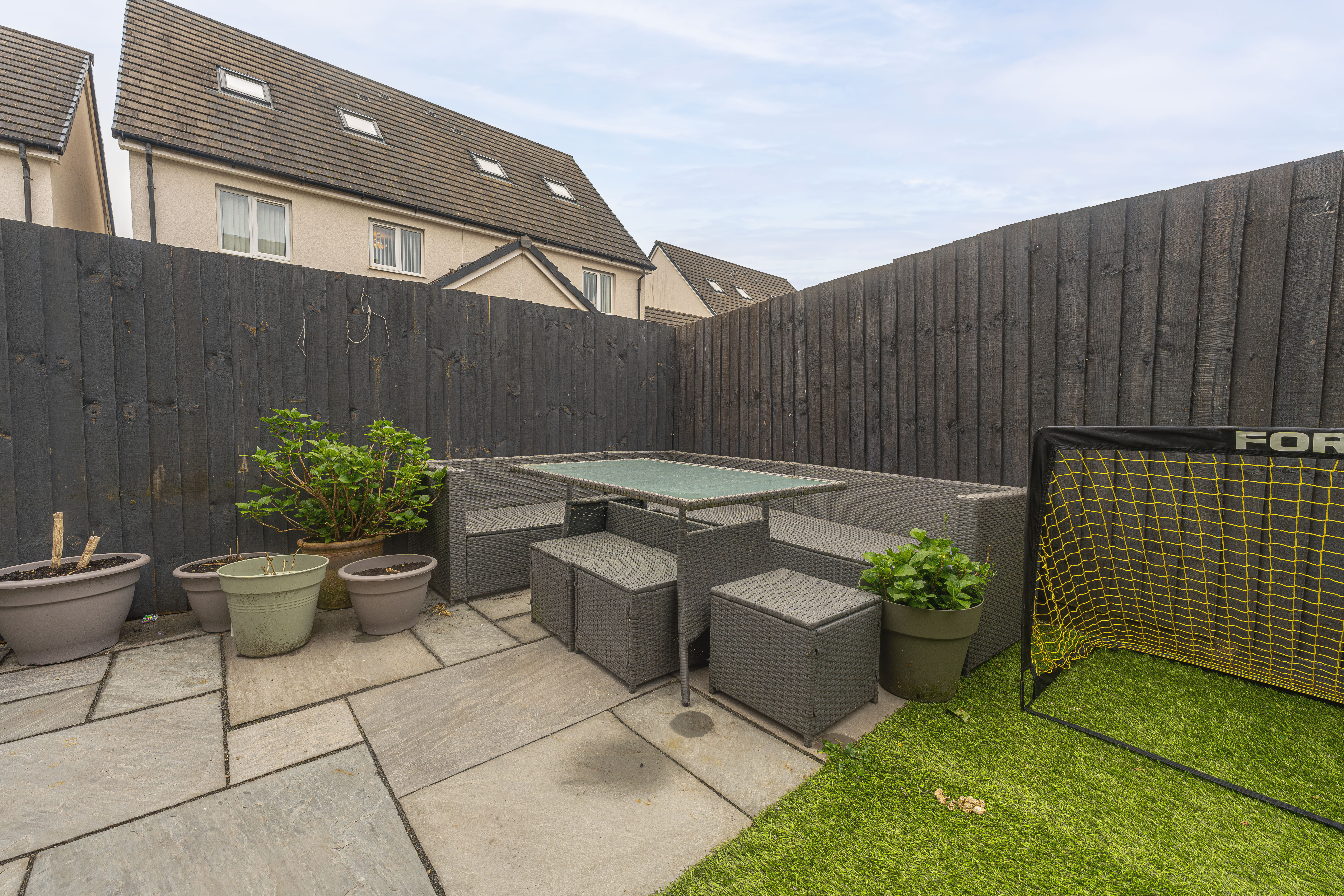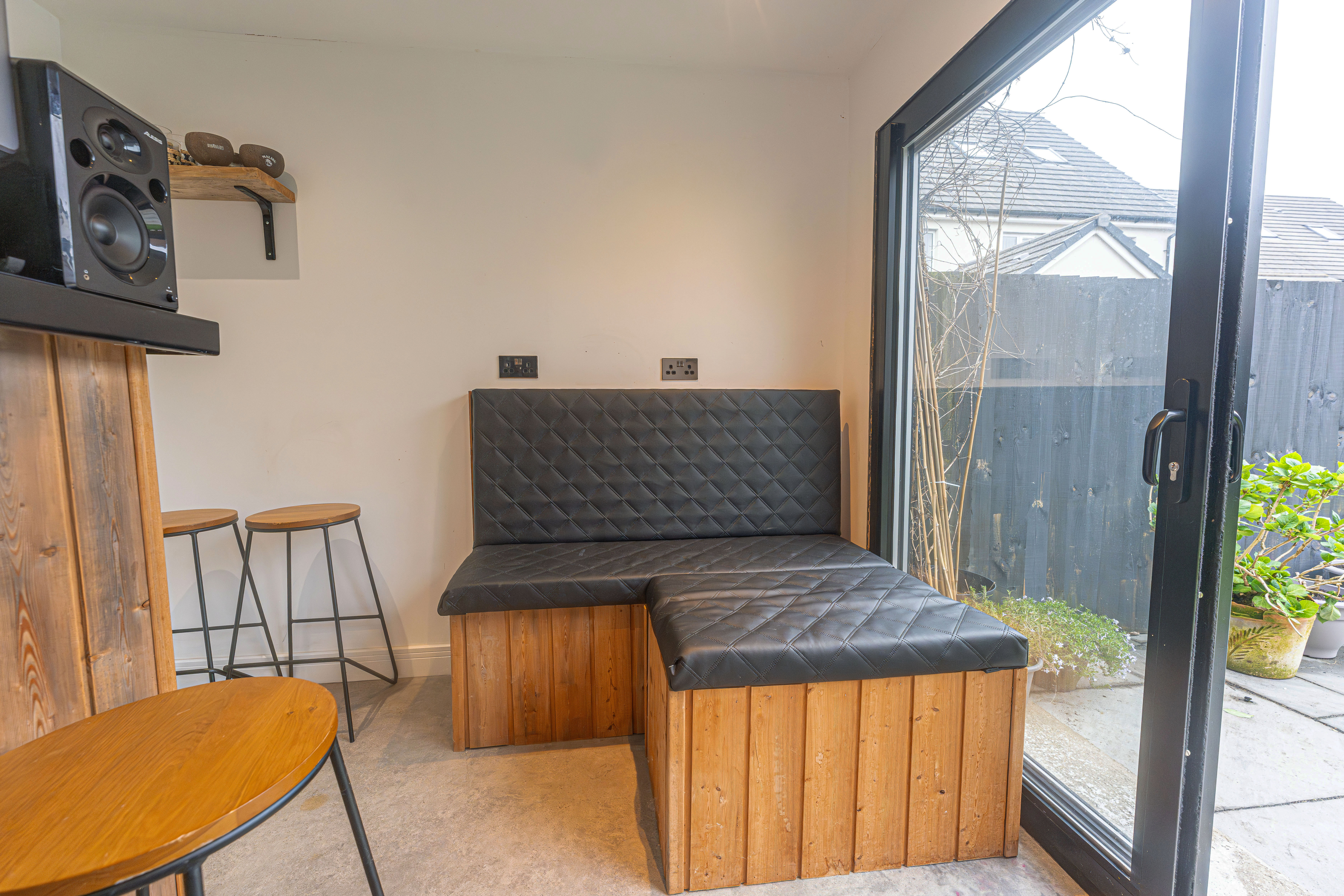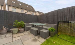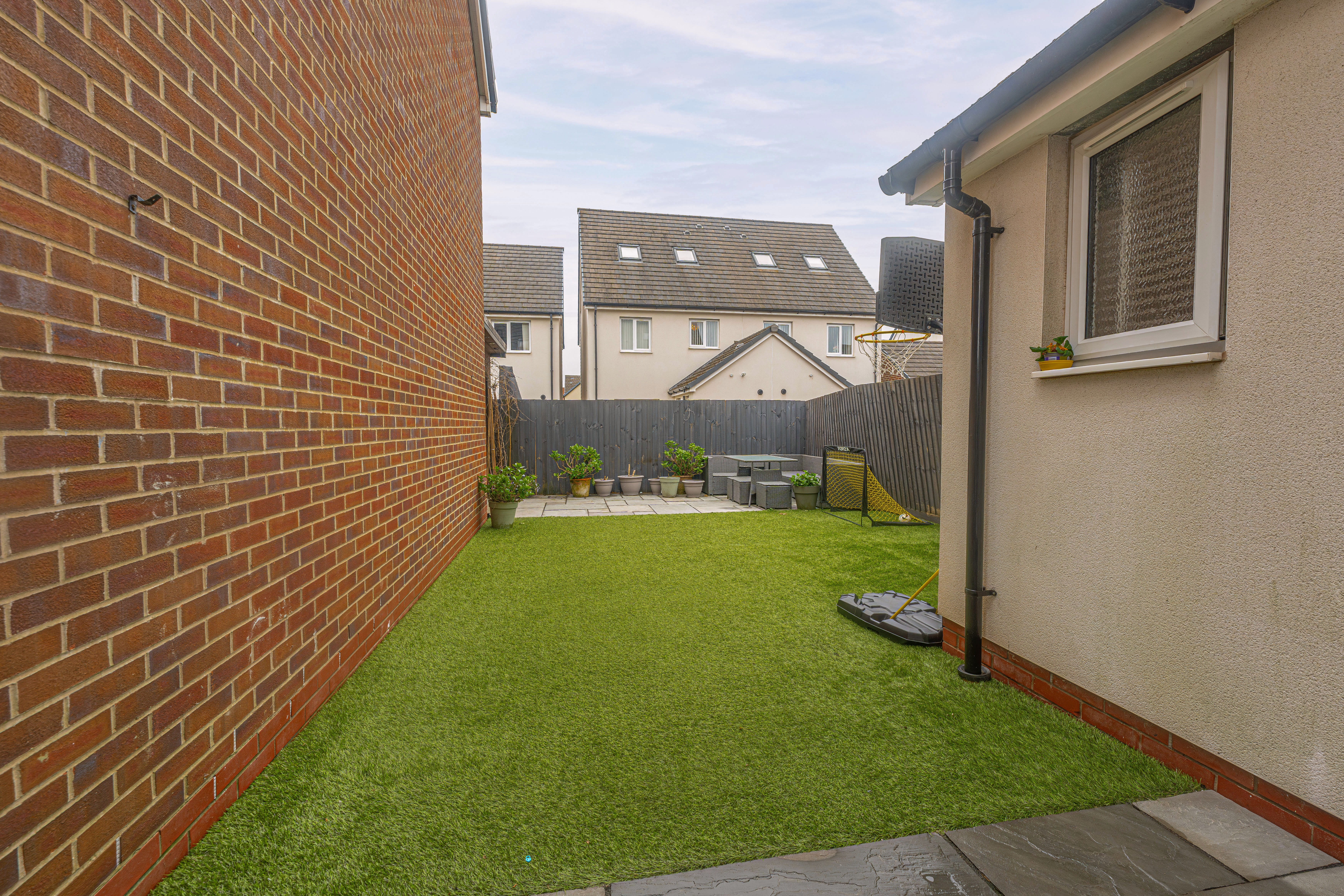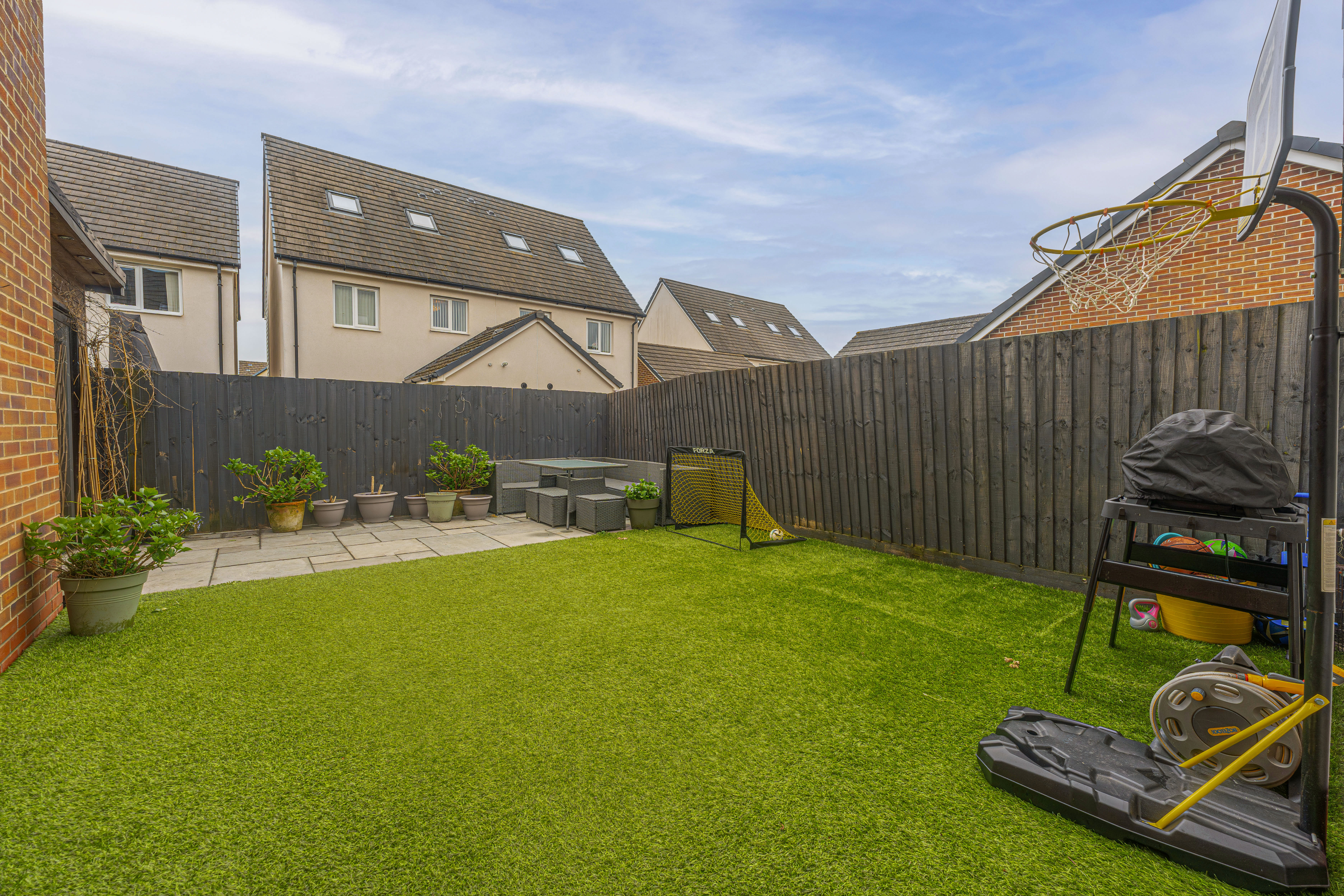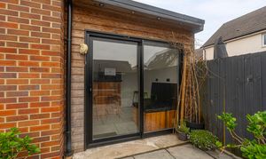 Stepping outside we can find the marvelous rear garden, which features multiple patio spaces and a spacious artificial lawn, providing an excellent retreat for families to relaxing in the sunshine, entertain guests, and enjoy dining al-fresco style, all with a superb low maintenance design. The garden is fully enclosed and also features a versatile outbuilding accessed by sliding doors, featuring lights, power and facilities to support a summerhouse or home office.