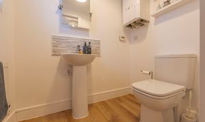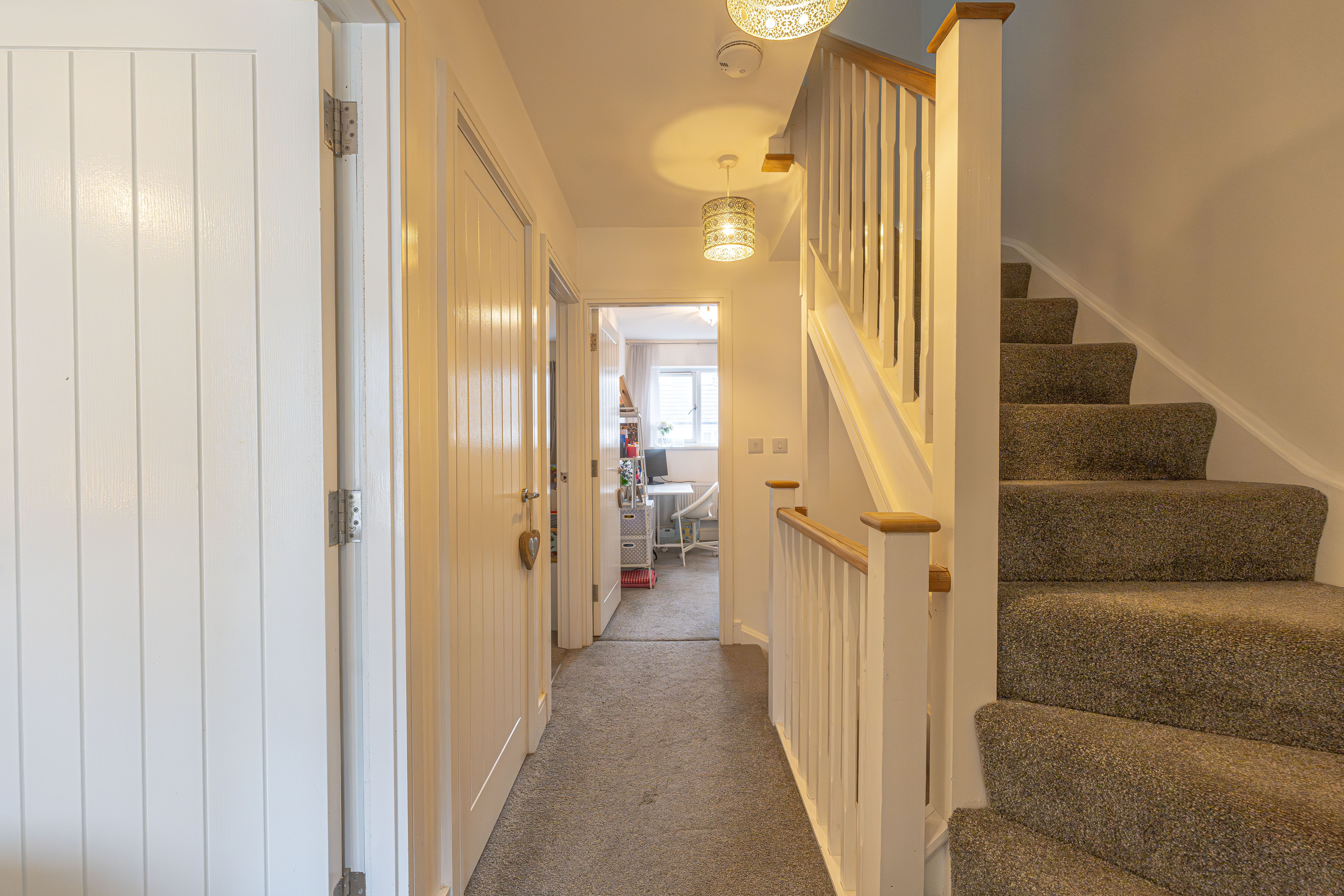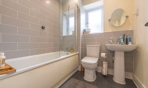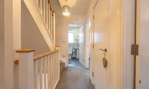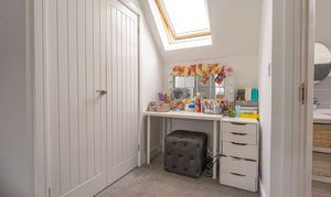 To the first floor we can find the first three bedrooms, two of which are double in size while the third is a comfortable single. The current owners have showcased the practical applications of the space, doubling up with a home office and dressing room. From the hallway we can find a helpful airing cupboard, as well as the family bathroom, featuring a bath tub and overhead shower.