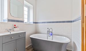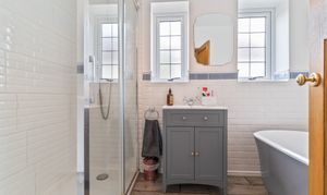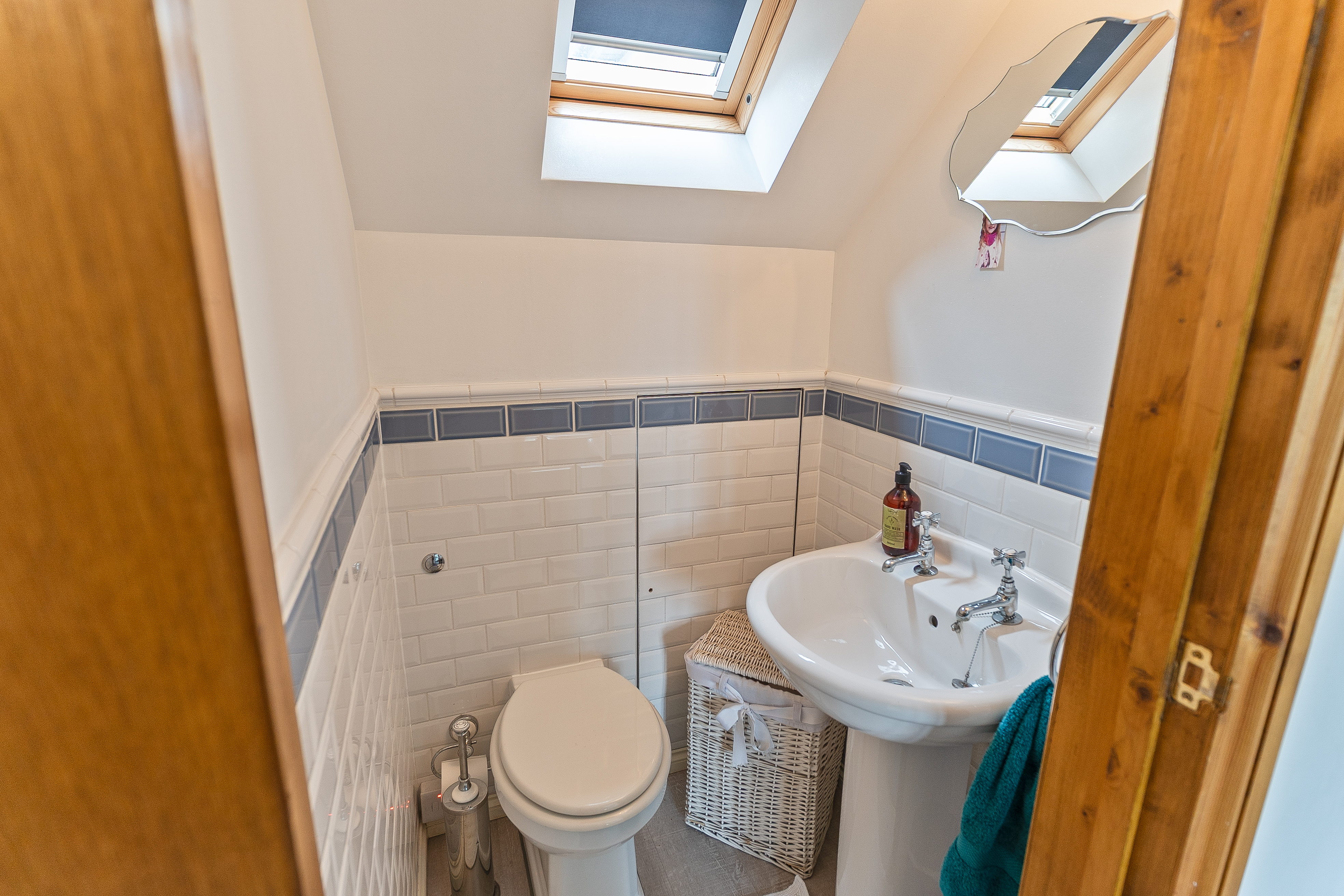 The first floor comprises three well-proportioned bedrooms, including two generous double rooms and a single bedroom ideal for a child’s room or home office. The family bathroom is beautifully finished, featuring both a freestanding bath and a walk-in shower, providing a touch of luxury. A separate WC adds to the practicality of the upstairs layout.