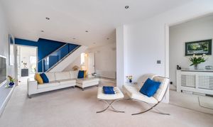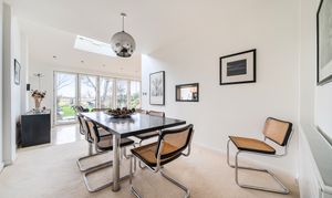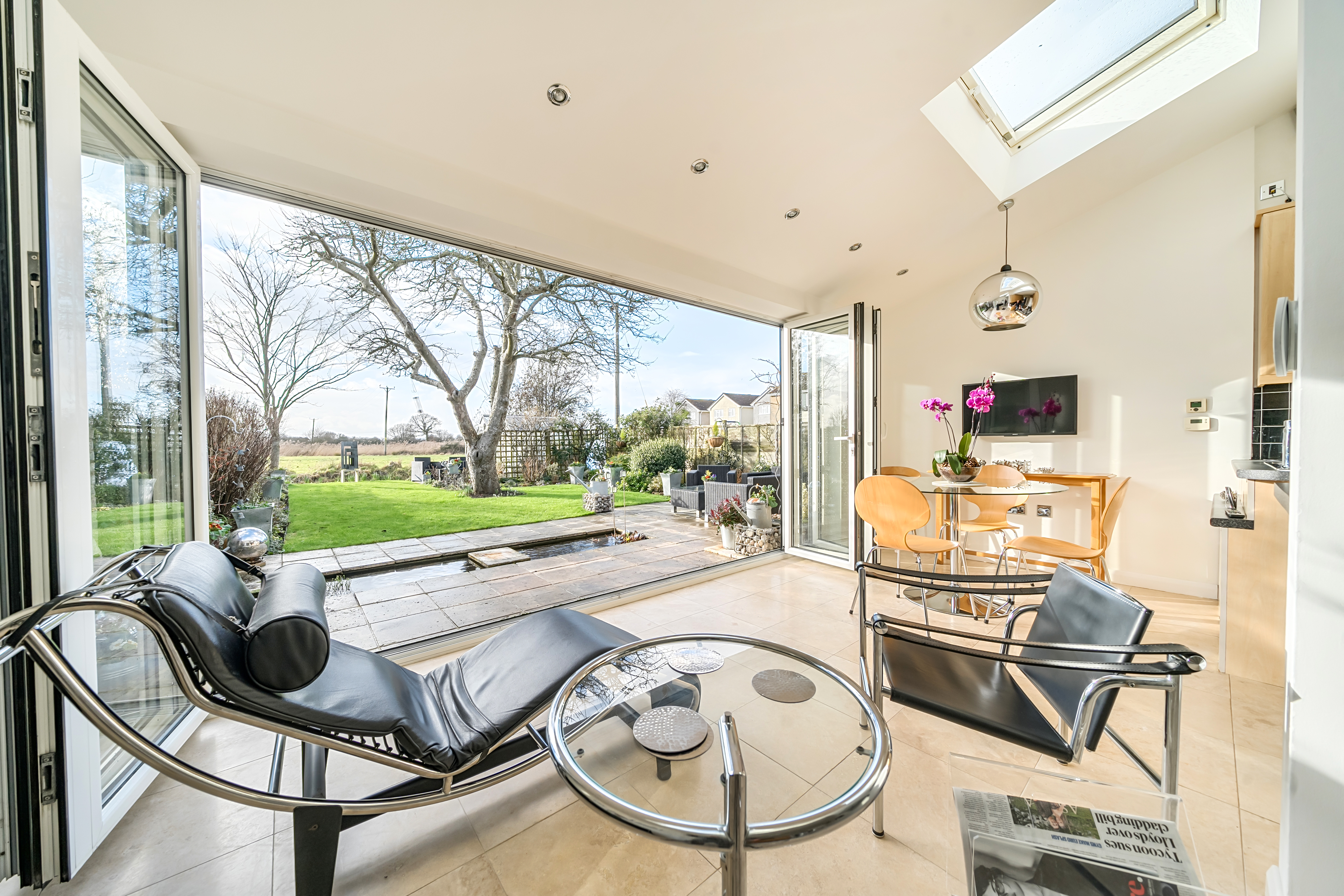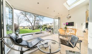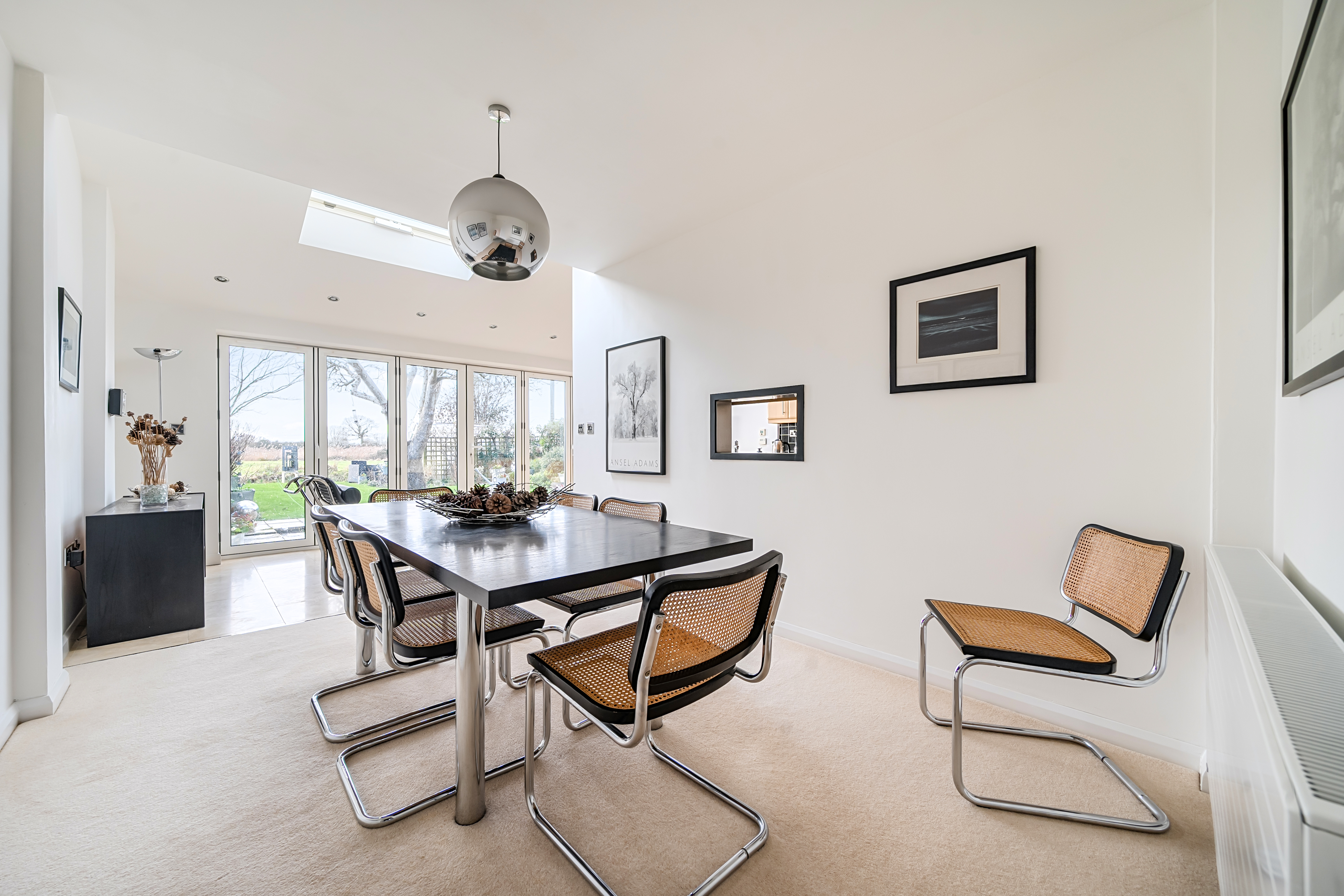 The accommodation is arranged over two floors and is notable for its sense of light, space, and flow, with generous glazing across the rear of the property creating a strong connection between the living areas and the garden beyond.