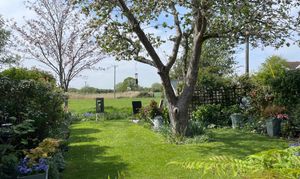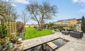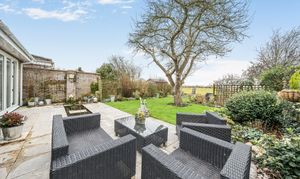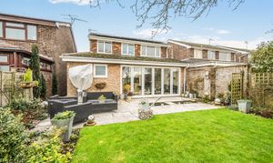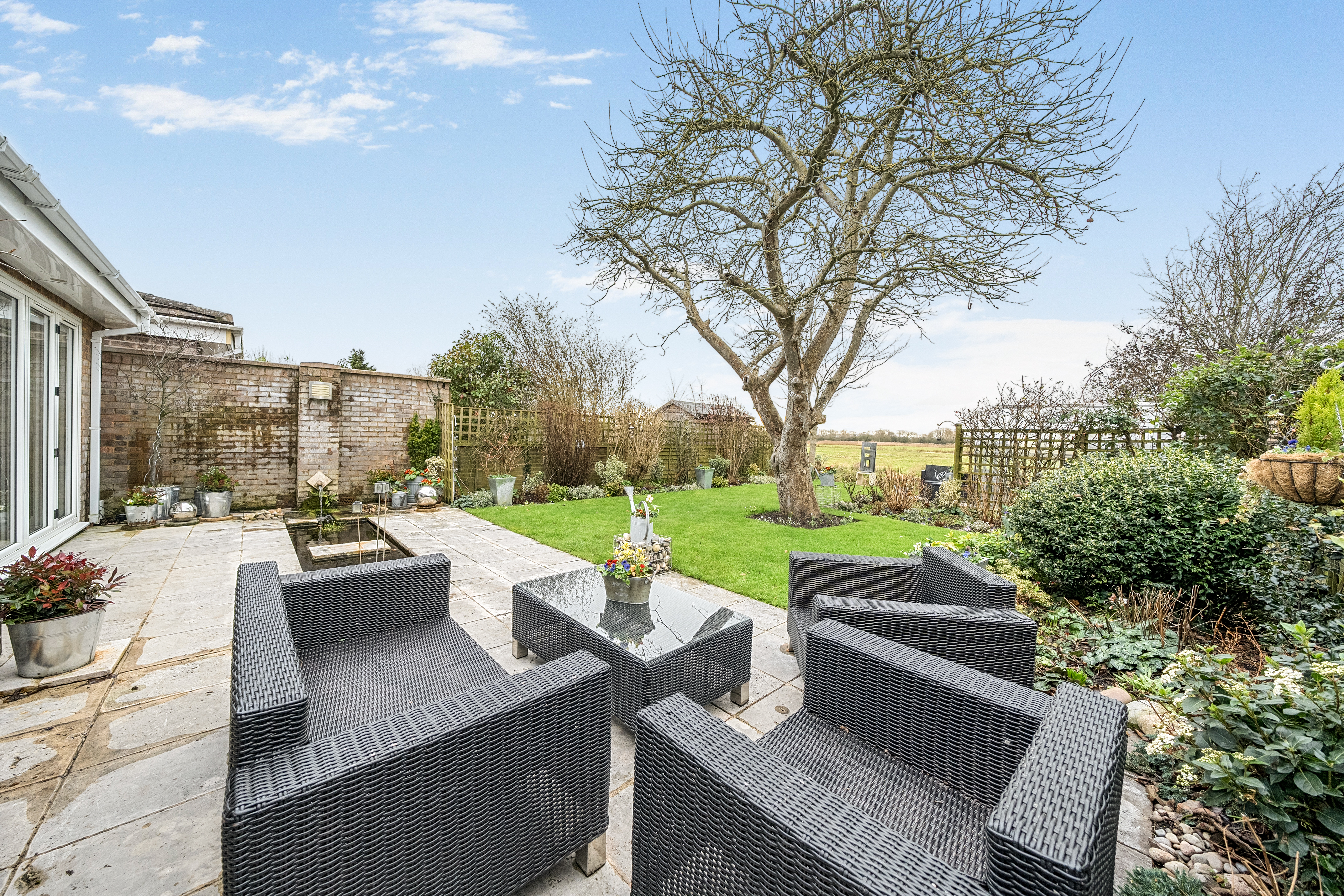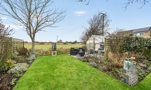 The rear garden has been attractively arranged and is laid mainly to lawn with established planting to the borders. A paved terrace sits directly behind the house, providing a pleasant space for outdoor dining and relaxation, while the open outlook beyond the garden boundary creates a sense of space and privacy. To the front of the property, a driveway provides off-street parking and leads to the integral garage.
