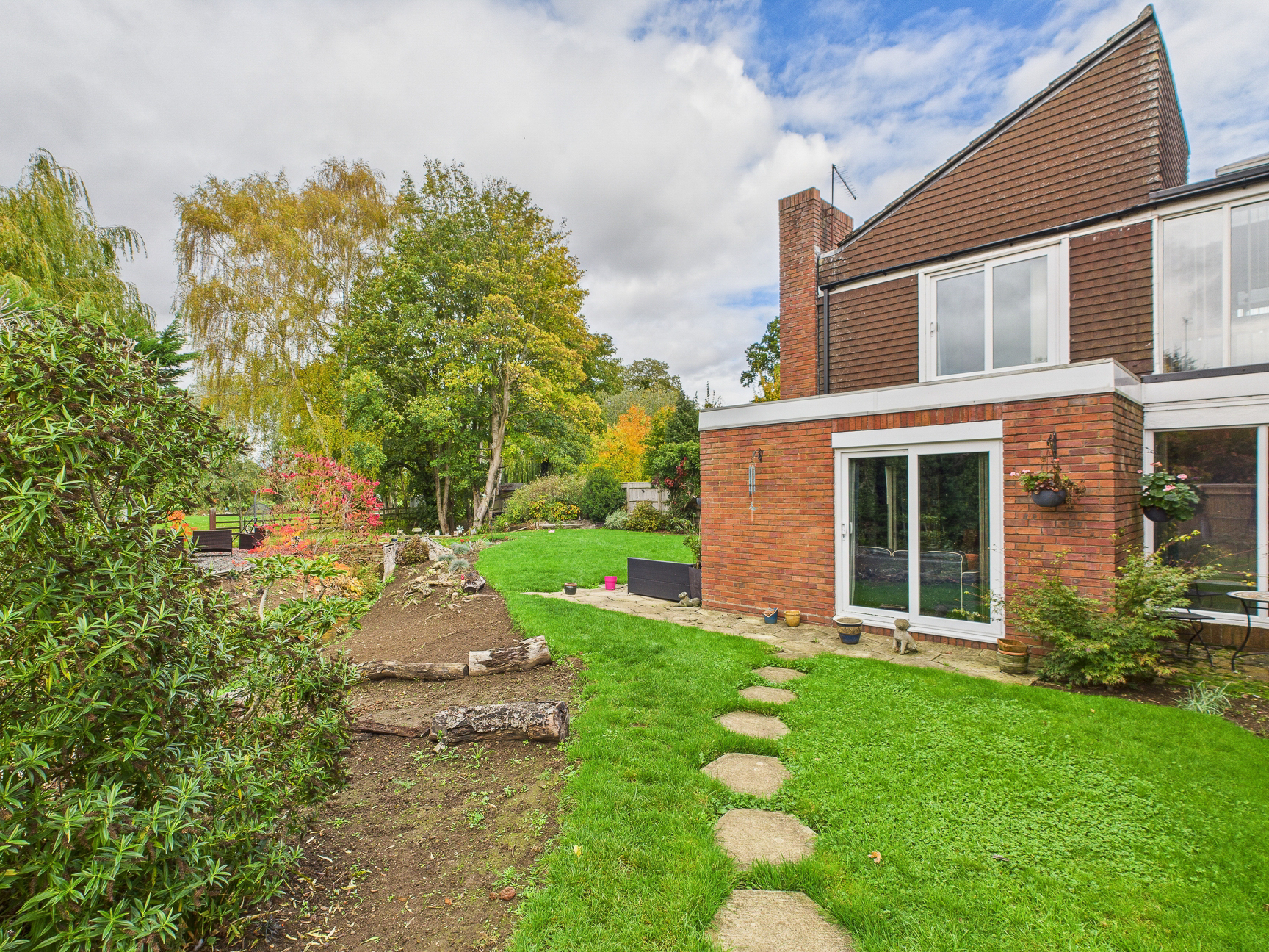 The front garden is laid to lawn with planted areas and two stepping stone pathways leading to the front door.
