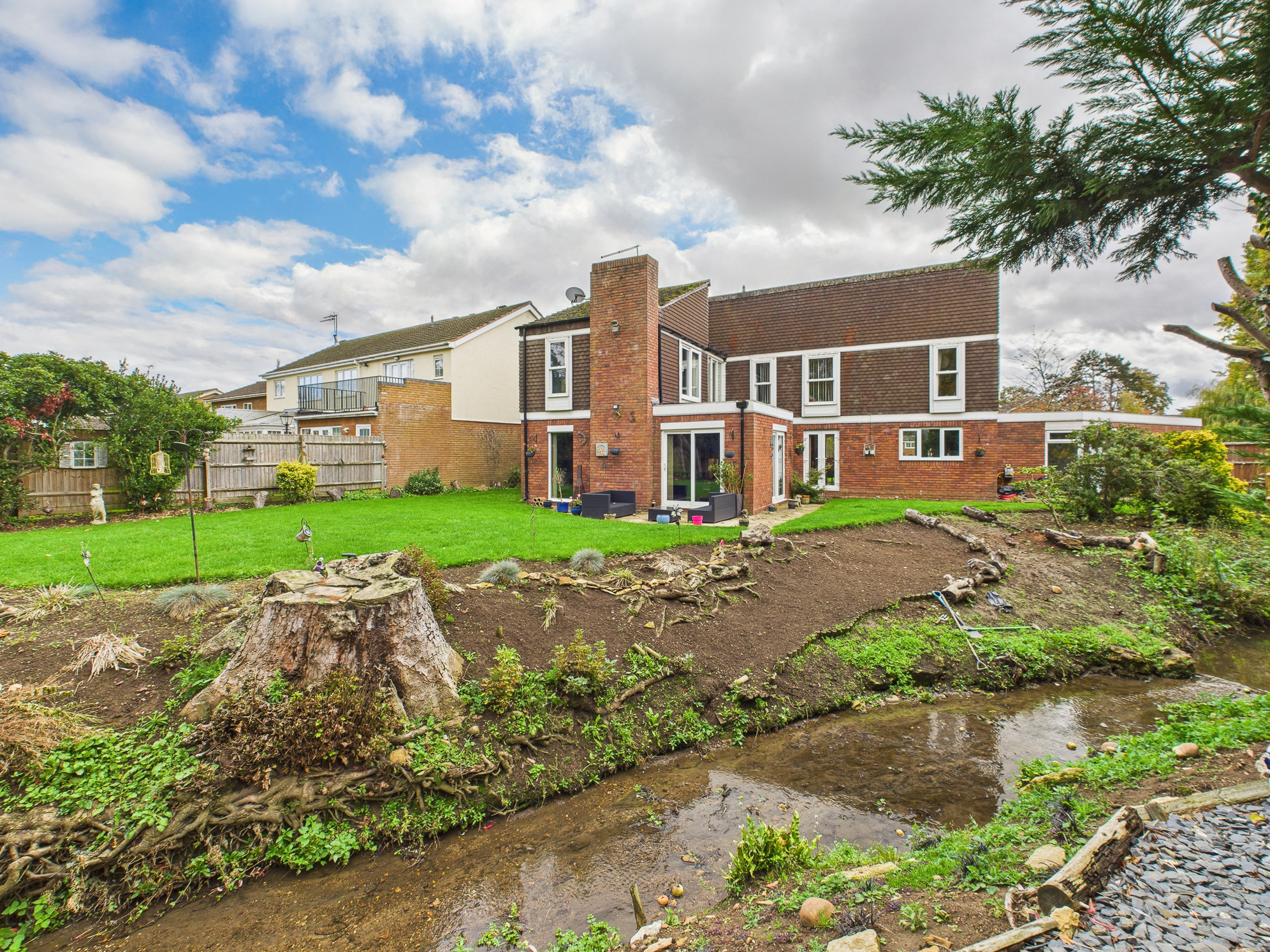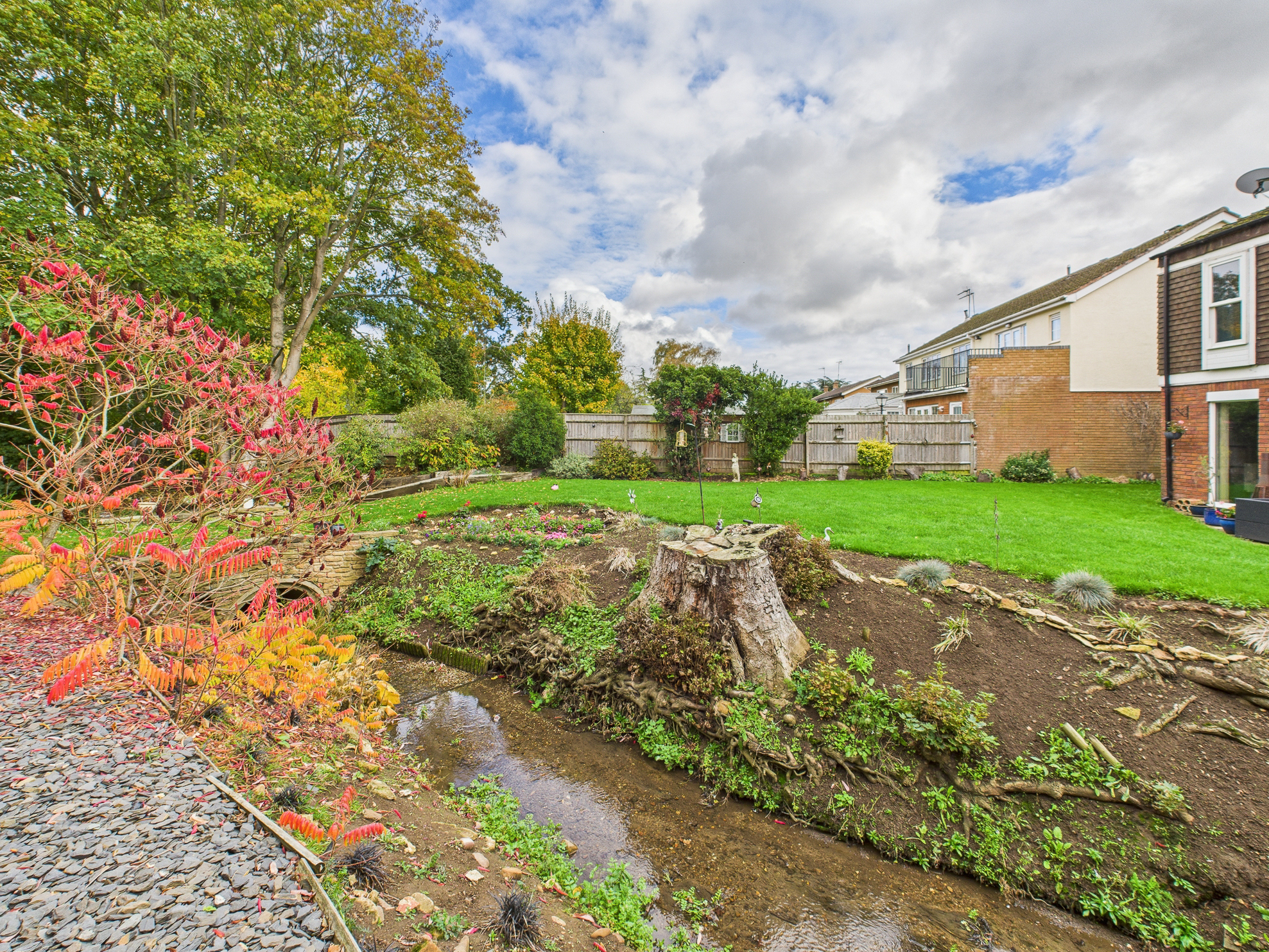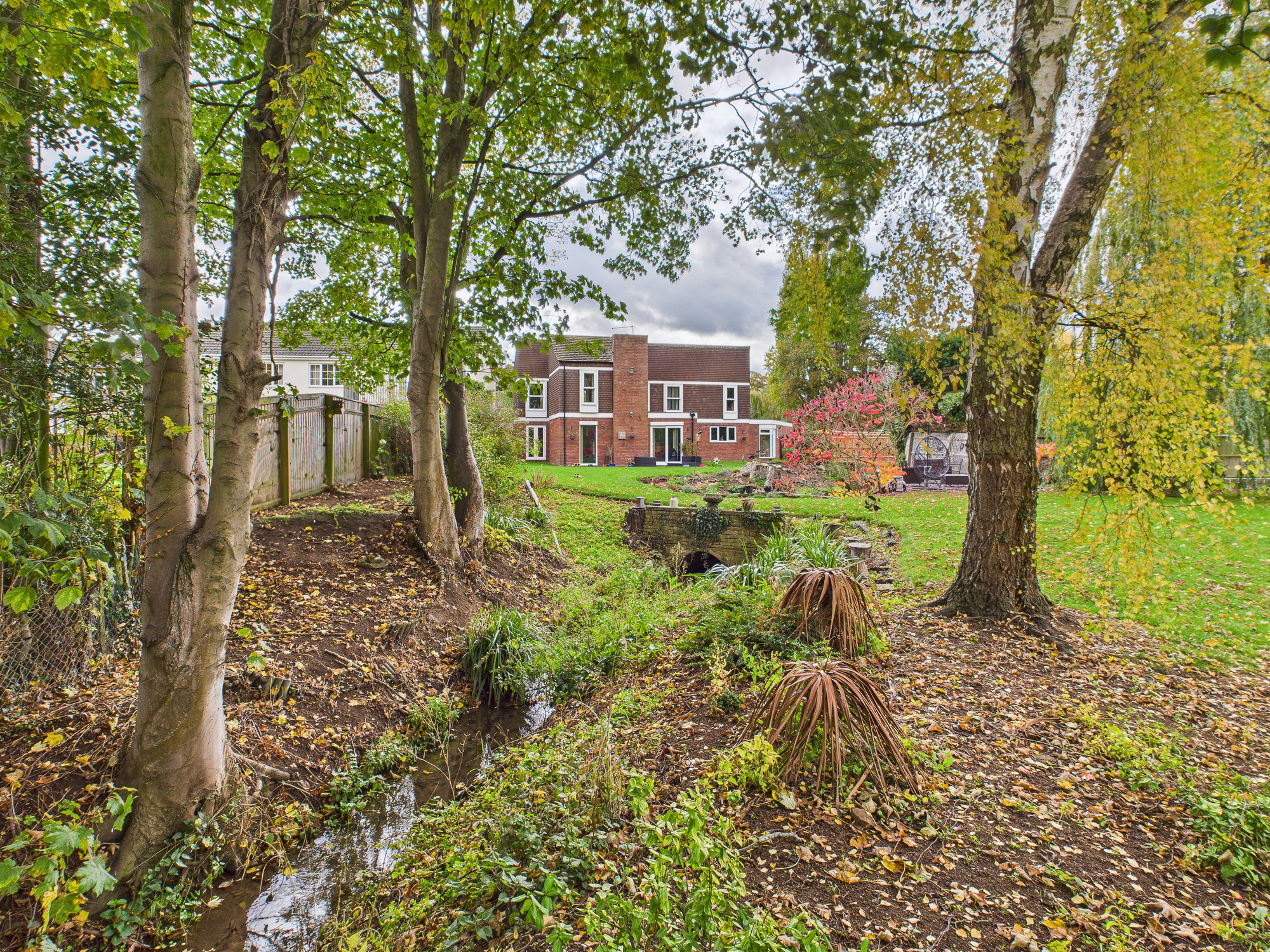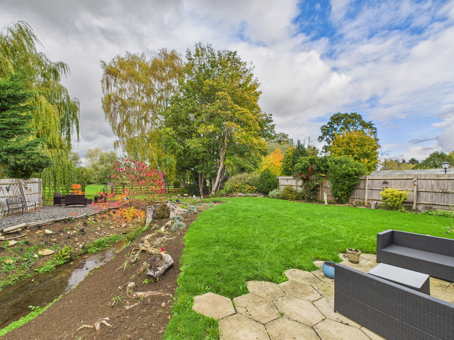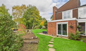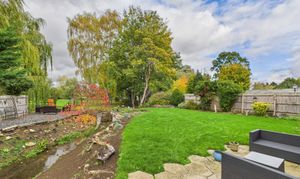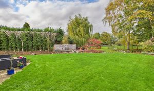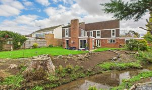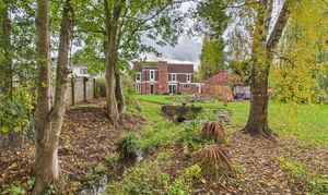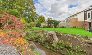 To the rear of the home is a substantial garden of approximately 0.6 of an acre. Extensively laid to lawn with planted areas and a stream running through, complete with a bridge. Adjacent to the property itself is a patio and side access, the boiler room and store. Crossing the bridge the remainder of the garden is an open space backing onto the river Nene. There are three sycamore trees throughout the garden that benefit from protection orders.