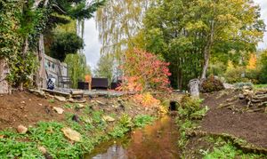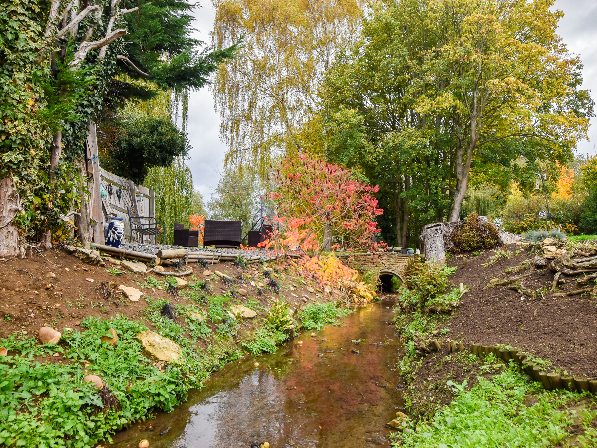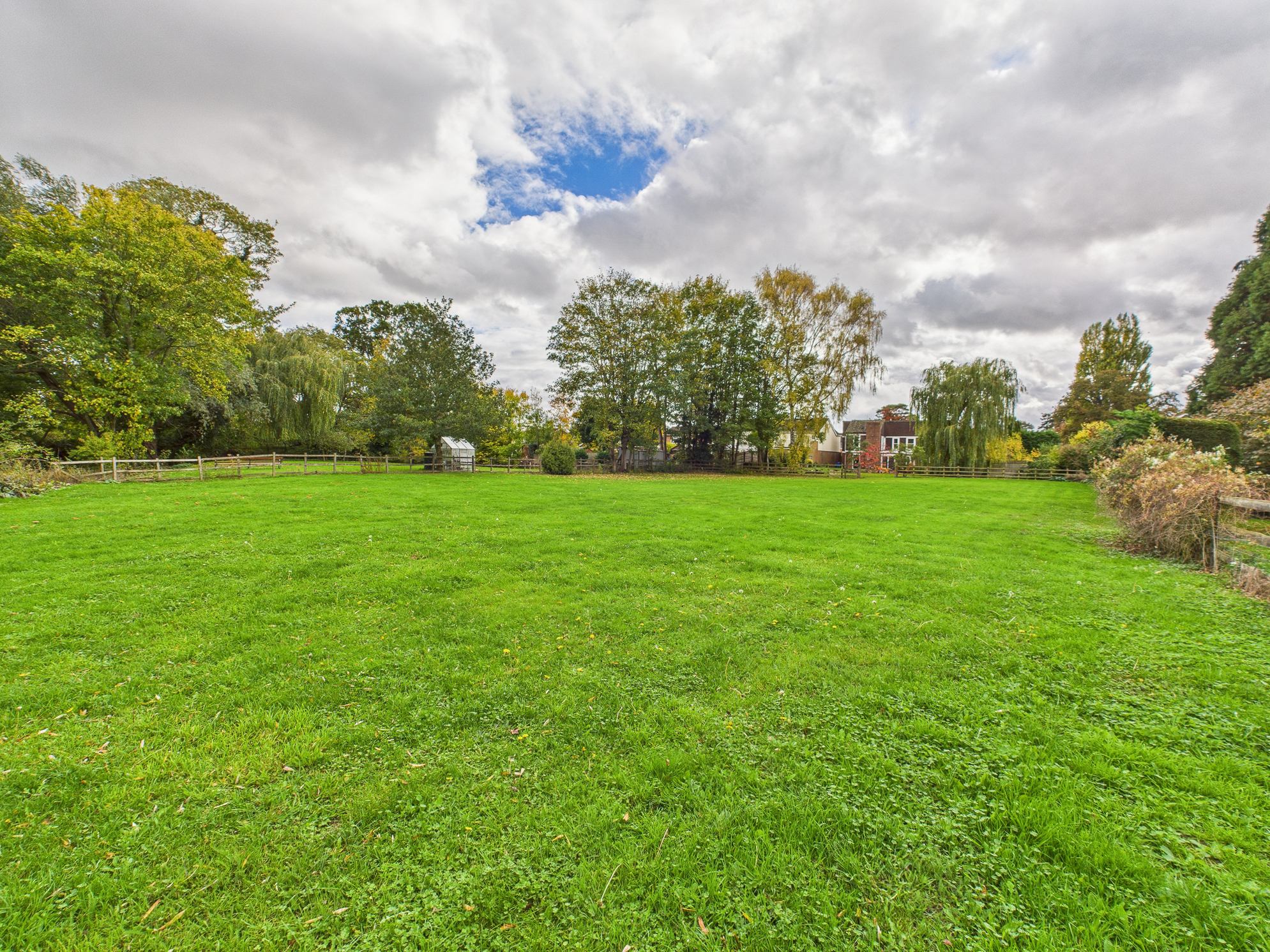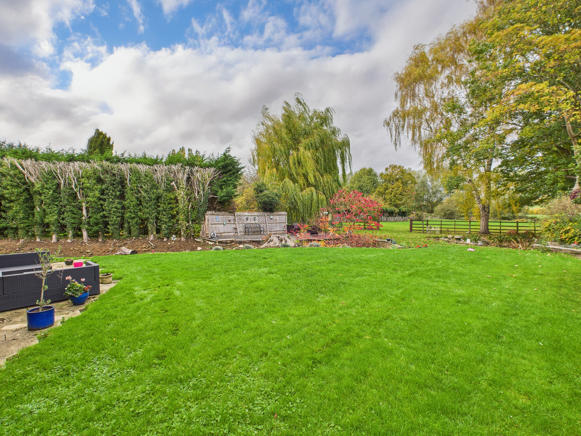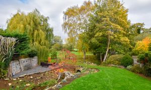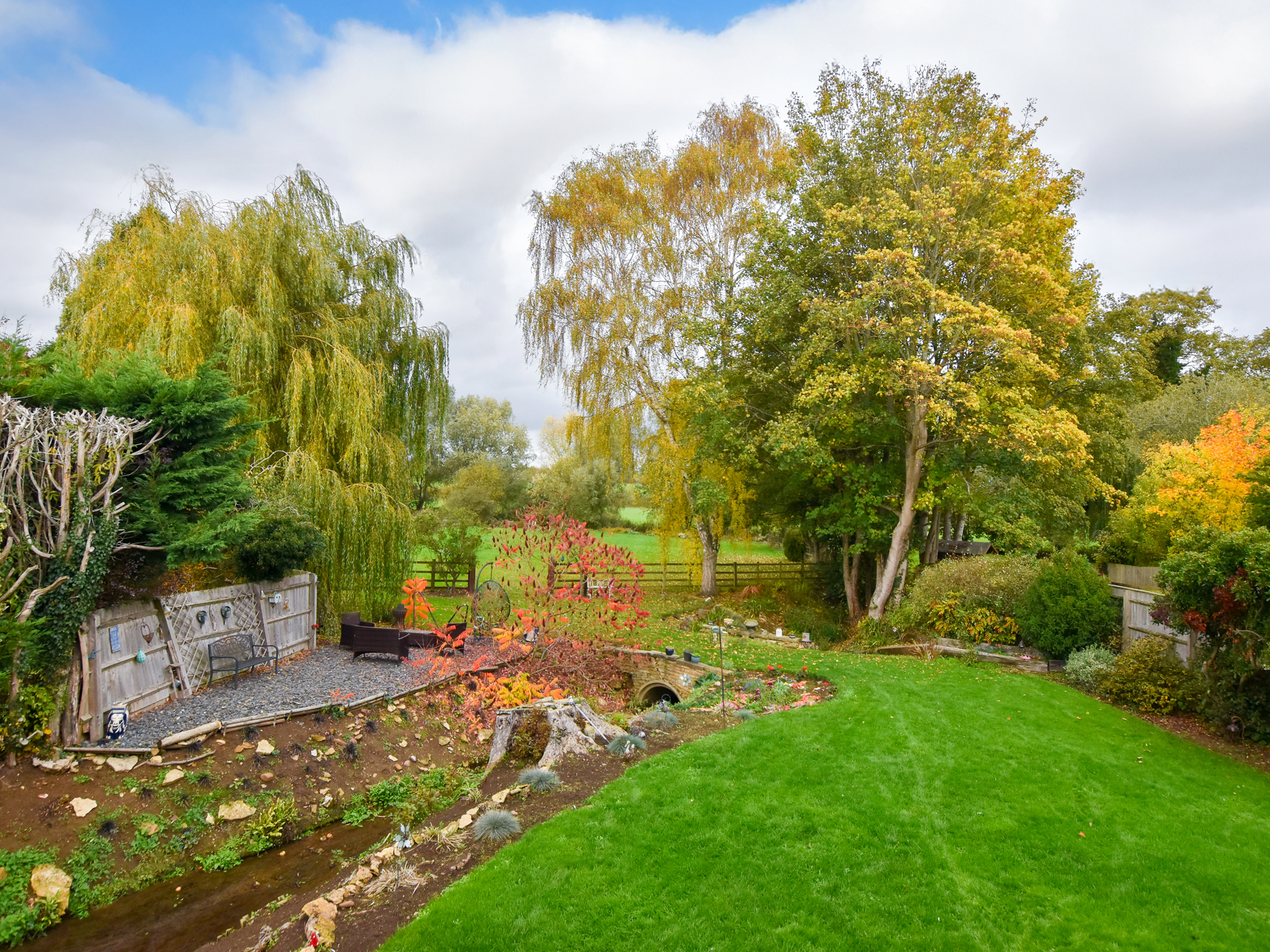 To the rear of the home is a substantial garden of approximately 0.6 of an acre. Extensively laid to lawn with planted areas and a stream running through, complete with a bridge. Adjacent to the property itself is a patio and side access, the boiler room and store. Crossing the bridge the remainder of the garden is an open space backing onto the river Nene. There are three sycamore trees throughout the garden that benefit from protection orders.