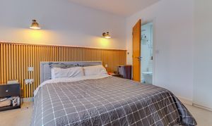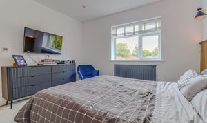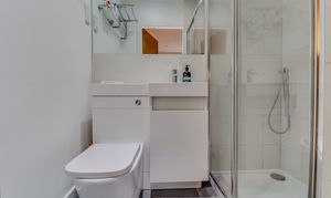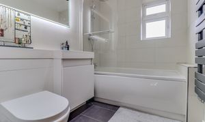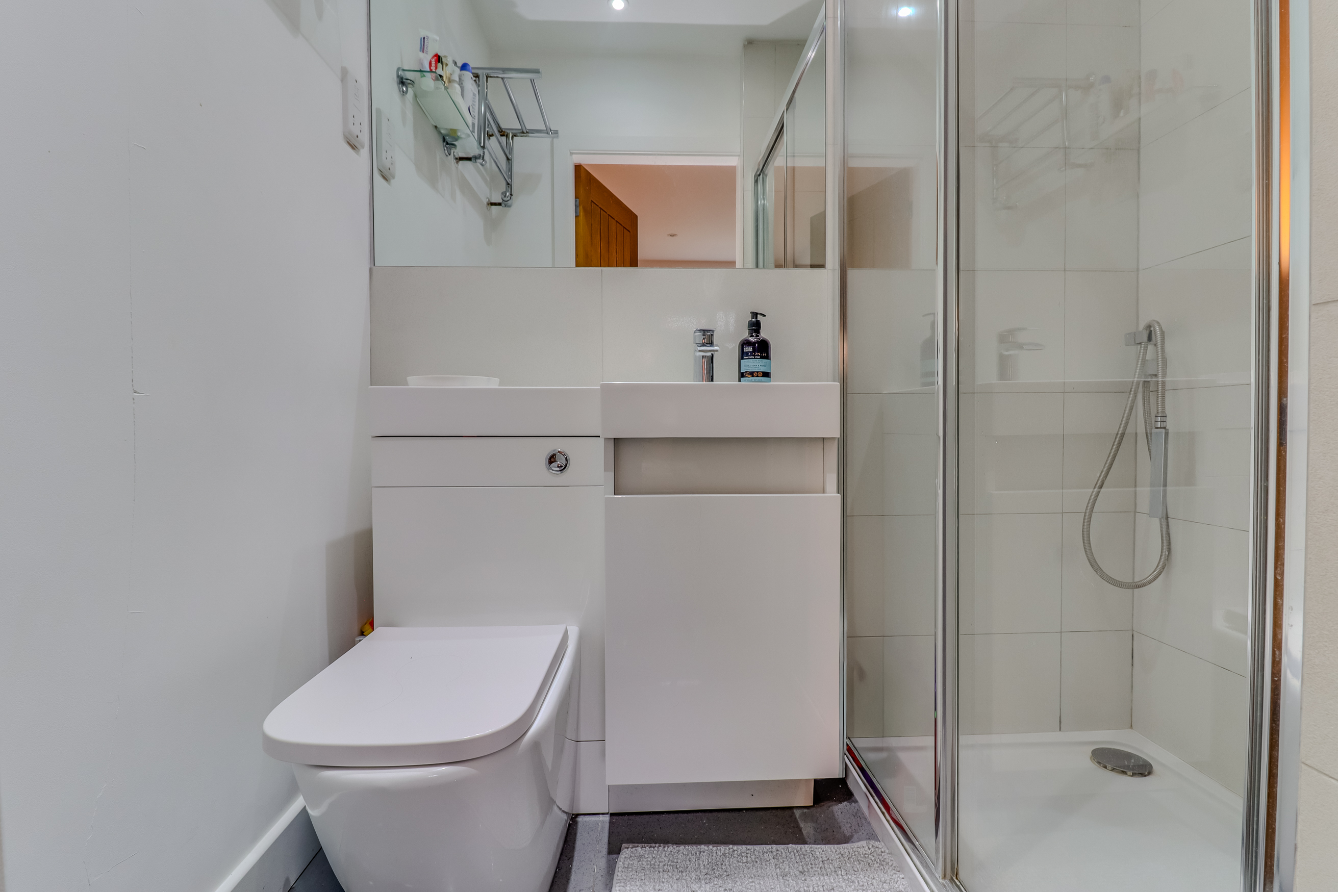 Upstairs, the landing is naturally lit via a roof light and includes useful storage. There are three bedrooms in total – two spacious doubles (both with built-in wardrobes) and a third single room ideal as a nursery, office, or guest room. The principal bedroom includes its own en-suite shower room with modern fittings and tasteful tiling, while the family bathroom offers a sleek, fully tiled finish with a bath and overhead shower, integrated vanity unit, LED mirror and WC.