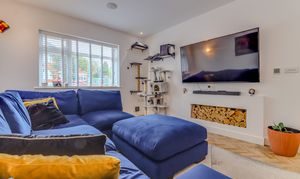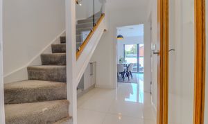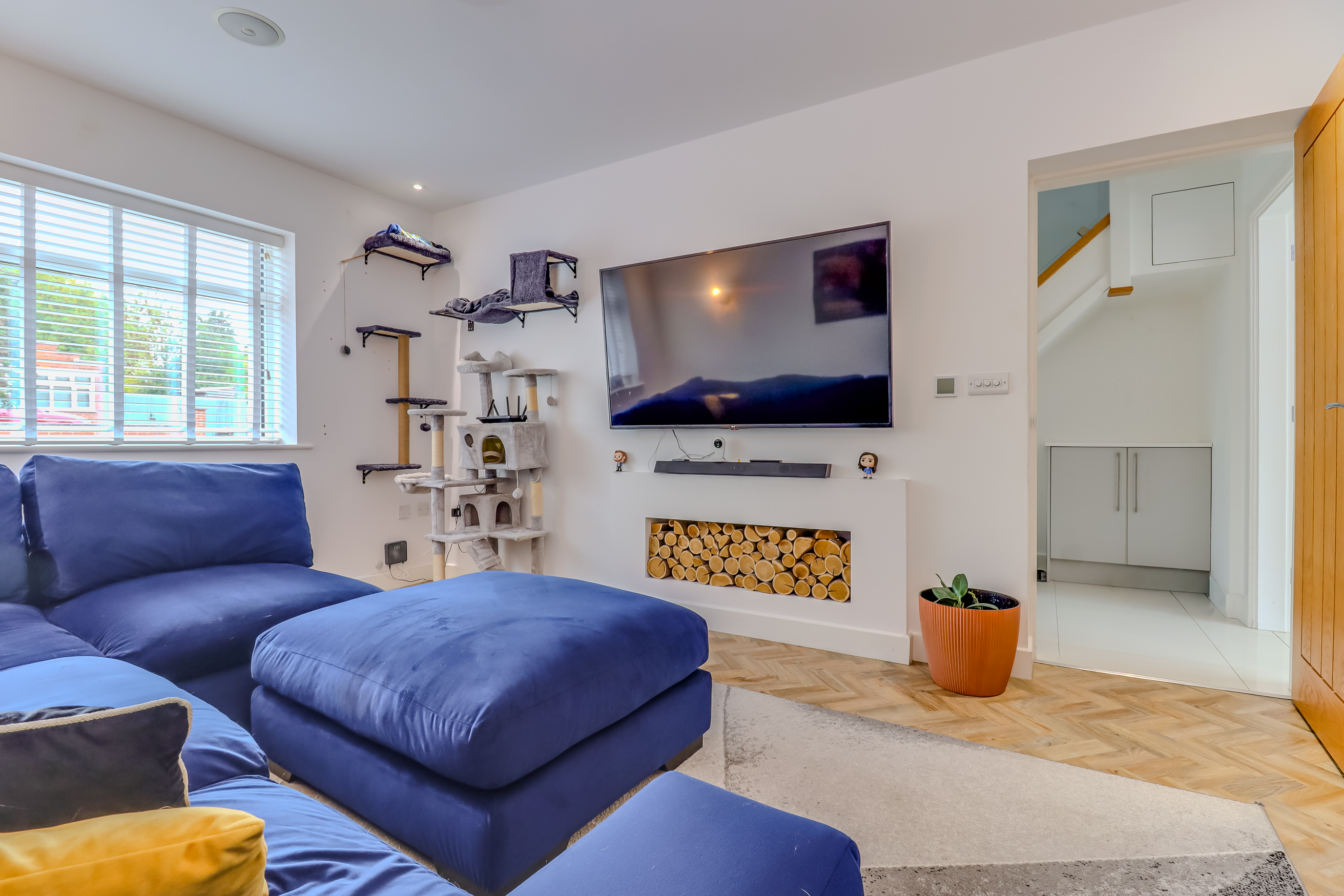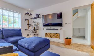 Step inside and you're greeted by a bright entrance hall featuring a modern glass balustrade and handy downstairs cloakroom with sleek vanity unit, concealed WC, and granite-effect tiling. The living room, located to the front, boasts herringbone-style LVT flooring, bespoke window blinds, a striking log-effect feature wall and ambient LED lighting – all combining to create a cosy yet modern space.