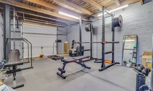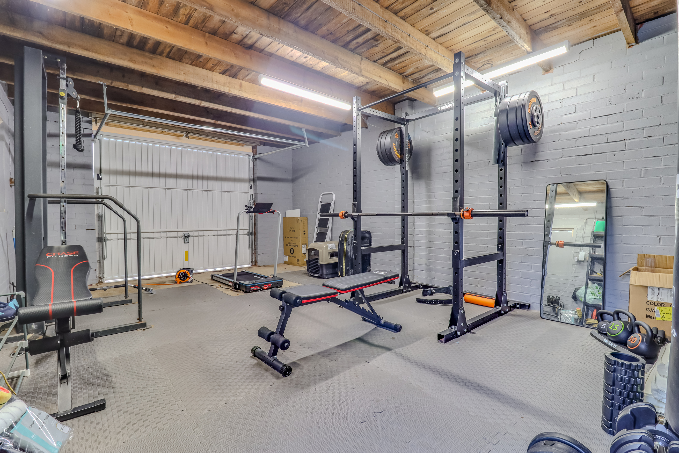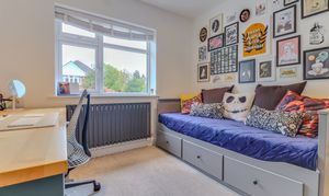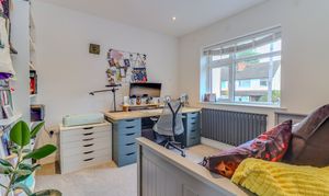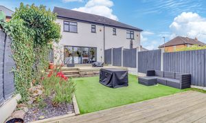 To the rear, the garden has been thoughtfully landscaped with a combination of decking, artificial turf, decorative gravel and mature planting. The garage, accessed from the garden via a side door, is currently being used as a home gym, offering flexible space for a variety of uses.