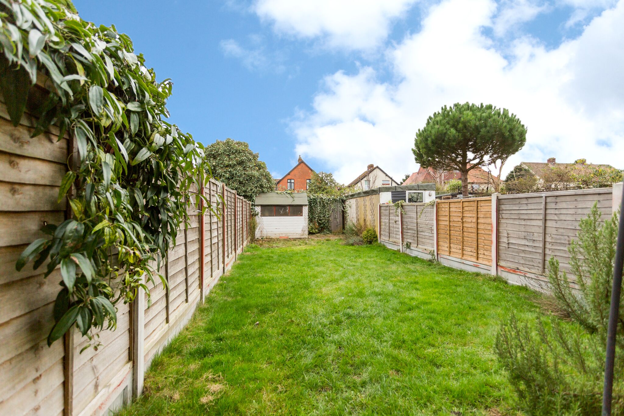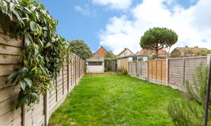 - South-facing rear garden with storage shed