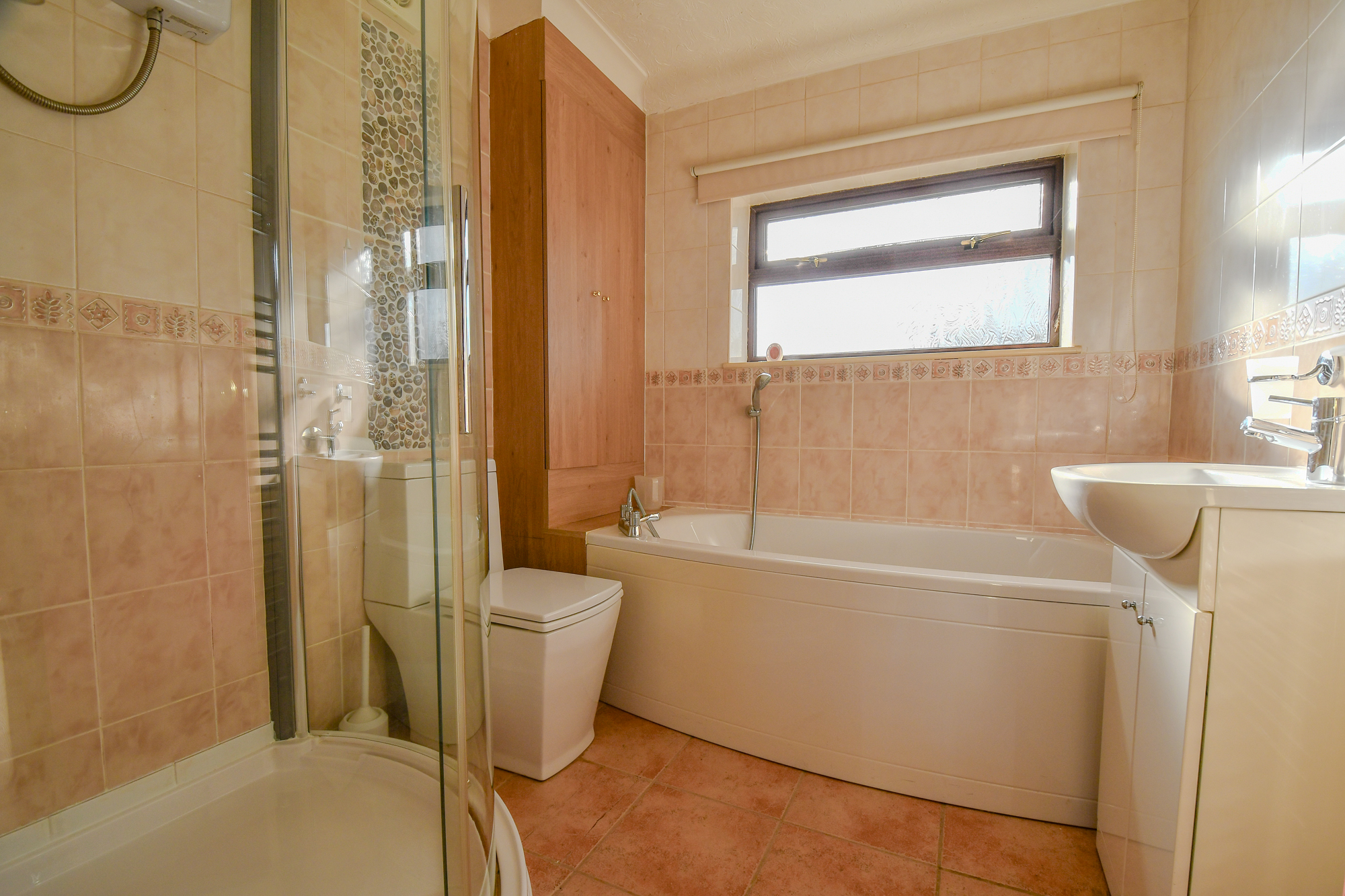 A well-proportioned family bathroom featuring a four-piece suite comprising a corner shower, separate bath, WC, and wash basin set within a vanity unit. A frosted window provides natural light while maintaining privacy, and there’s built-in storage for everyday essentials.