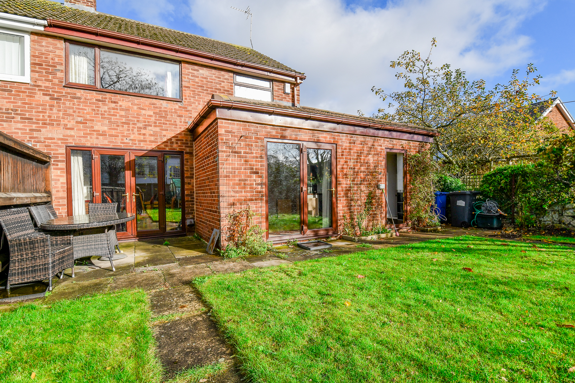 Outside, the rear garden is a real highlight, offering a large lawn, patio seating area, and greenhouse, perfect for families, gardeners, or anyone who values outdoor space.