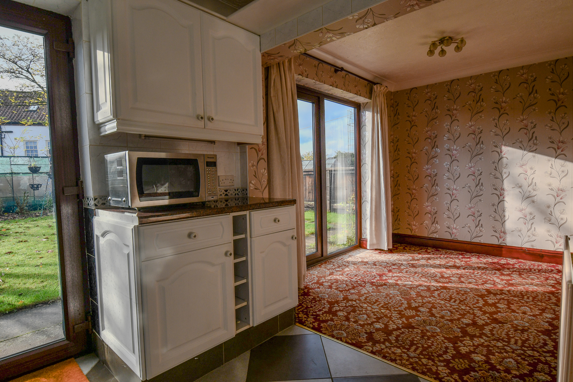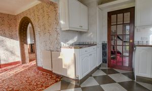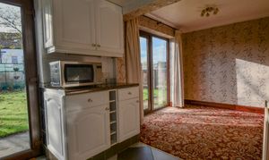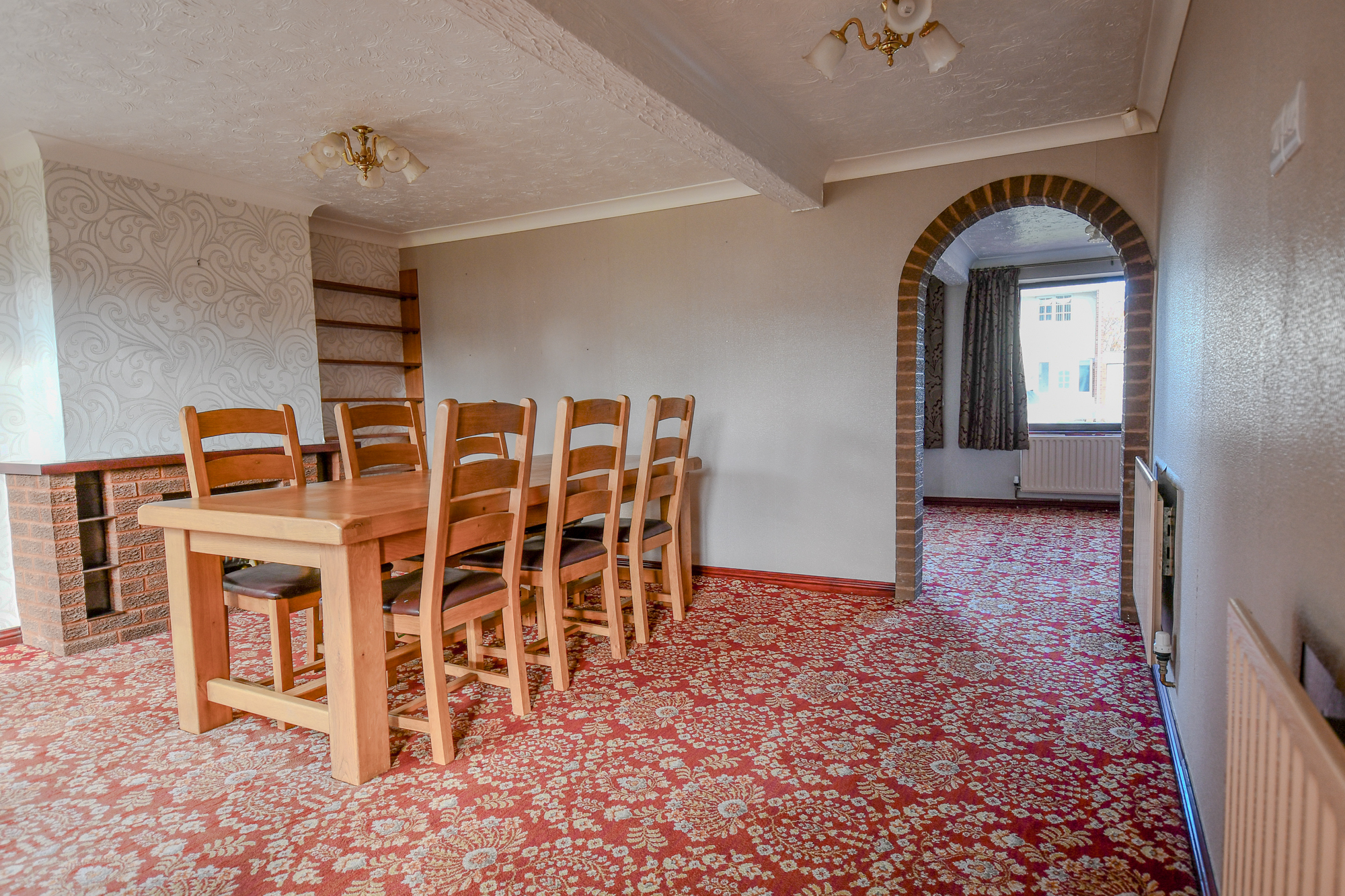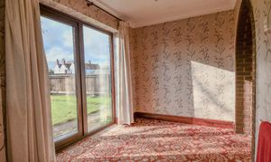 A bright and versatile space overlooking the rear garden, ideal as a breakfast area or snug. Sliding patio doors flood the room with natural light and open directly onto the garden. Currently finished with patterned wallpaper and carpet, the room offers clear potential for modernisation to suit contemporary living. Its open layout through an arched brick feature links seamlessly to the dining area, creating a flexible and airy ground-floor layout ready for transformation.