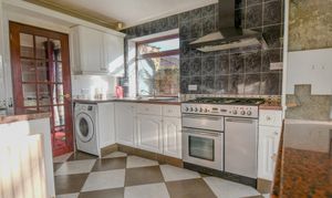 A spacious kitchen with a practical layout and plenty of potential for updating. Fitted with a range of wall and base units, the space includes worktops with tiled splashbacks, a stainless-steel range cooker with extractor, and plumbing for appliances. The kitchen connects neatly to the dining and breakfast areas, giving the home an open and flexible flow.