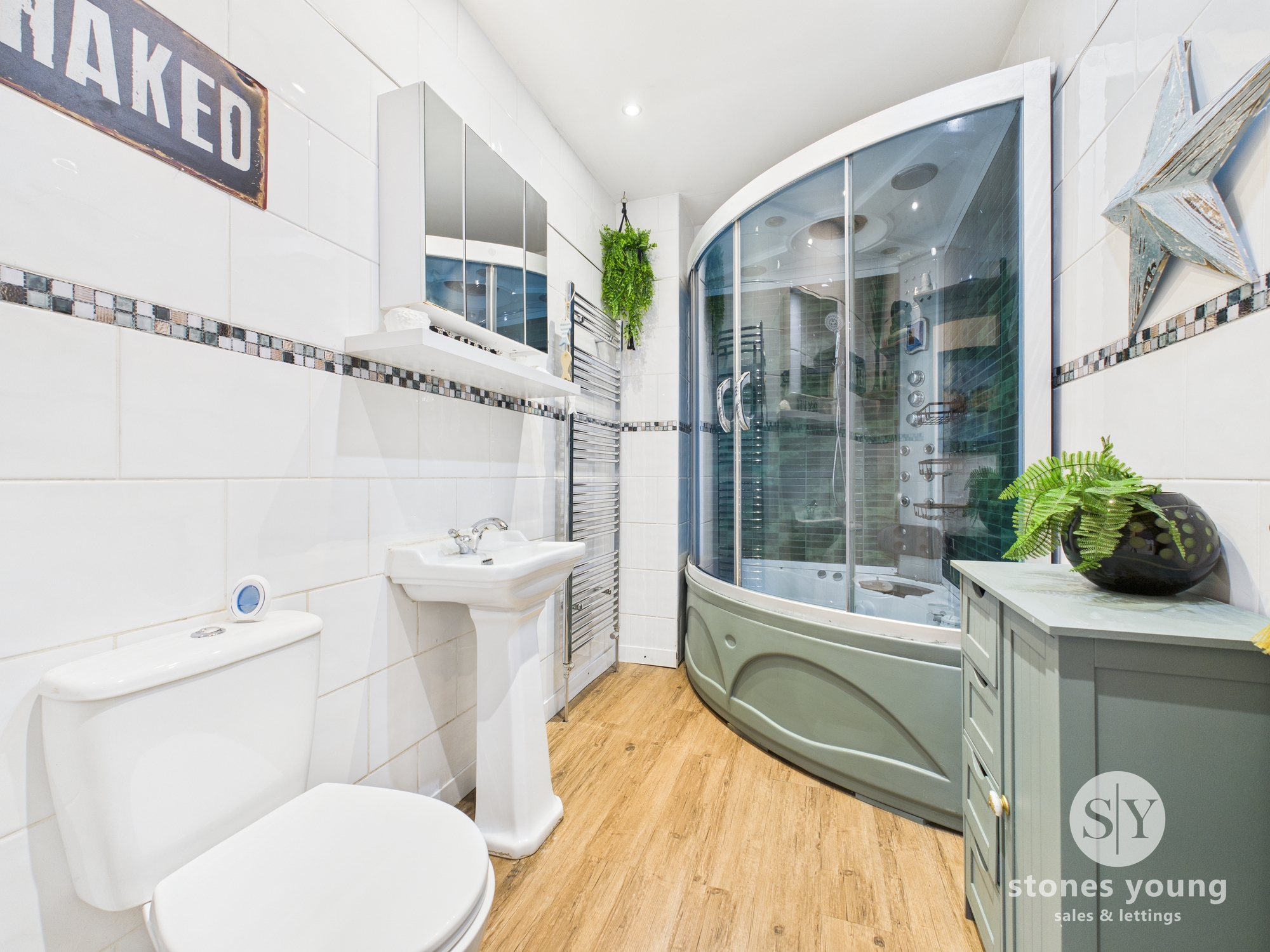 Three piece suite with Jacuzzi bath and shower, Wc, sink, heated towel rail, vinyl flooring