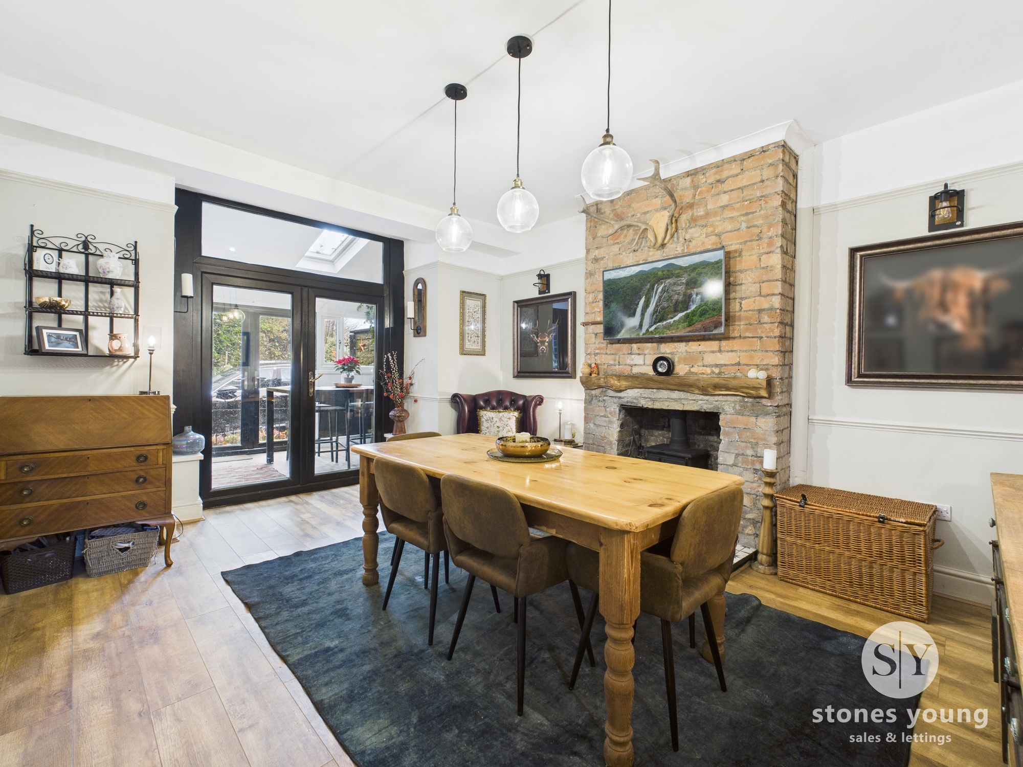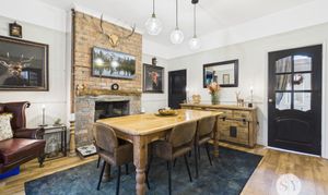 Internally, the property has been modernised throughout while maintaining the character which the property was designed to exude with wood burners in each of the reception rooms, exposed brick chimney and rustic kitchen design. The reception rooms both offer versatility for living rooms or formal dining rooms with the front room currently posing as a cosy snug where you can enjoy winter evenings by the fire. The second reception room is presented as a dining room where you can access the kitchen dining area or open up the french doors where a vast open plan living arrangement can be created. The kitchen dining space has been intelligently designed within the boundaries of the home where you’ll find space for all your appliances, ample storage and plentiful worktops which seamlessly flows into the dining area.