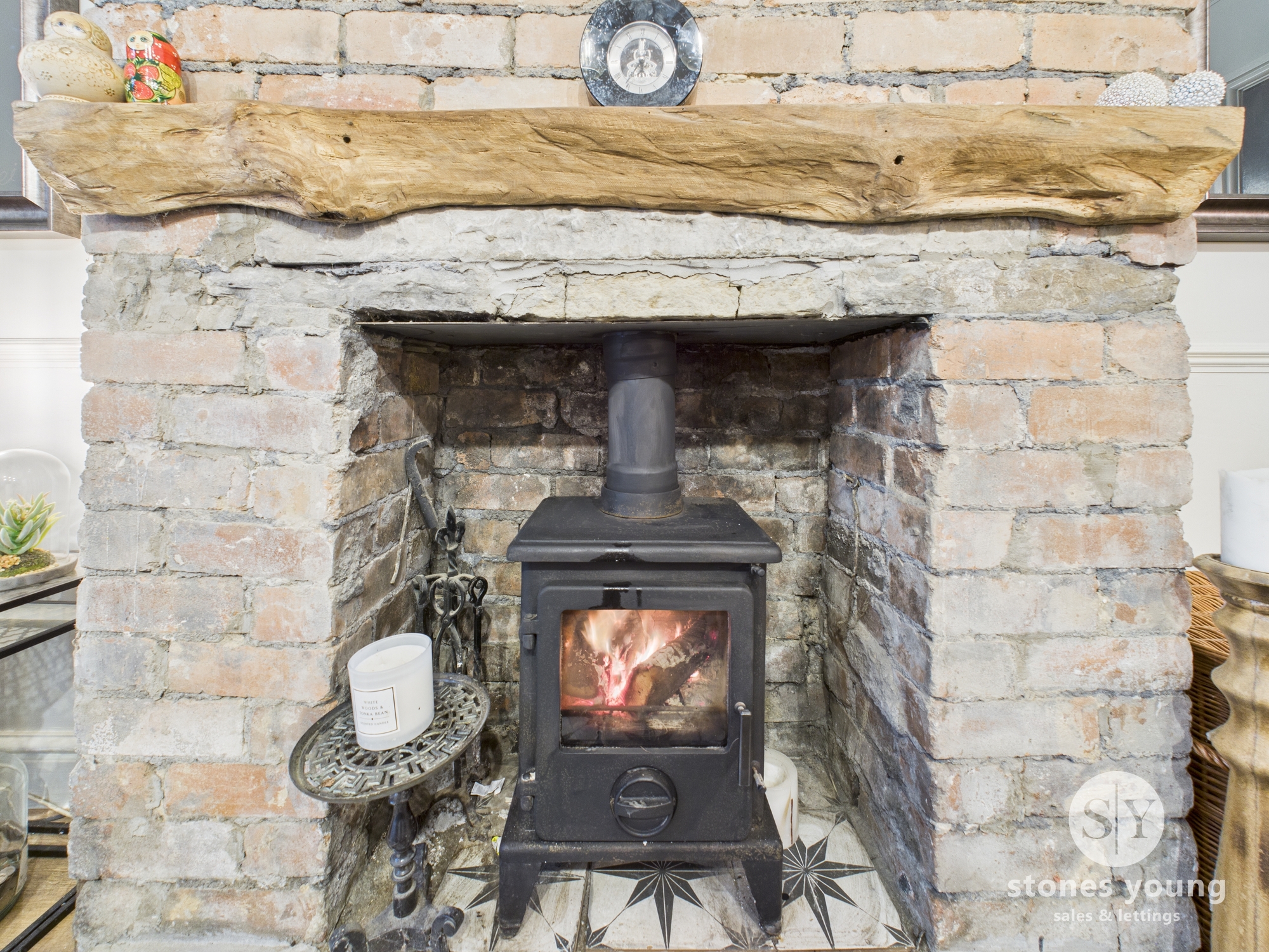 Laminate flooring, multifuel stove with marble hearth, panel radiator, upvc double glazed bay window