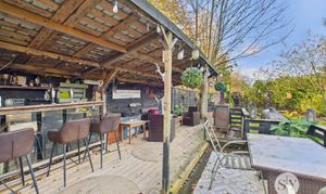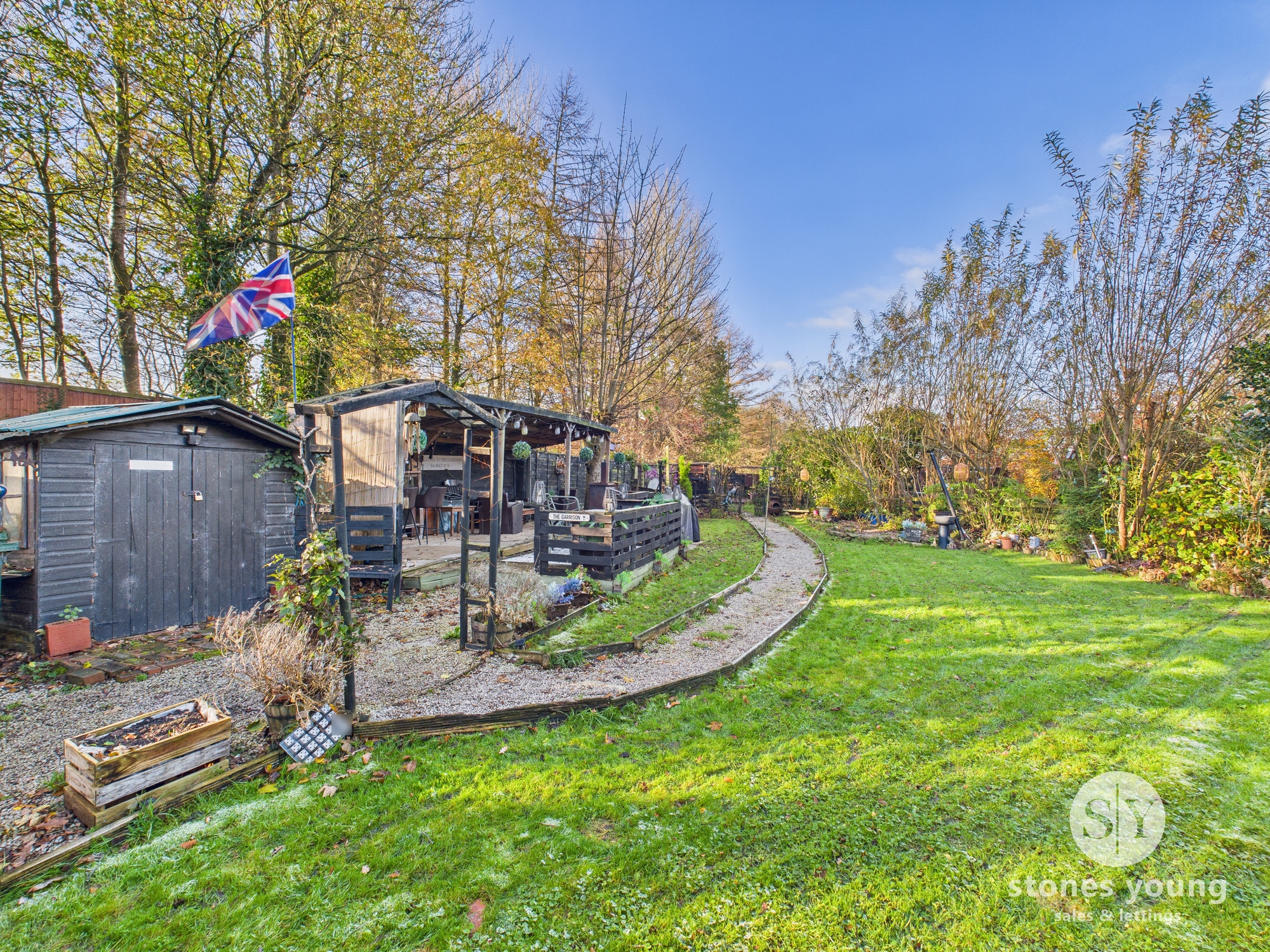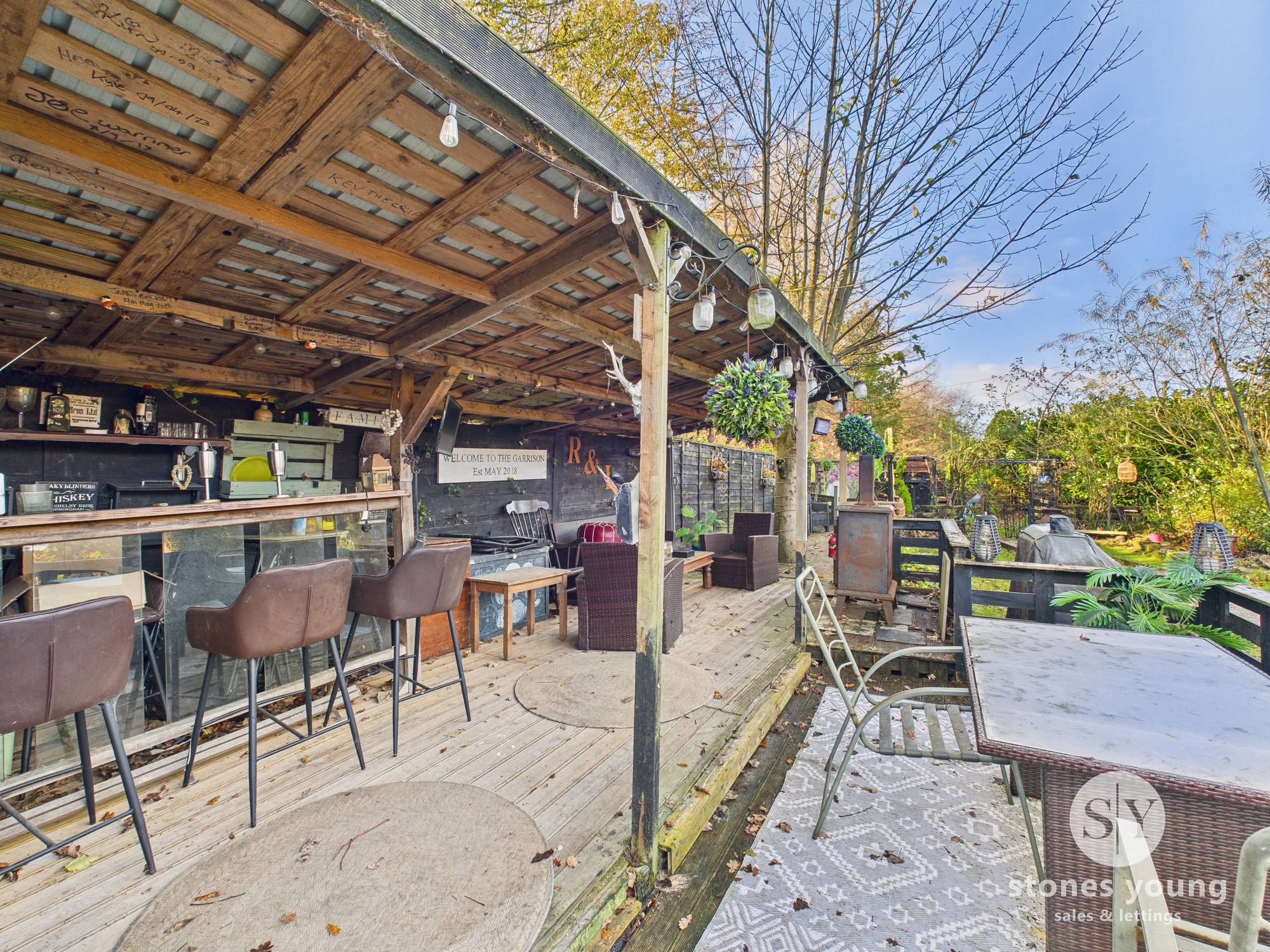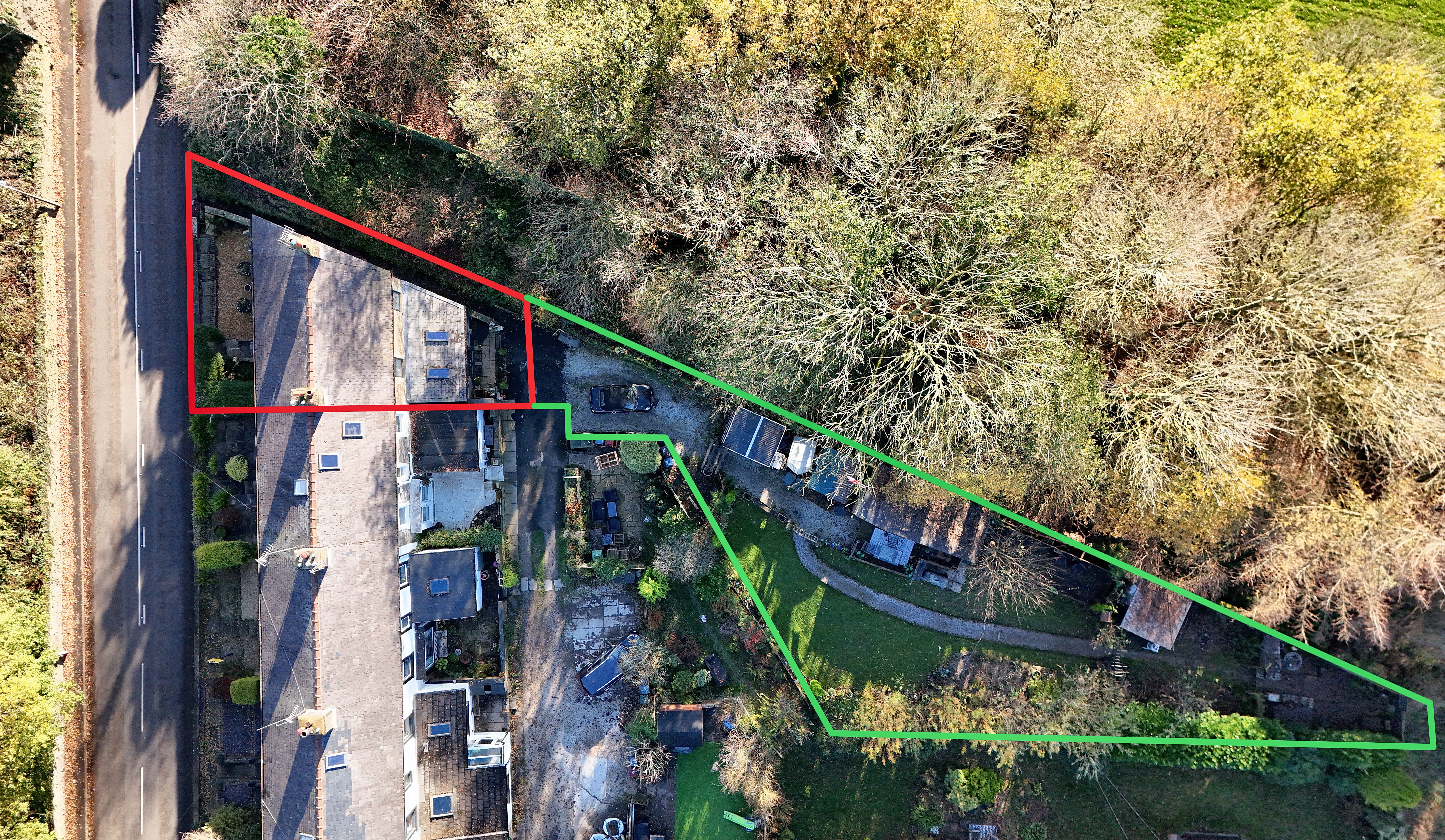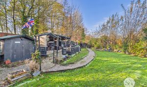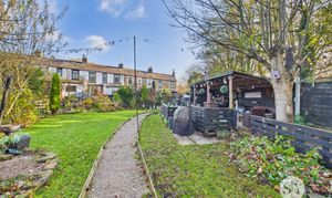 Externally, the property enjoys a spectacular rear garden which is currently on a rolling yearly rent with Huntroyd Estates and has been in agreement for over 50 years. The current owners have utilised the space to create car parking for three cars, a lawn for family enjoyment and a large entertaining/bar area for friends to take full advantage of. The rented land is highlighted green on our birdseye photo. The outlines are given as an approximate guide and should be confirmed by a legal representative.