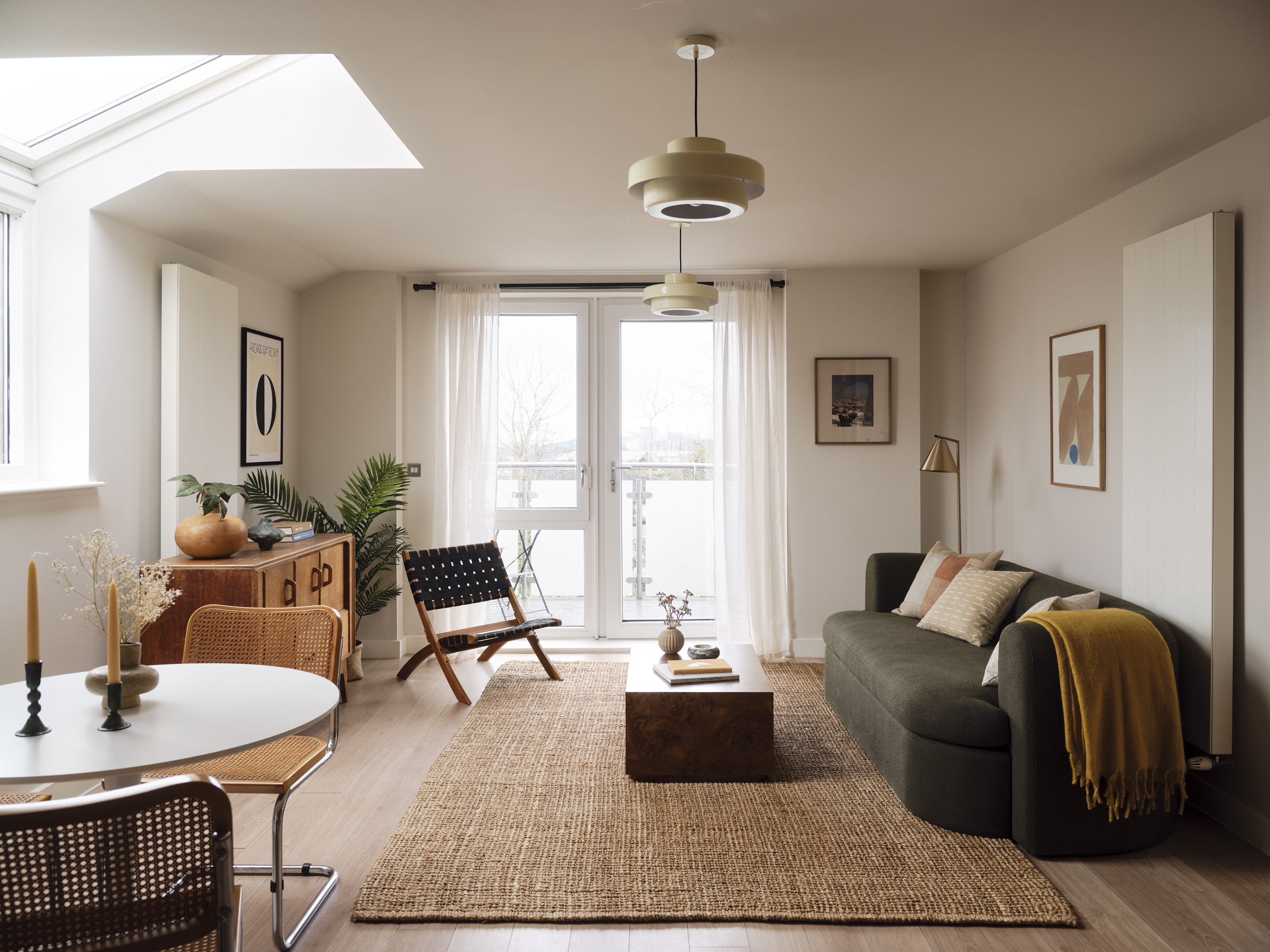 The main living area is flooded with light thanks to wall-to-wall windows and a generous skylight overhead, making even grey January afternoons feel optimistic. A balcony extends from the main living space, with far-reaching westerly views, perfect for sunset gazing or a quiet glass of something at the end of the day. The principal bedroom has its own en-suite shower room, while both bedrooms have built-in wardrobes, and there’s a hallway cupboard for life’s necessary clutter. It’s a home that works quietly in the background, leaving you free to get on with living.