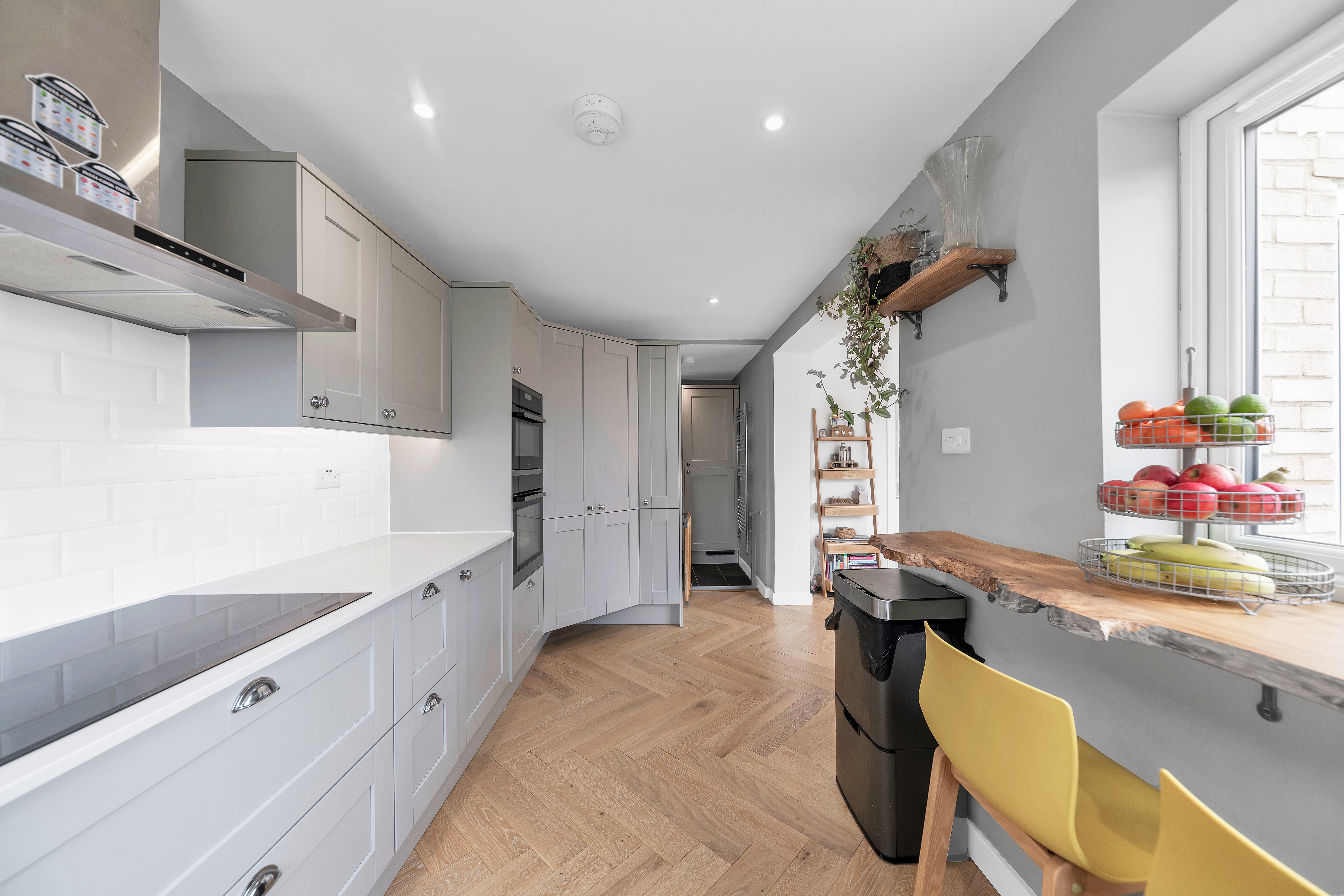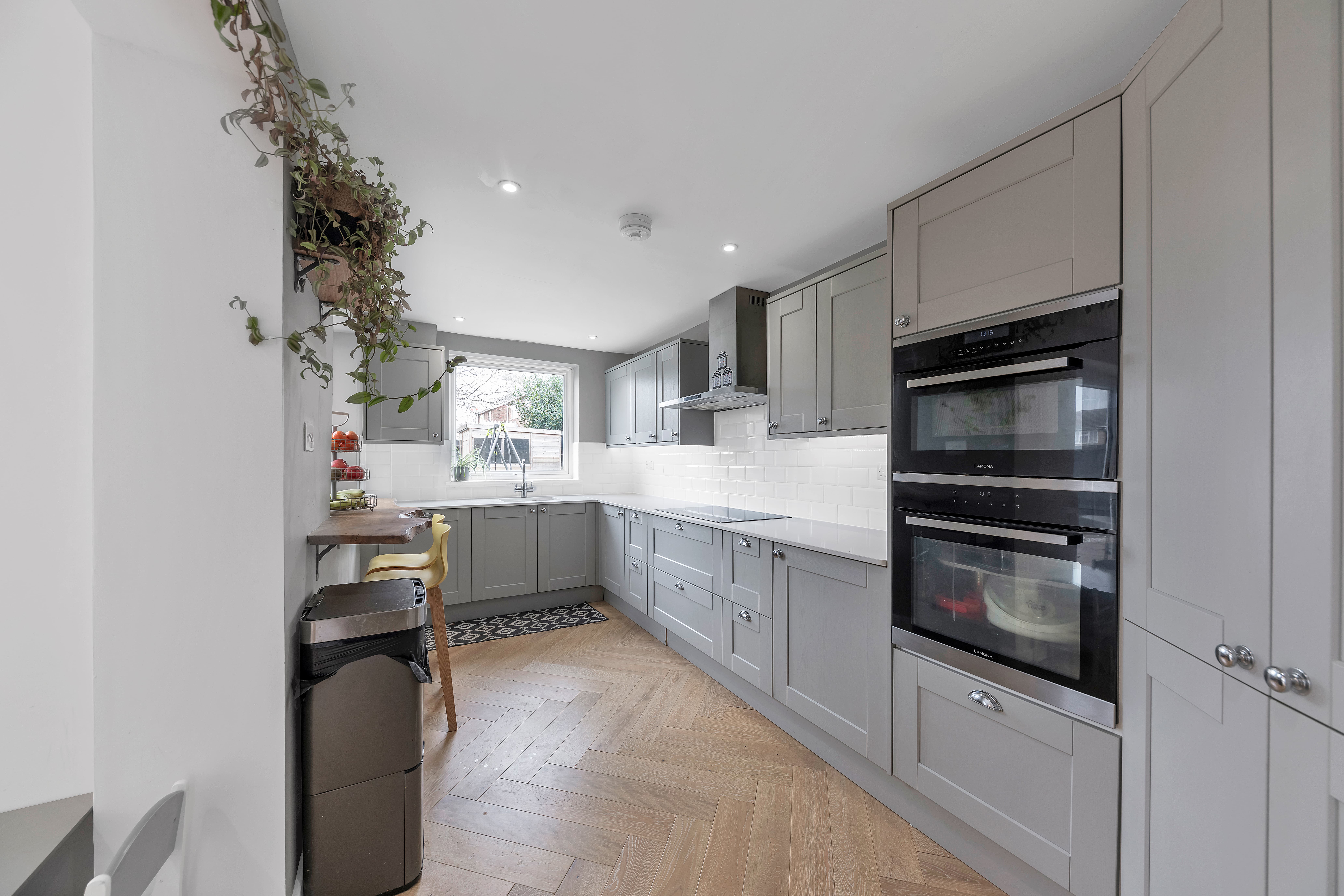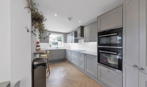 The beautifully refitted kitchen/breakfast room is equally an excellent size, enjoying windows to a dual aspect, parquet wood flooring, inset lighting, an extensive range of modern base and wall units, quartz worktops, a beautiful breakfast bar, tiled splashbacks, an integrated double oven, hob, extractor hood, dishwasher, fridge and freezer, a 4 in 1 filtered hot water tap, and space for small kitchen appliances. The utility room provides further storage, access to a cloakroom WC, and space for large laundry appliances.
