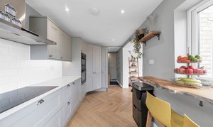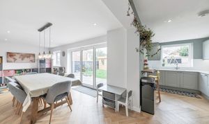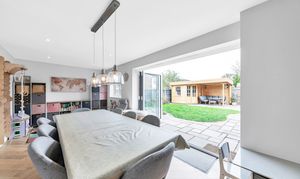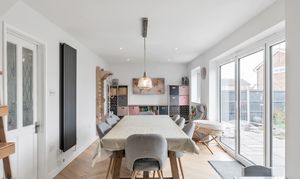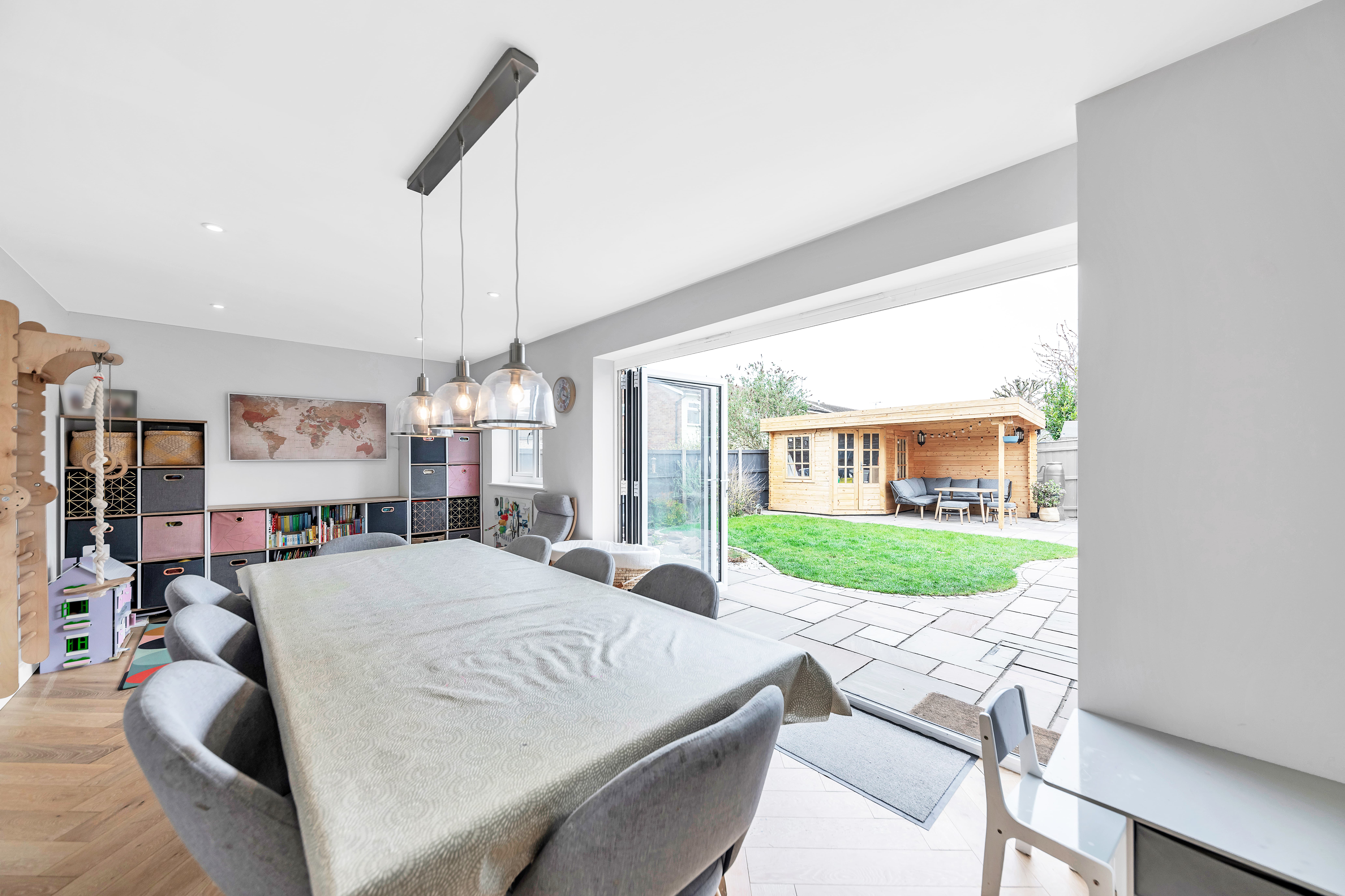 The dining room is accessed via a large archway from the kitchen, giving the space a wonderfully open-plan feel. It benefits from a window and bi-fold doors out onto a garden terrace, parquet wood flooring, inset and pendant lighting, and space for a large dining setting and storage furniture.