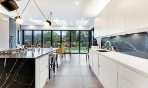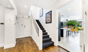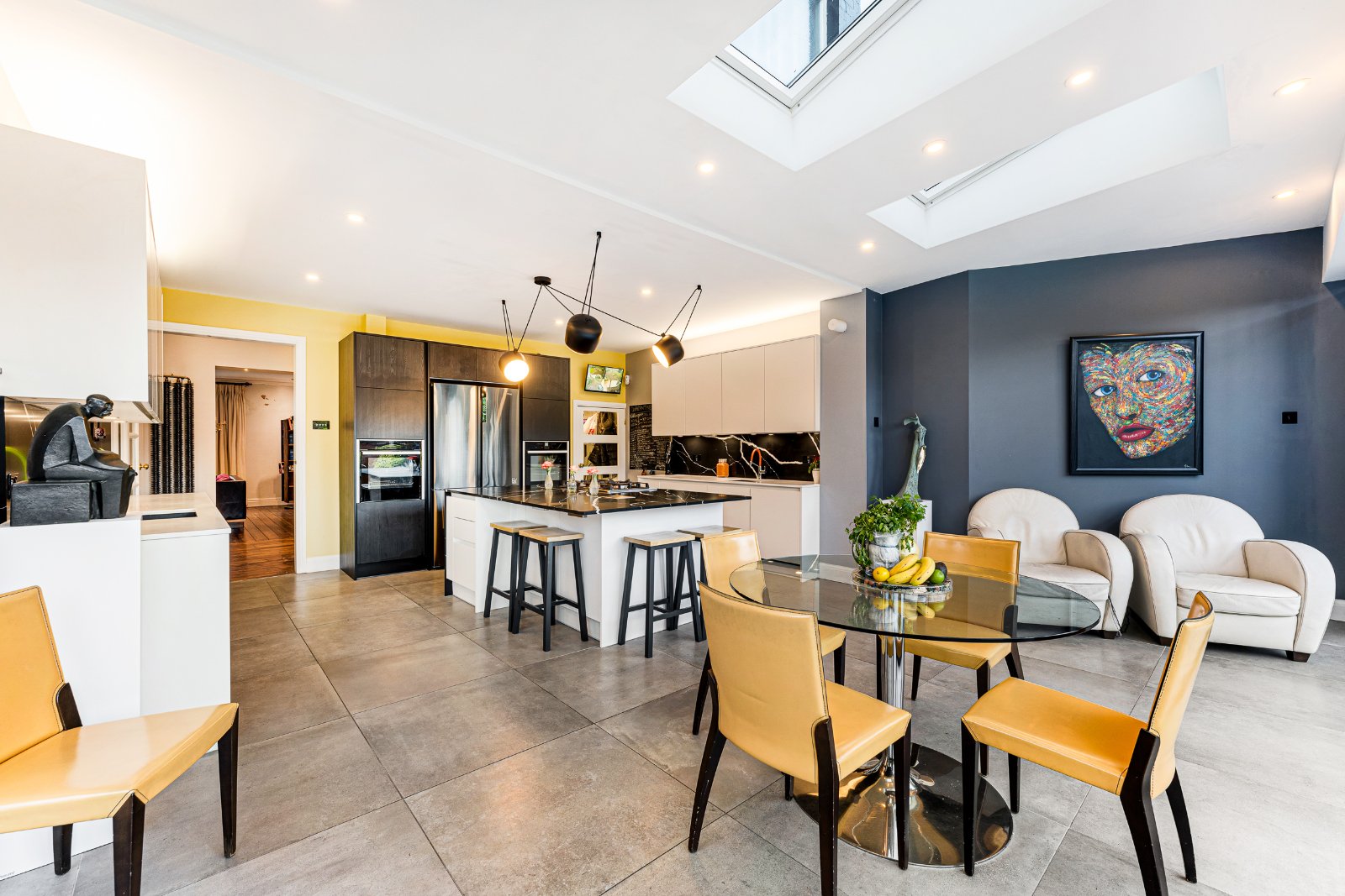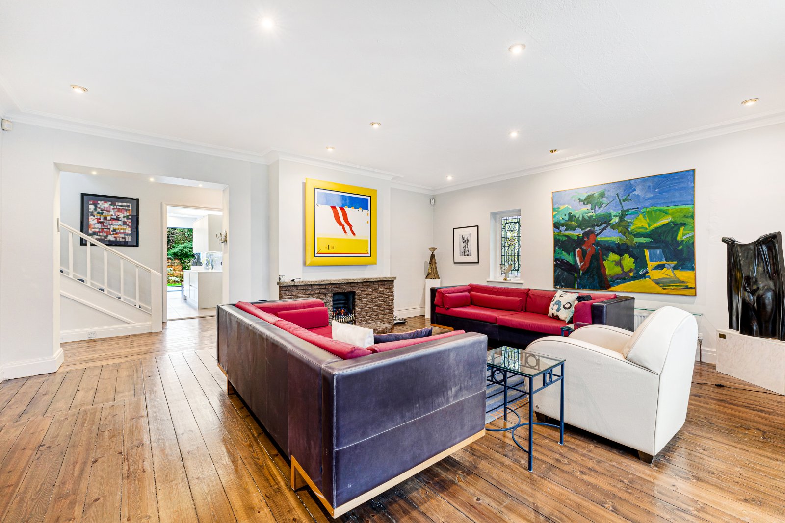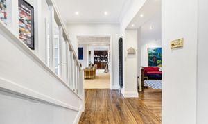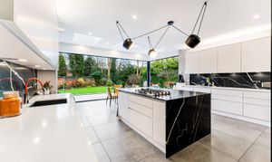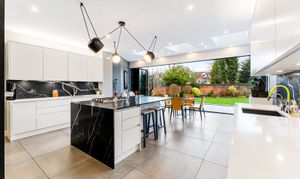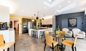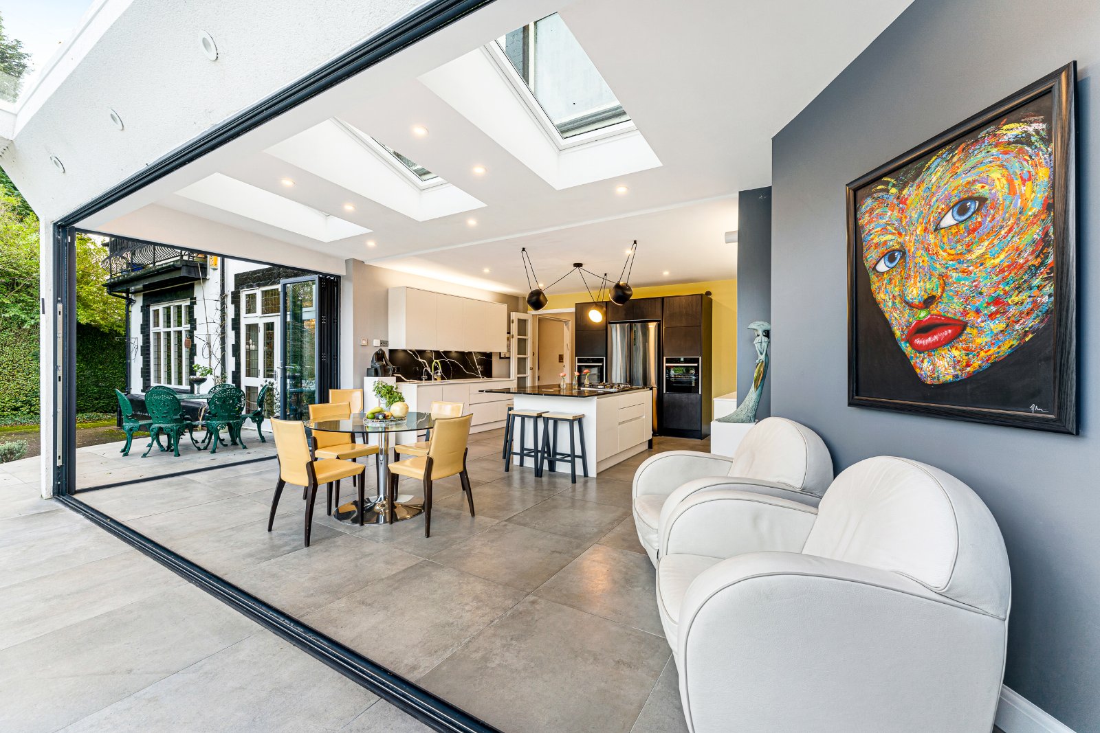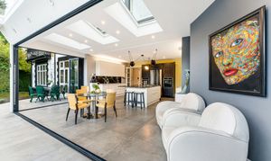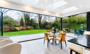 The ground floor is arranged around a welcoming entrance hall leading to bright, well-proportioned reception rooms. The main lounge is a comfortable and relaxing space, while the second reception room provides an ideal open-plan area for dining and entertaining, opening directly onto the gardens. The contemporary kitchen is a true highlight, featuring full-width bi-folding doors that create a seamless flow between inside and out. A guest WC completes this level.